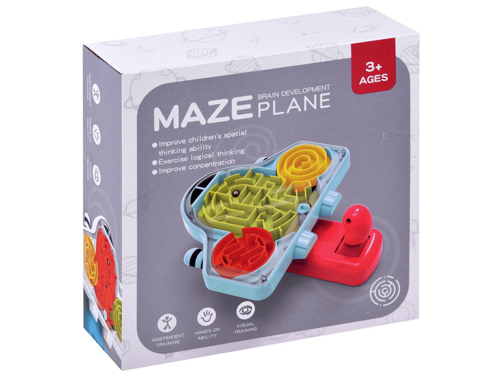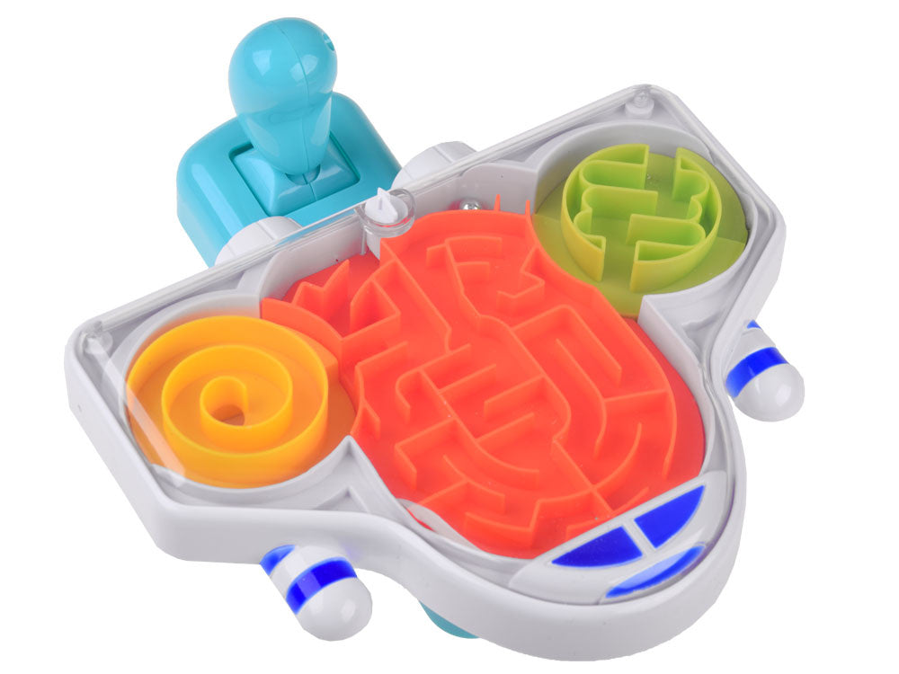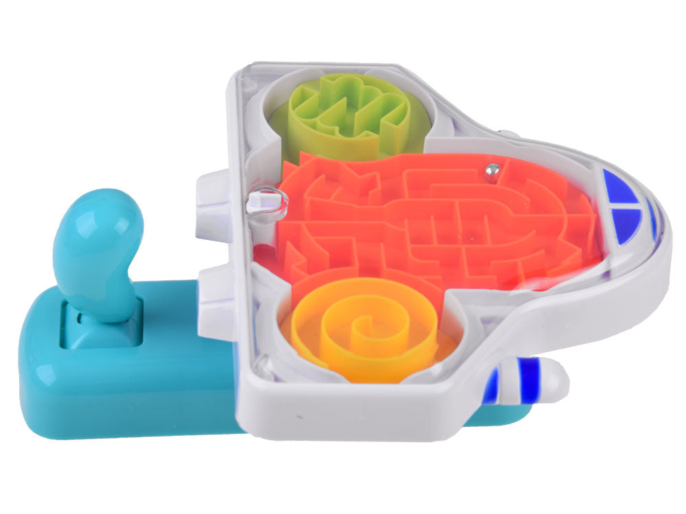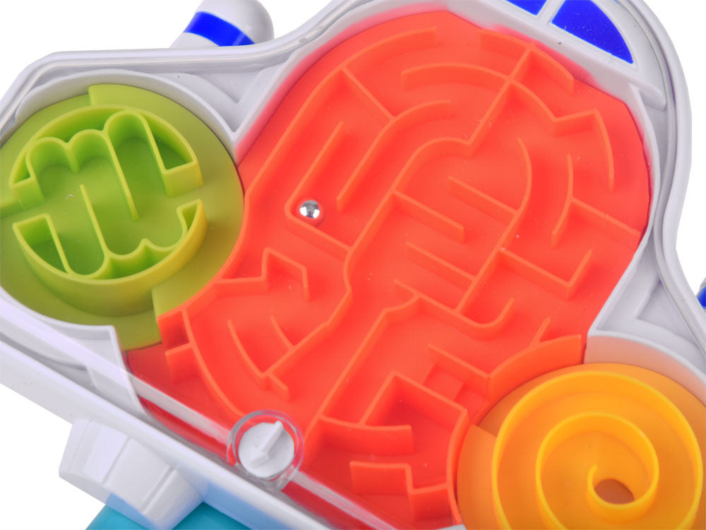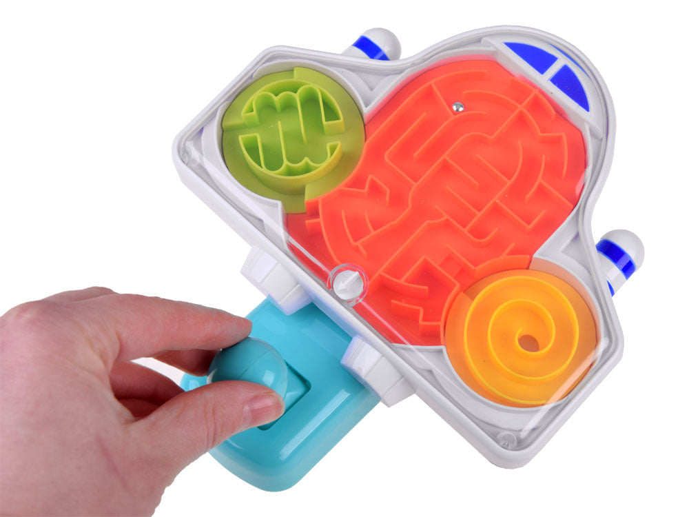 Kosminės raketos formos labirintas patiks kiekvienam mažajam kosmonautui. Žaislas turi vairalazdę kamuoliukui valdyti. Laive uždarytas metalinis kamuoliukas turi įveikti labirintą iš žalio lauko per oranžinį ir pasiekti geltoną zoną, o tada atvirkščiai. Puikus žaidimas, leidžiantis lavinti koncentraciją, rankų miklumą ir kantrybę.