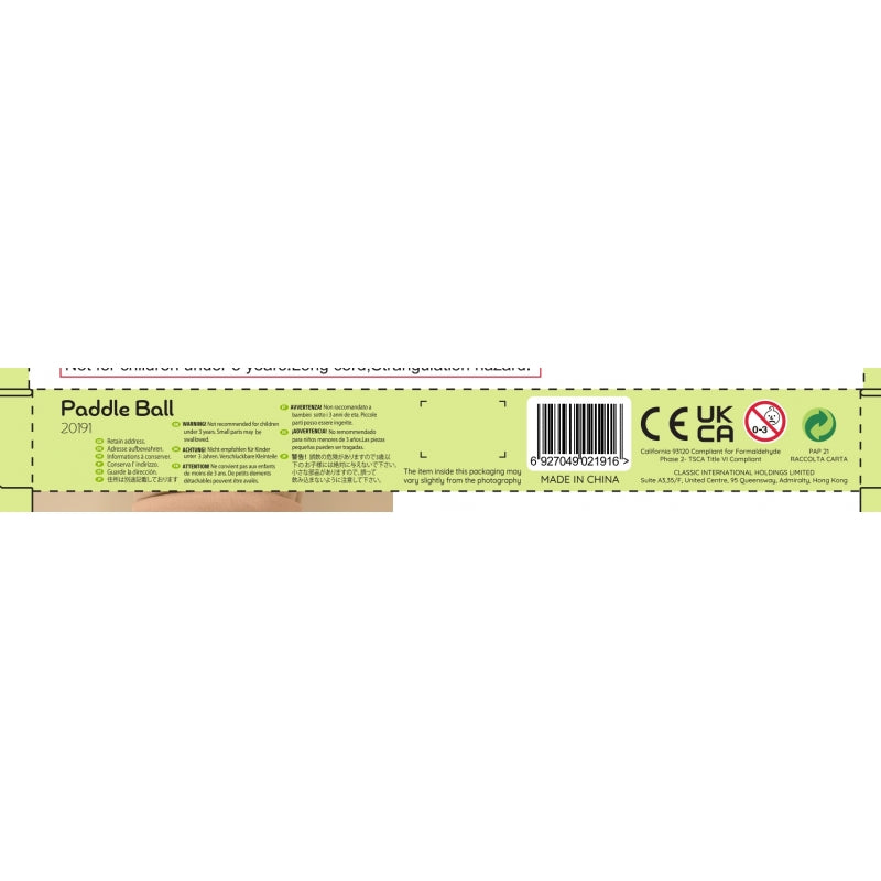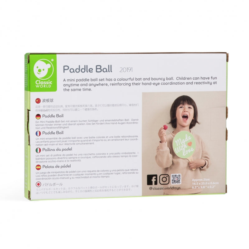 CLASSIC WORLD prekės ženklo "Paddle Ball" - tai mielas sportinis žaislas su žavingu padėkliuku ir šokinėjančiu kamuoliuku. Vaikai gali žaisti bet kur ir bet kada, stiprinti rankų ir akių koordinaciją bei reaktyvumą ir formuoti sveiką kūną. Ekologiški žaislai jau skirti patiems mažiausiems vaikams ir yra pagaminti iš visiškai natūralių, biologiškai suyrančių ir hipoalerginių medžiagų, todėl yra 100 % saugūs ir nekenksmingi ne tik pačiai aplinkai, bet ir jūsų mažyliui.