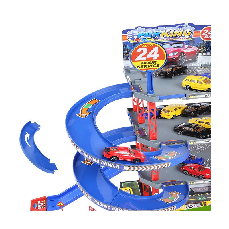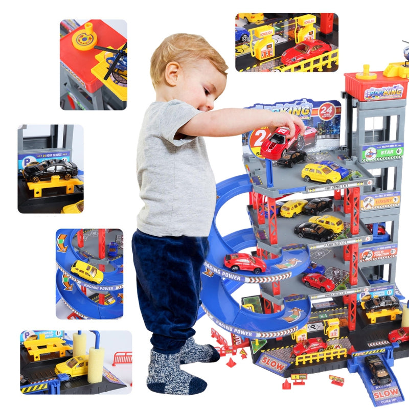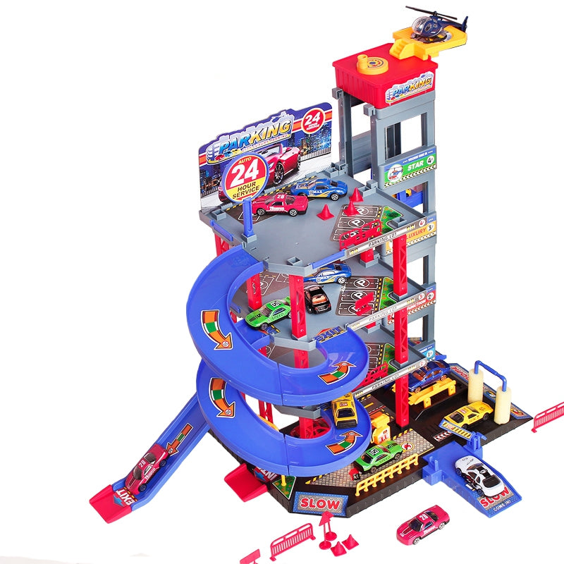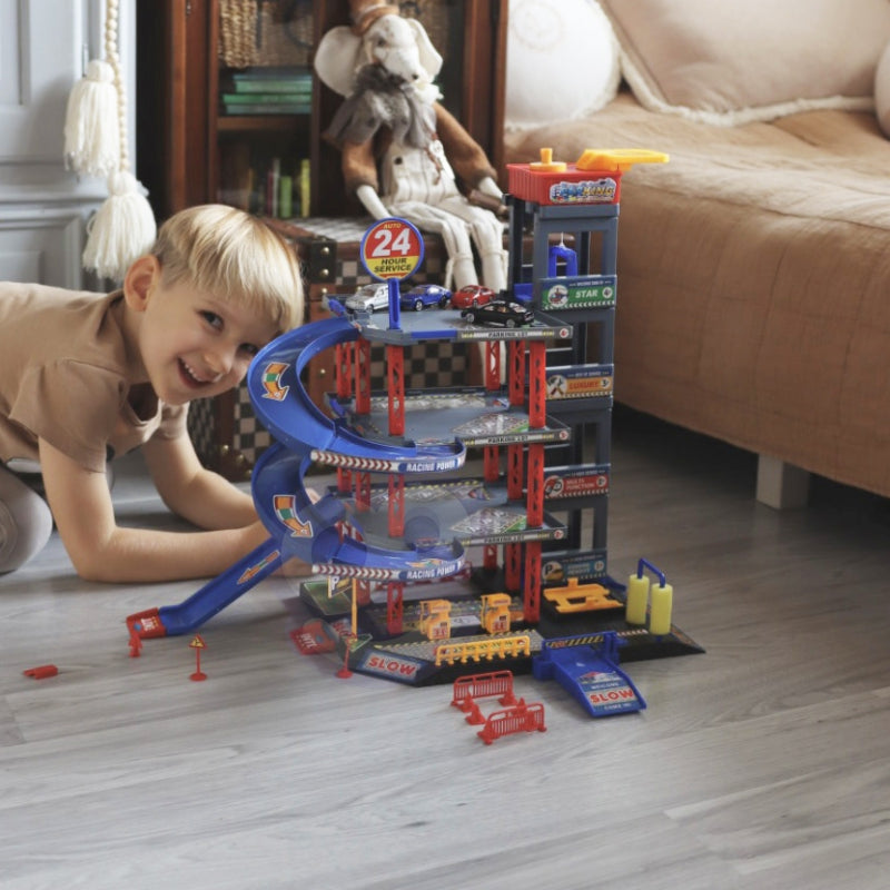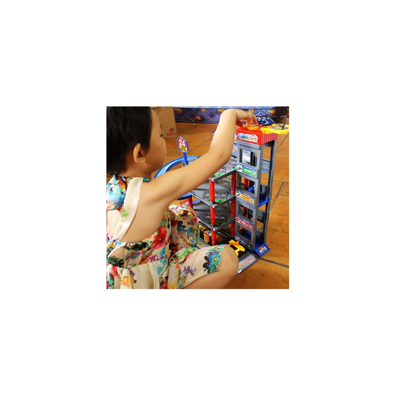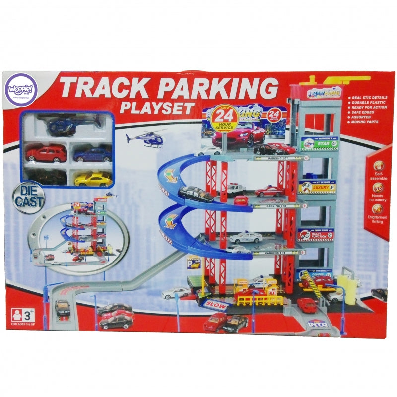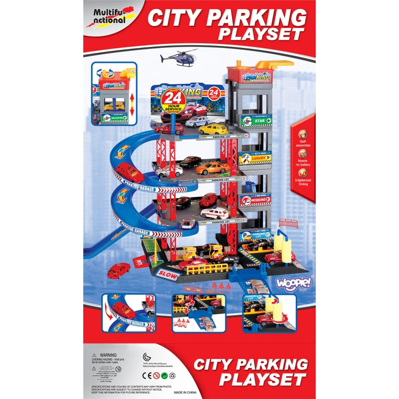Sensacinga WOOPIE daugiaaukščių automobilių stovėjimo aikštelė su degaline, liftu, plovykla, autoservisu ir sraigtasparnių aikštele pažadins kiekvieno greito automobilio ir automobilių mėgėjo vaizduotę. Rampa turi būti pakelta, kad transporto priemonė įvažiuotų į automobilių stovėjimo aikštelę. Lifto (kuris juda rankomis) dėka transporto priemonės gali judėti tarp aukštų. Greitas automobilių nusileidimas iš atskirų lygių leidžia specialiai, vingiuotai nusileisti. Garaže taip pat yra automobilių plovykla ir degalinė. Be to, į komplektą įeina 4 metaliniai automobiliai ir sraigtasparnis.