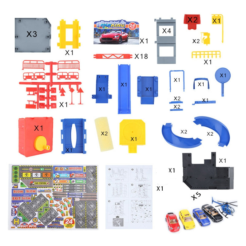 - rinkinyje: 4 automobiliai ir sraigtasparnis, stovėjimo elementai, kelio ženklai, kūgiai, įvažiavimo į automobilių stovėjimo aikštelę elementai, liftas ir lipdukai,