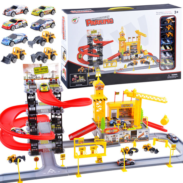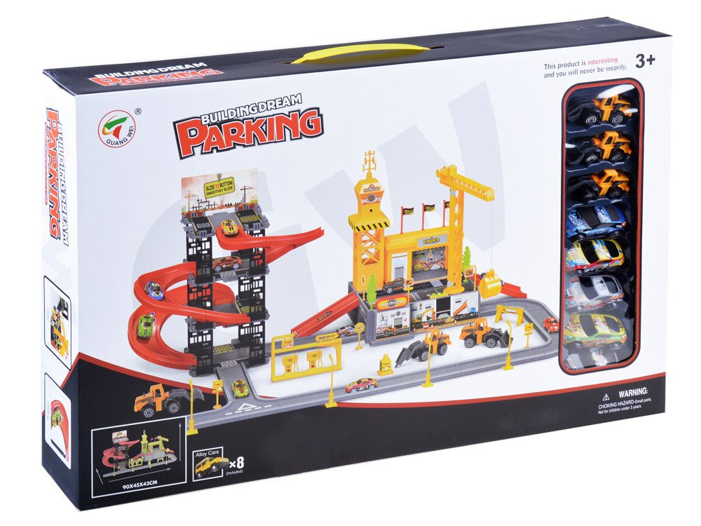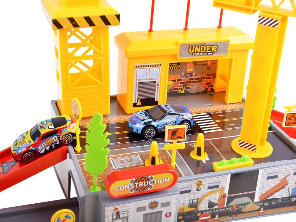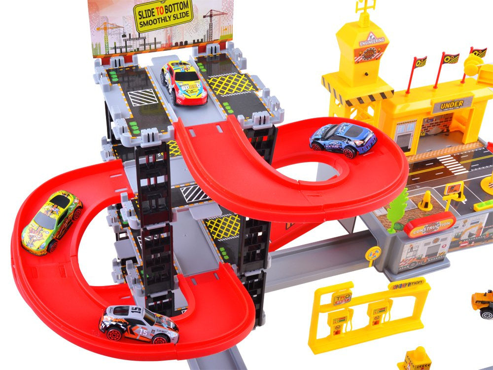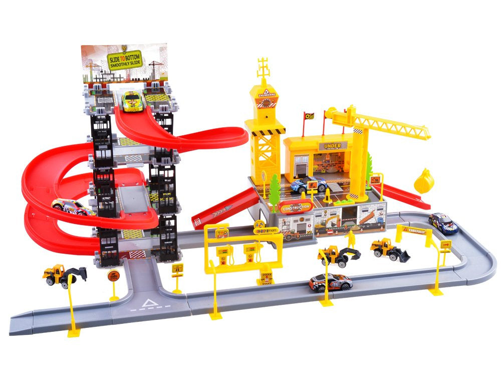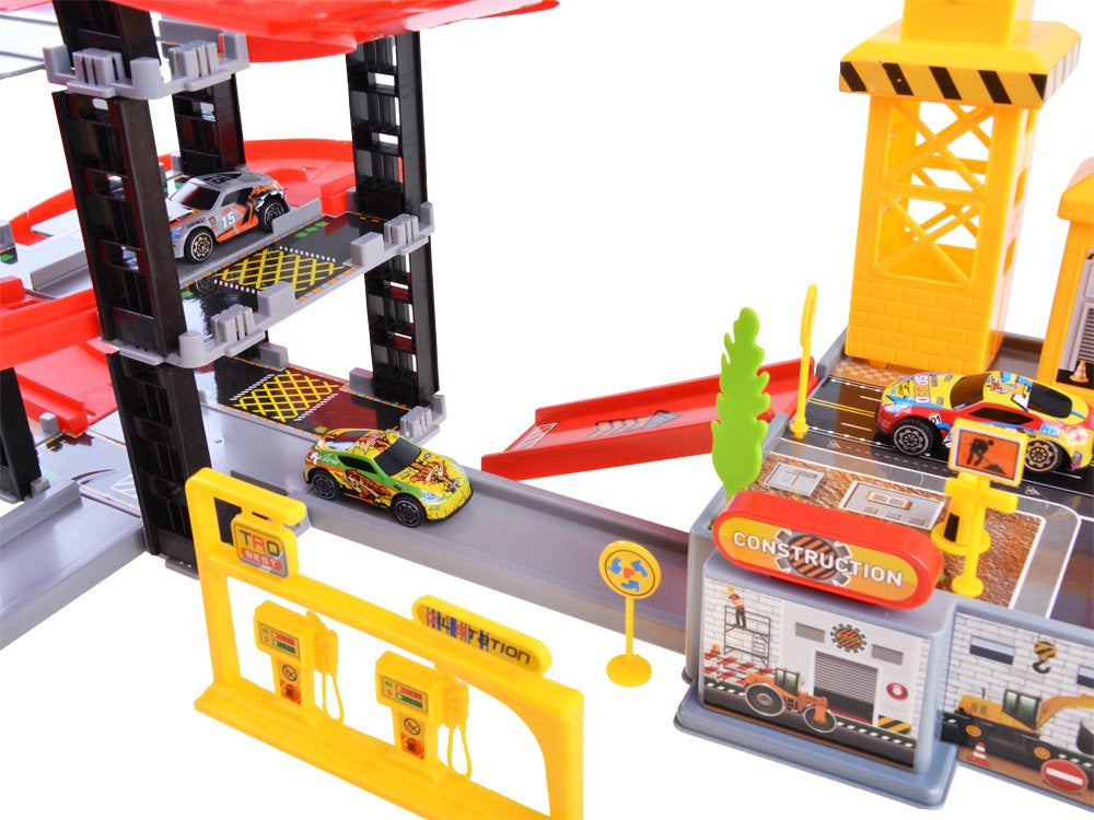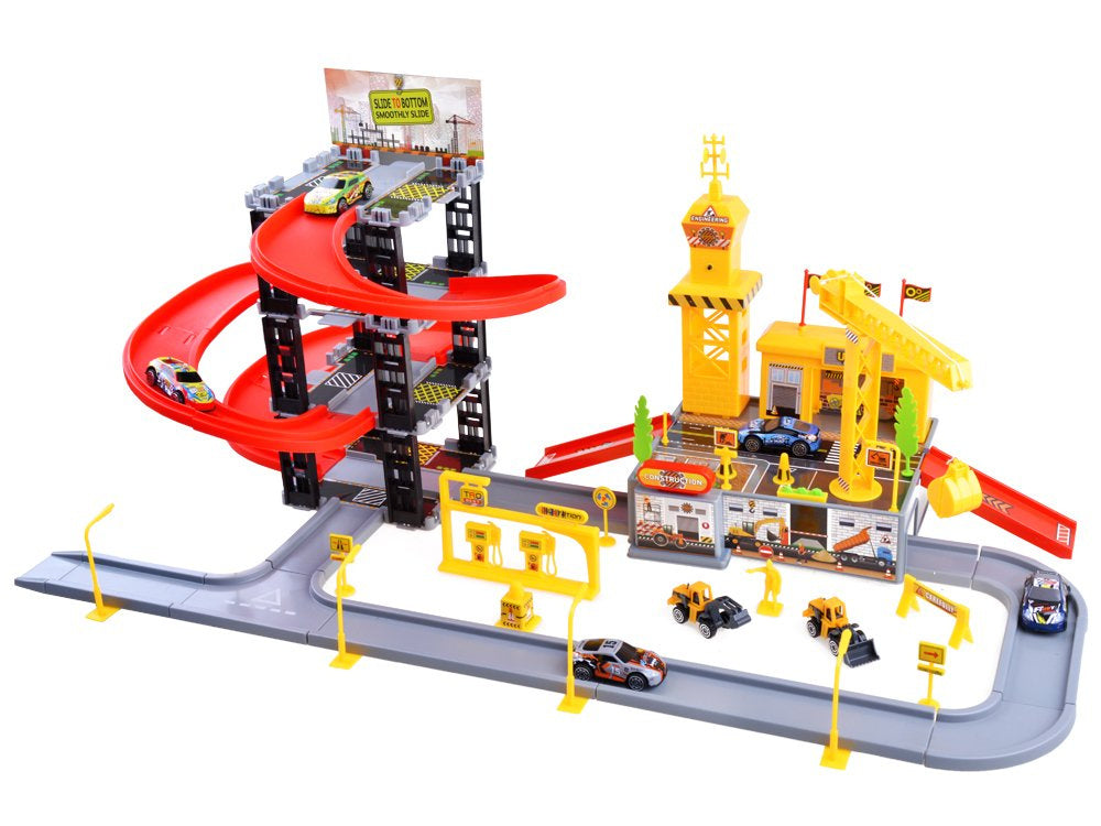Daugelio elementų rinkinys, skirtas automobilių stovėjimo aikštelei su statybų aikštele statyti, kiekvienam vaikui suteiks daug kūrybinių pramogų. Keturių lygių automobilių stovėjimo aikštelėje, kurioje įrengti išvažiavimai automobiliams, taip pat yra stovėjimo vietos, degalinė ir kelio ženklai. Ją su statybų pirštu jungia platus automobiliams skirtas kelias. Žaidimas su tokiu rinkiniu suteiks daug emocijų ir pozityviai leis laiką.
