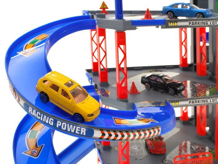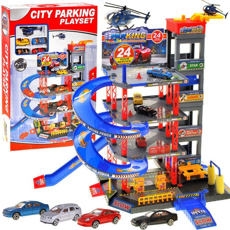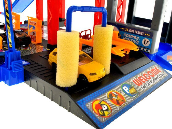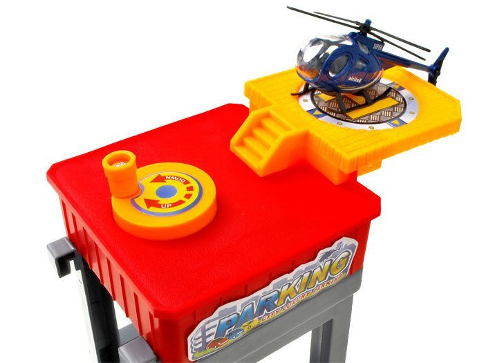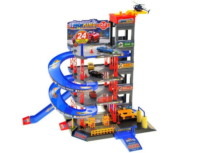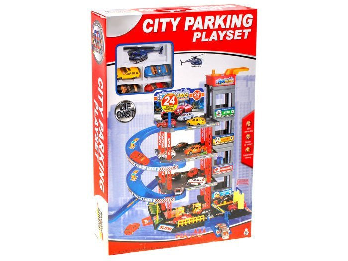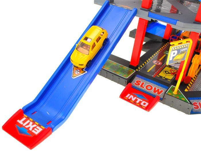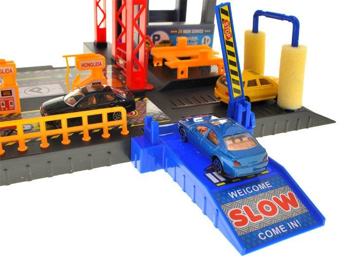 Sensacinga daugiaaukštė automobilių stovėjimo aikštelė su degaline, liftu, keltuvu, automobilių plovykla, autoservisu ir sraigtasparnių aikštele. Norint įvažiuoti į automobilių stovėjimo aikštelę, reikia pakelti rampą. Naudojantis liftu automobilius galima vežti į atskirus automobilių stovėjimo aikštelės aukštus. Jei jūsų automobilis nešvarus, galite nuvažiuoti į plovyklą ir jūsų automobilis vėl bus kaip naujas. Jei pritrūko benzino, jo galite įsipilti degalinėje. Rinkinys supakuotas į labai gražią spalvingą dėžutę, puikiai tinkančią dovanoms.