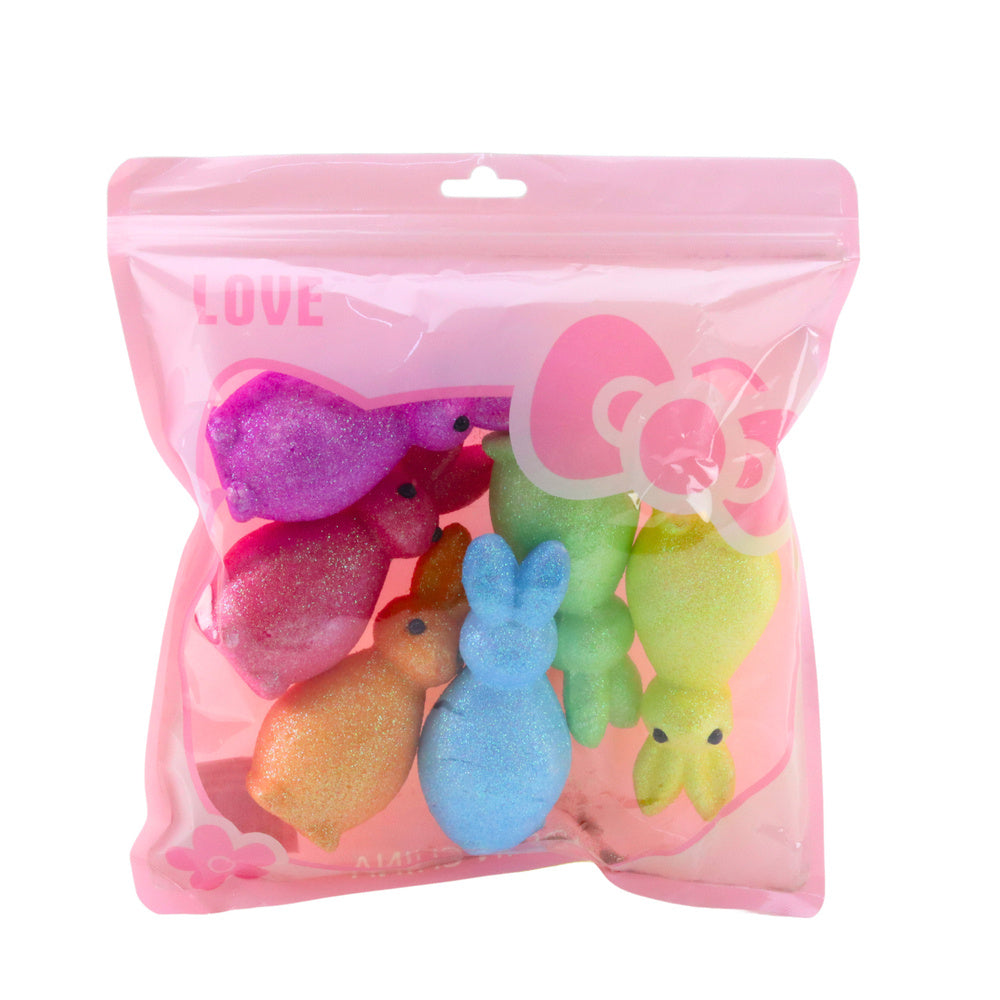 - 6 polistireniniai blizgučiais padengti kiškučiai (geltoni, mėlyni, rožiniai, žali, oranžiniai, violetiniai)