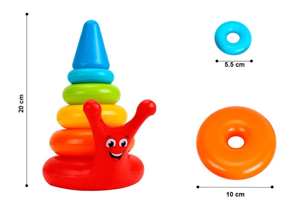 Linksma vaivorykštės spalvų piramidė – žaislas, kuris puikiai veikia mažylio vystymąsi. Jį sudaro skirtingų spalvų ir dydžių žiedai. Žaislo viršuje yra kūgis, kuris uždaro piramidę. Pagrindas yra sraigės formos - su gražiomis ausimis, uodega ir ryškia šypsena.
