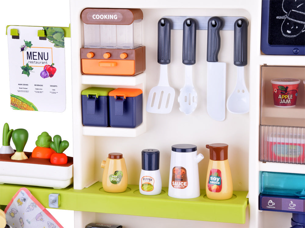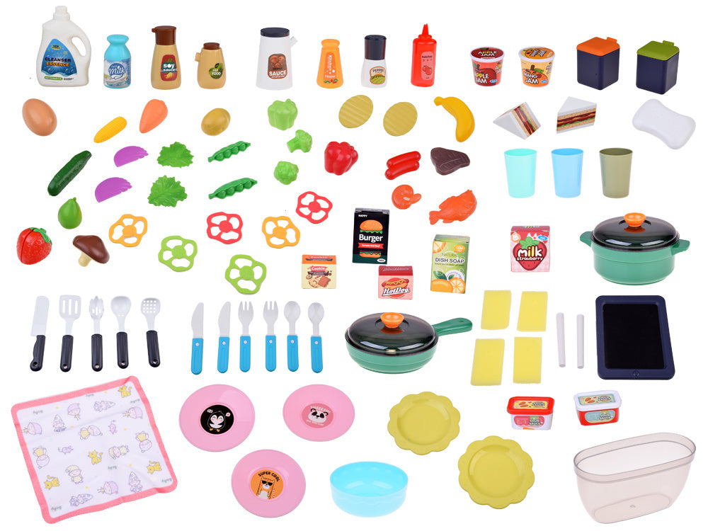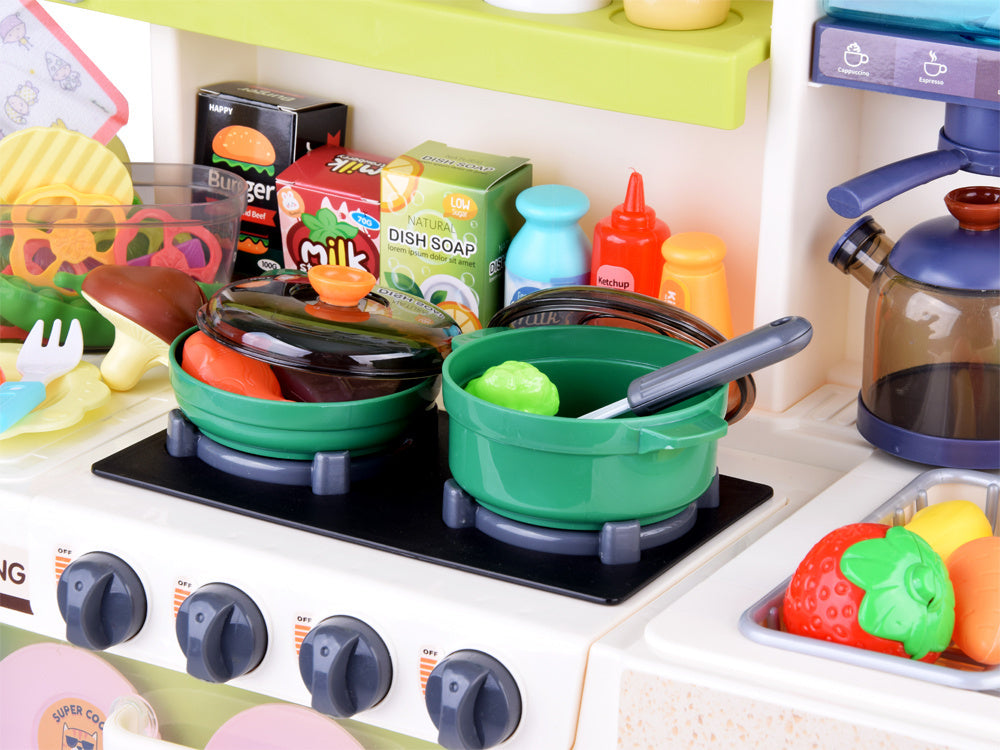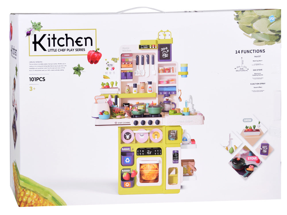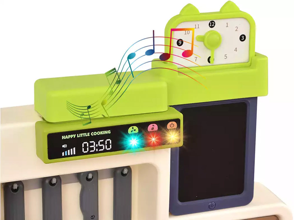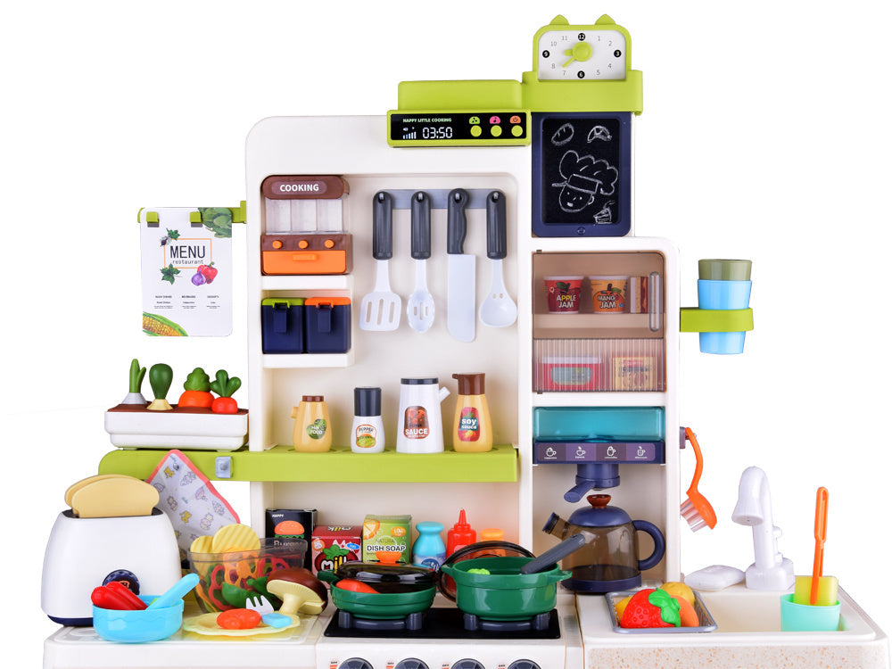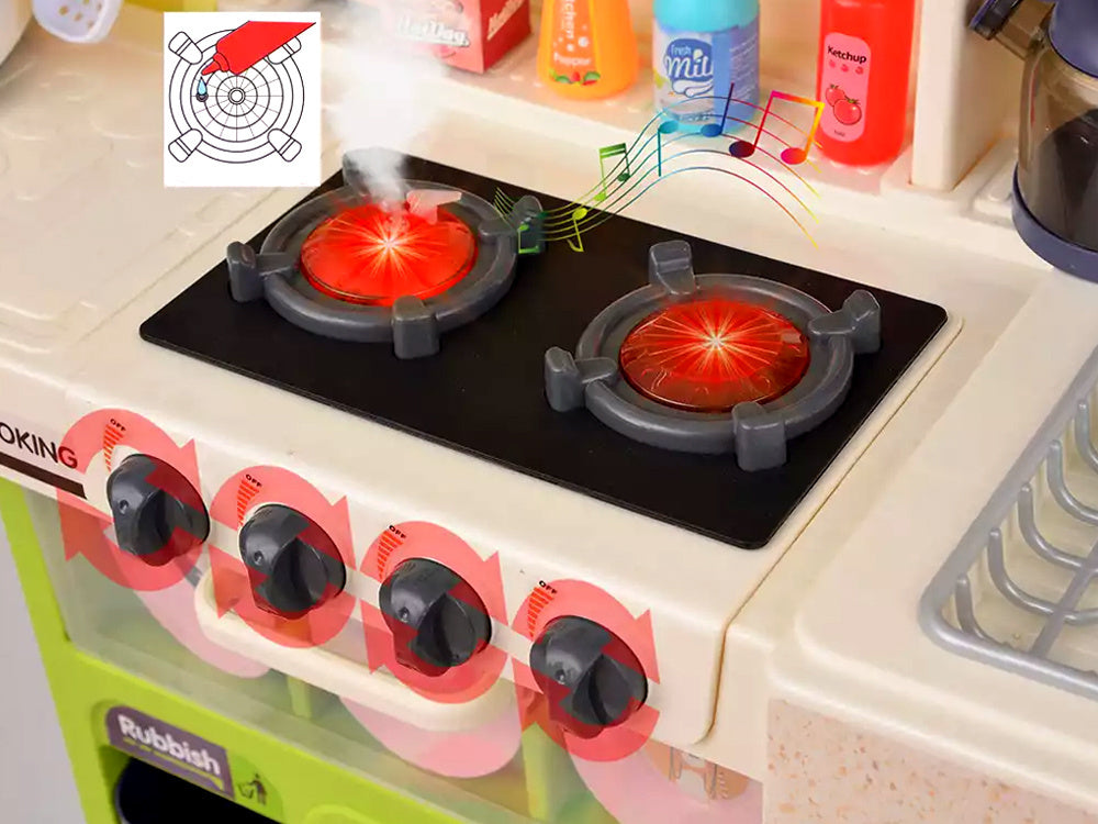 Interaktyvi virtuvė su šviesos, garso efektais, garais ir vandens čiaupu - puikus žaislas mažiesiems virėjams! Dėl tikroviškų funkcijų vaikai gali pasijusti tikrais virėjais. Viena iš įdomiausių funkcijų - iš puodų kylančių garų efektas, imituojantis maisto gaminimą ant tikro degiklio. Be to, dėl čiaupo su vandeniu vaikai gali „plauti“ puodus, kai baigia virti. Daugiafunkcinė, interaktyvi prislopintų spalvų virtuvė yra būtina kiekvieno vaiko žaidimo dalis! Ši virtuvė su daugybe judančių ir atidaromų elementų išpildys kiekvieno mažojo virėjo svajonę ir kartu neleis jam atsidurti tikroje virtuvėje.