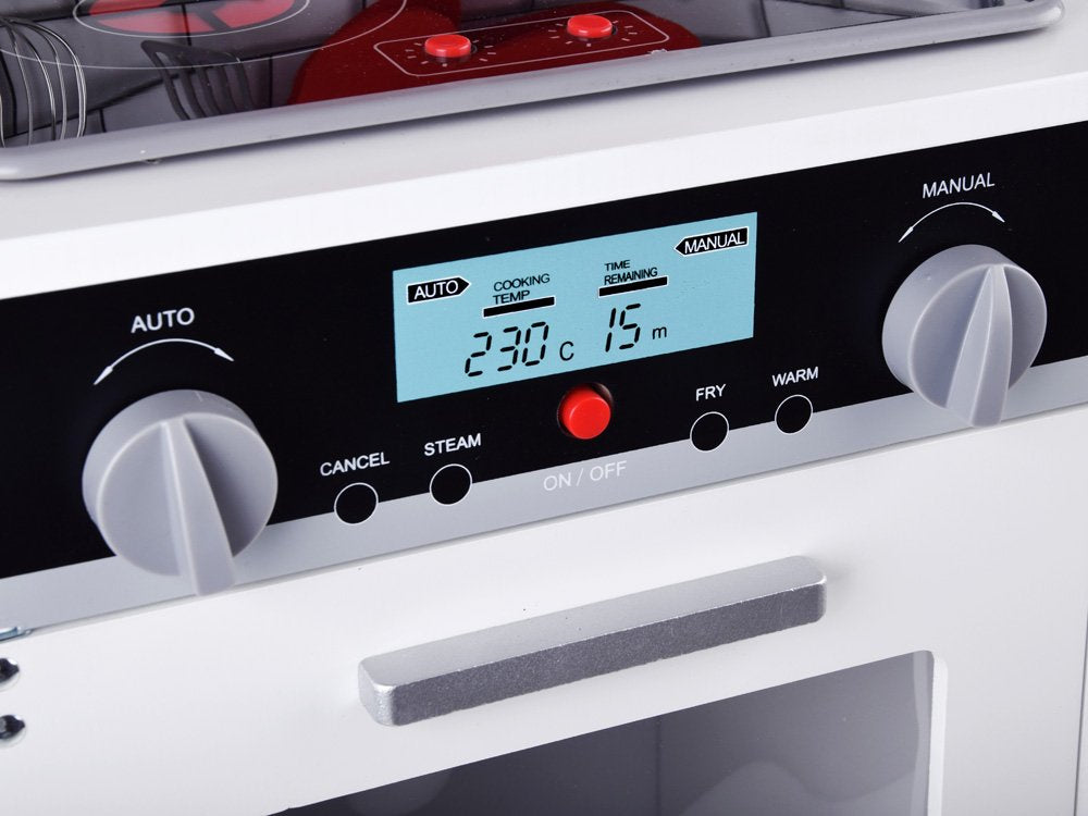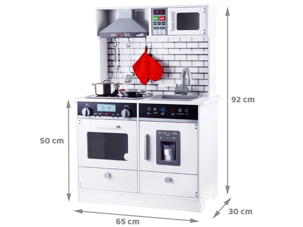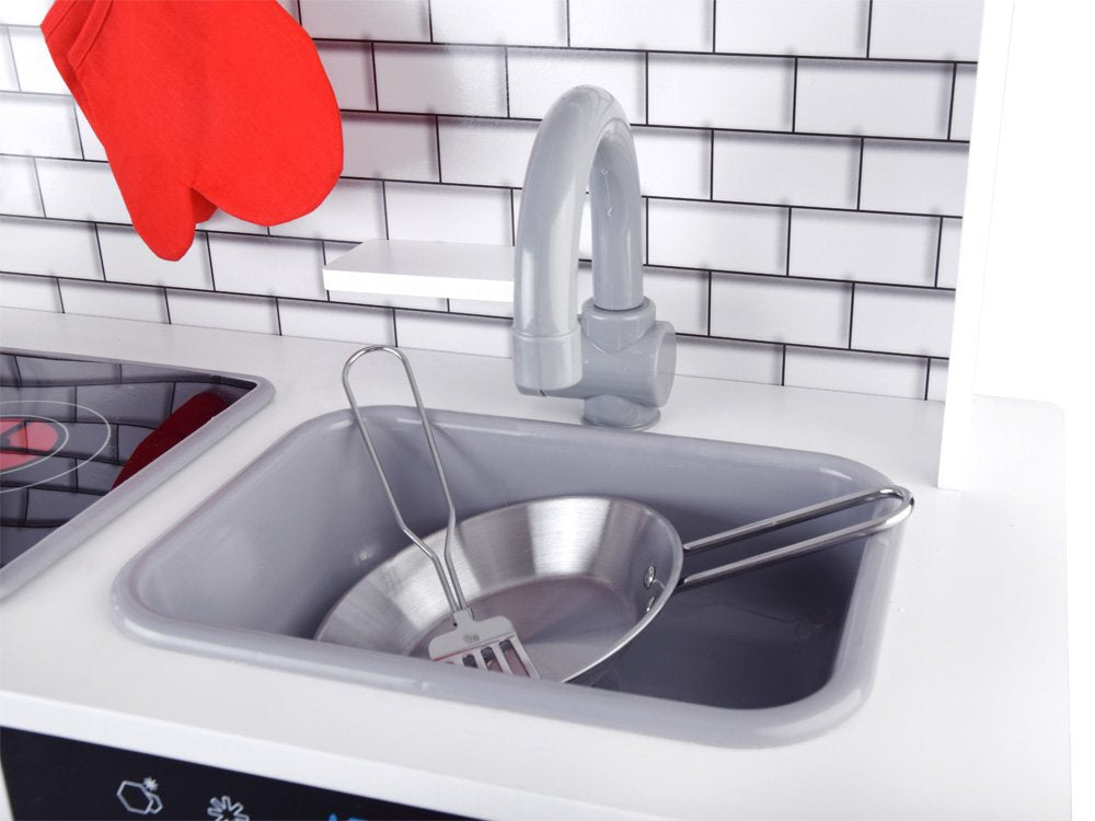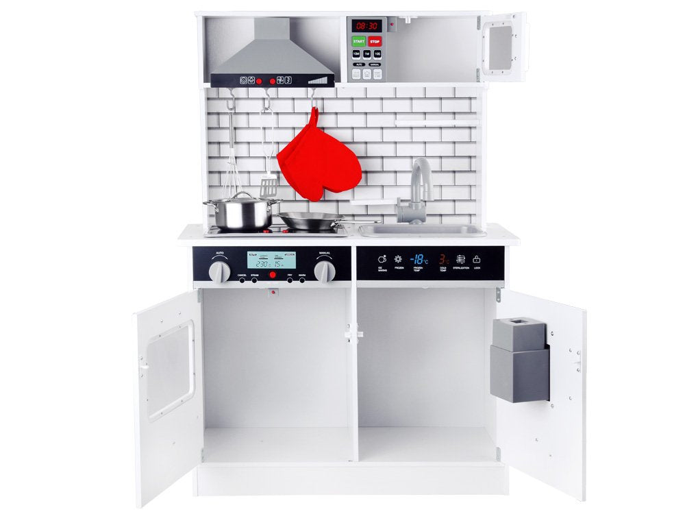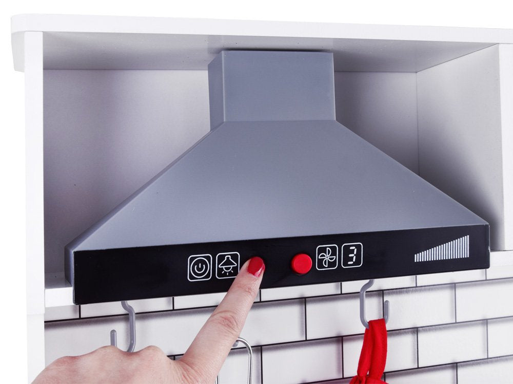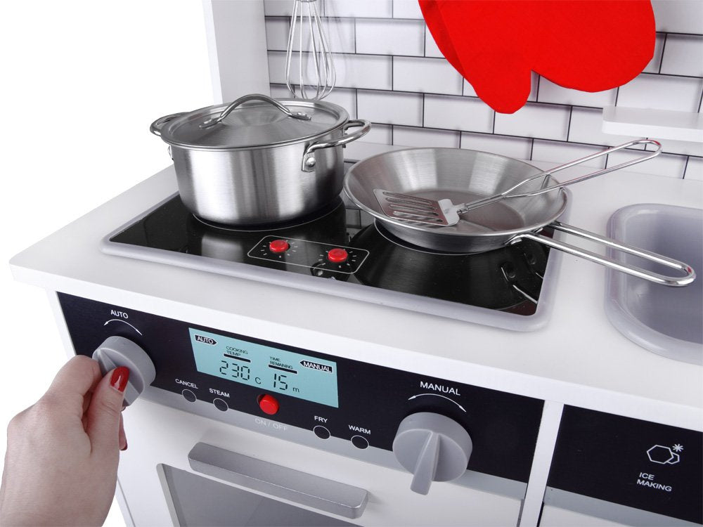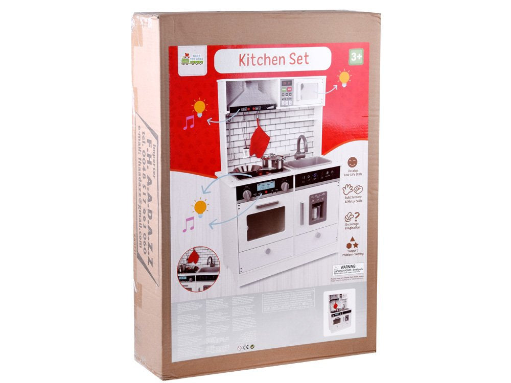 Medinė, didelė virtuvė su apšvietimu, garso efektais ir priedais patiks kiekvienam mažajam virėjui. Pačių paruošti patiekalai lėlėms ir meškiukams tikrai bus skaniausi pasaulyje, be abejo, šeimos nariai taip pat džiaugsis, kai ragaus vaikų paruoštą vakarienę.