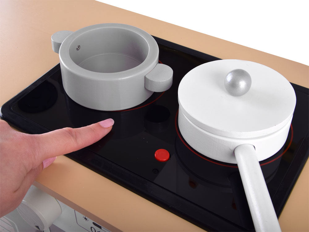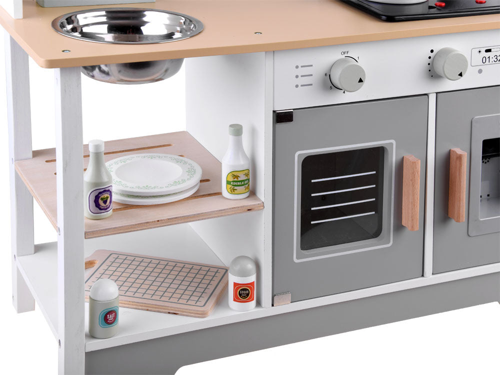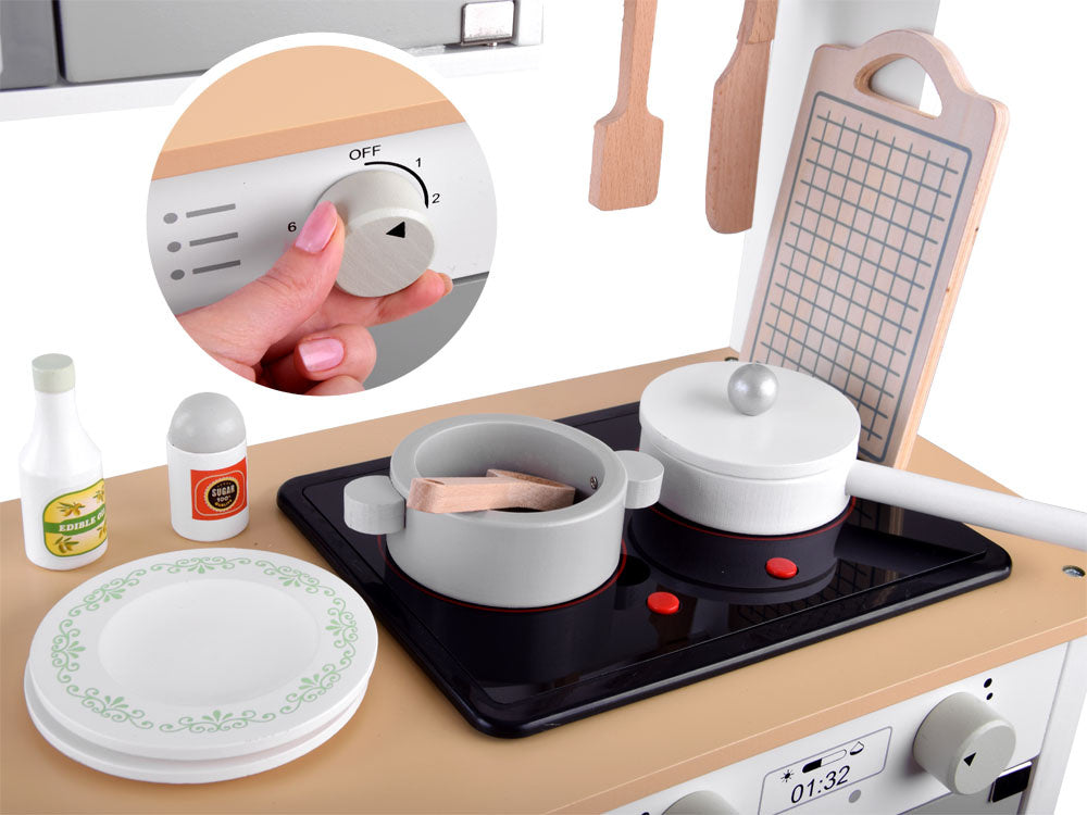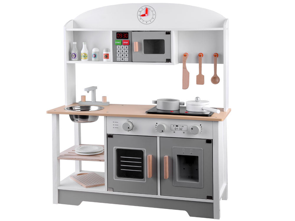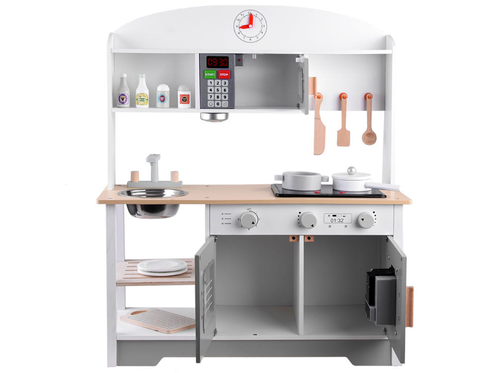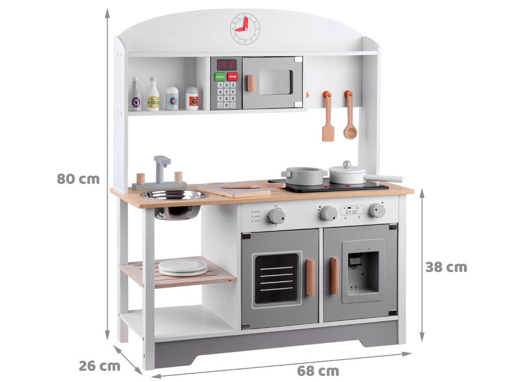 Didelė medinė vaikiška virtuvė su priedais, suteiks daug kūrybinių pramogų bet kuriam mažajam šeimininkui. Vaikai atidžiai stebi suaugusiuosius, kad vėliau savo namų viziją galėtų perkelti į žaidimų aikštelę. Virtuvė turi daugybę funkcijų: mikrobangų krosnelę su apšvietimu, apšviestą indukcinę kaitlentę su maisto gaminimo ir kepimo garsais arba vandens dozatorių su šviesos ir garso funkcijomis, todėl žaidimas tampa tikroviškesnis. Medinė viryklė taip pat turi apšvietimą po spintele, kuris ne tik palengvina žaidimą, bet ir suteikia virtuvei elegantiško, modernaus stiliaus.