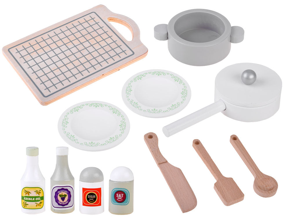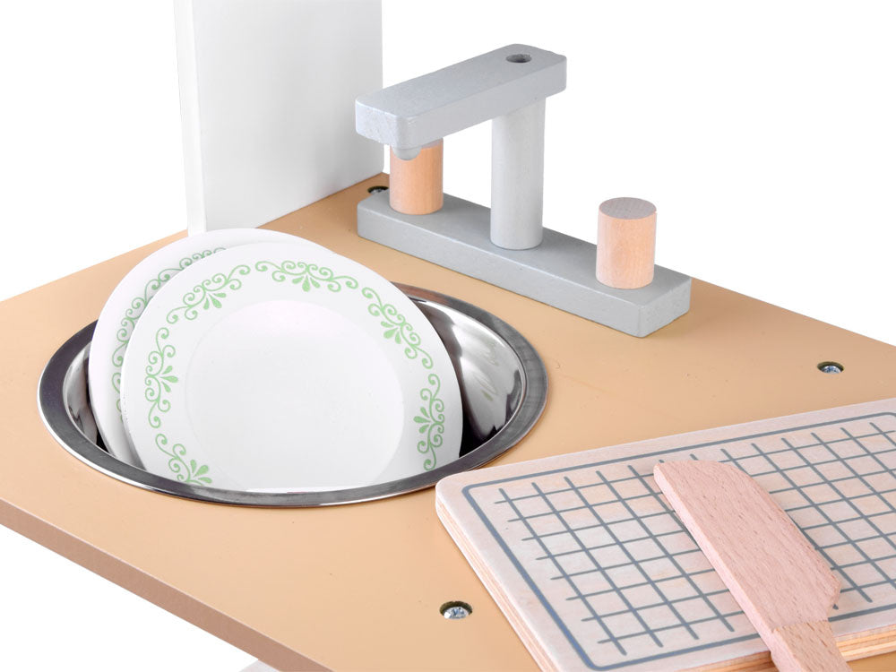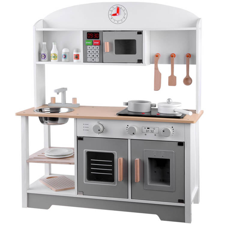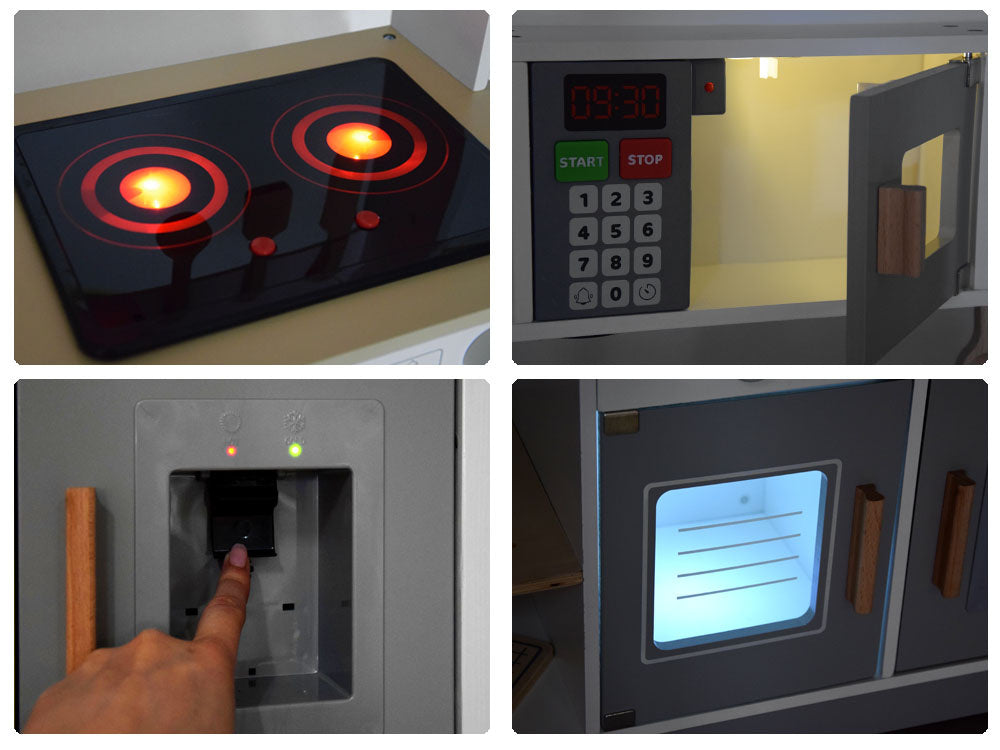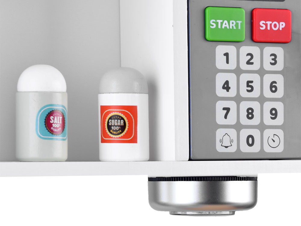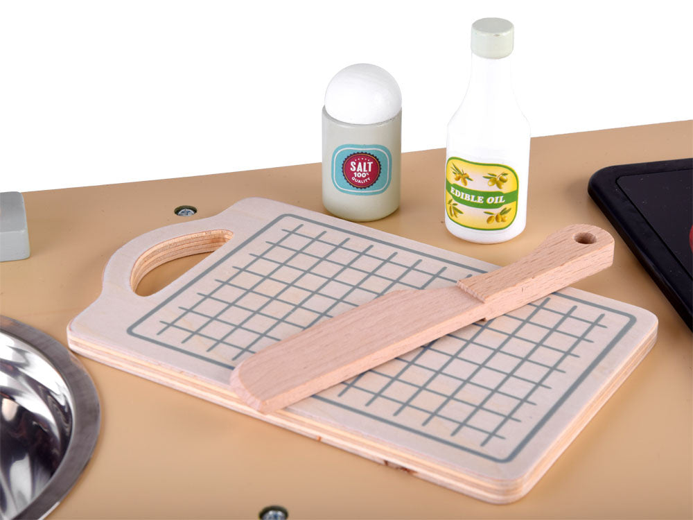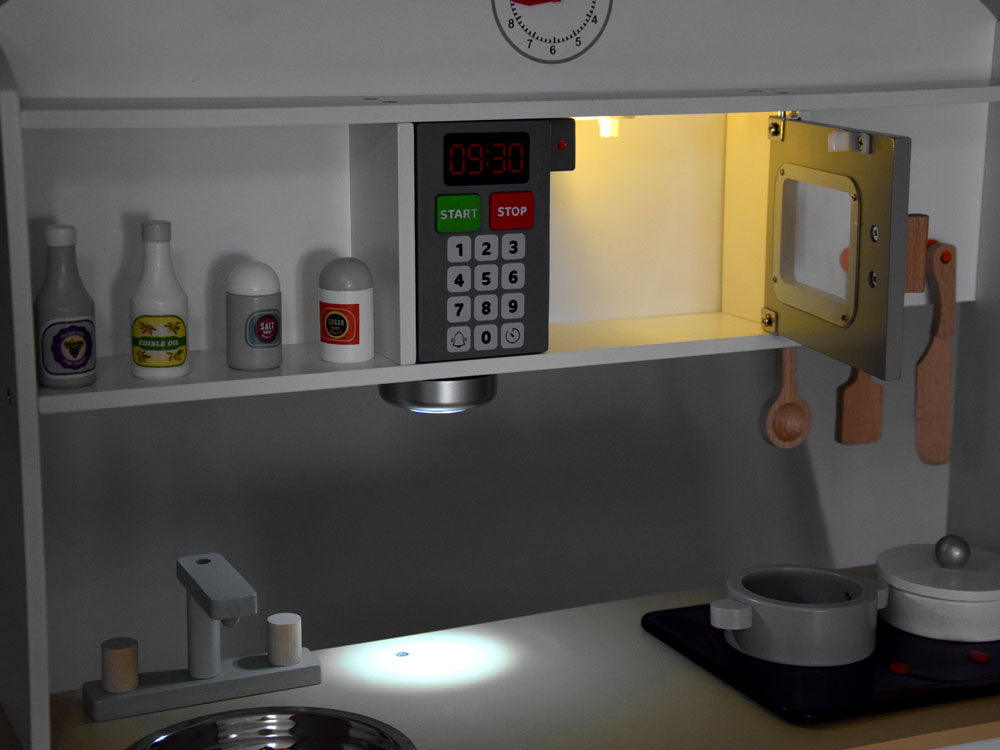 Didelė medinė vaikiška virtuvė su priedais, suteiks daug kūrybinių pramogų bet kuriam mažajam šeimininkui. Vaikai atidžiai stebi suaugusiuosius, kad vėliau savo namų viziją galėtų perkelti į žaidimų aikštelę. Virtuvė turi daugybę funkcijų: mikrobangų krosnelę su apšvietimu, apšviestą indukcinę kaitlentę su maisto gaminimo ir kepimo garsais arba vandens dozatorių su šviesos ir garso funkcijomis, todėl žaidimas tampa tikroviškesnis. Medinė viryklė taip pat turi apšvietimą po spintele, kuris ne tik palengvina žaidimą, bet ir suteikia virtuvei elegantiško, modernaus stiliaus.
