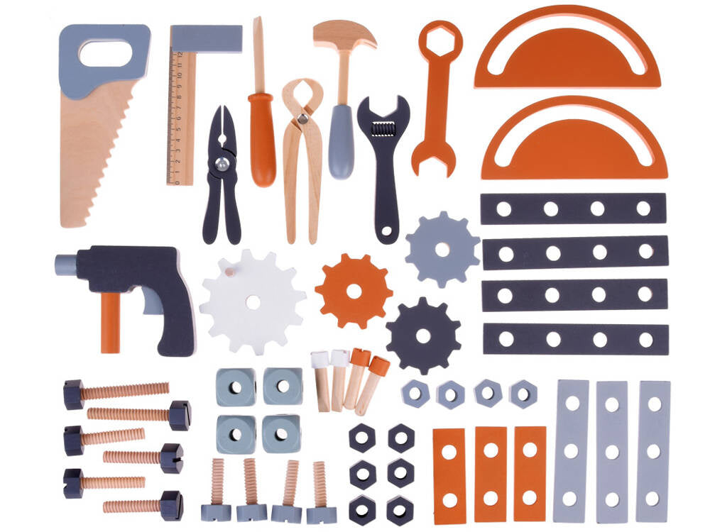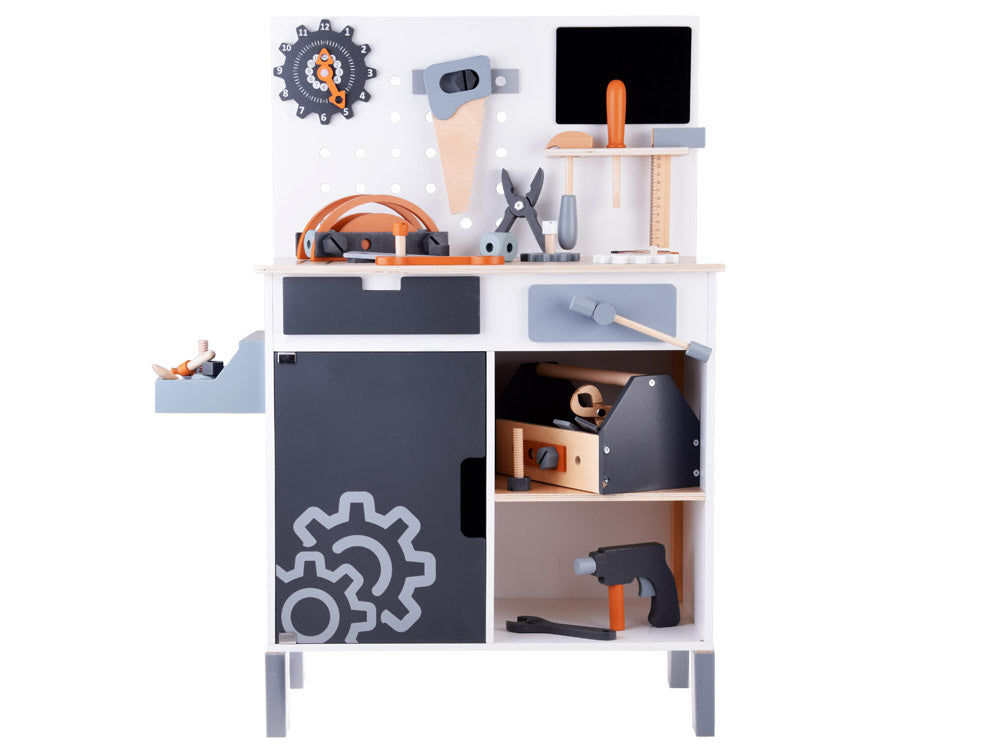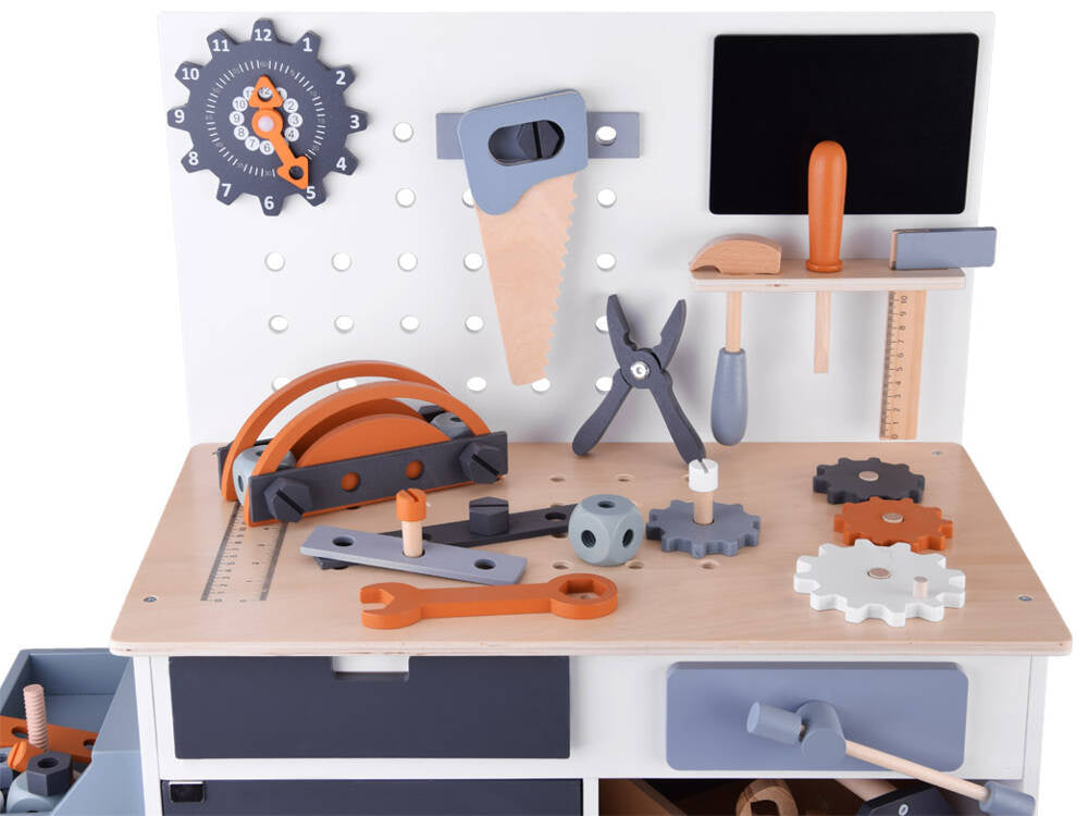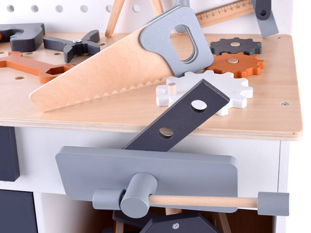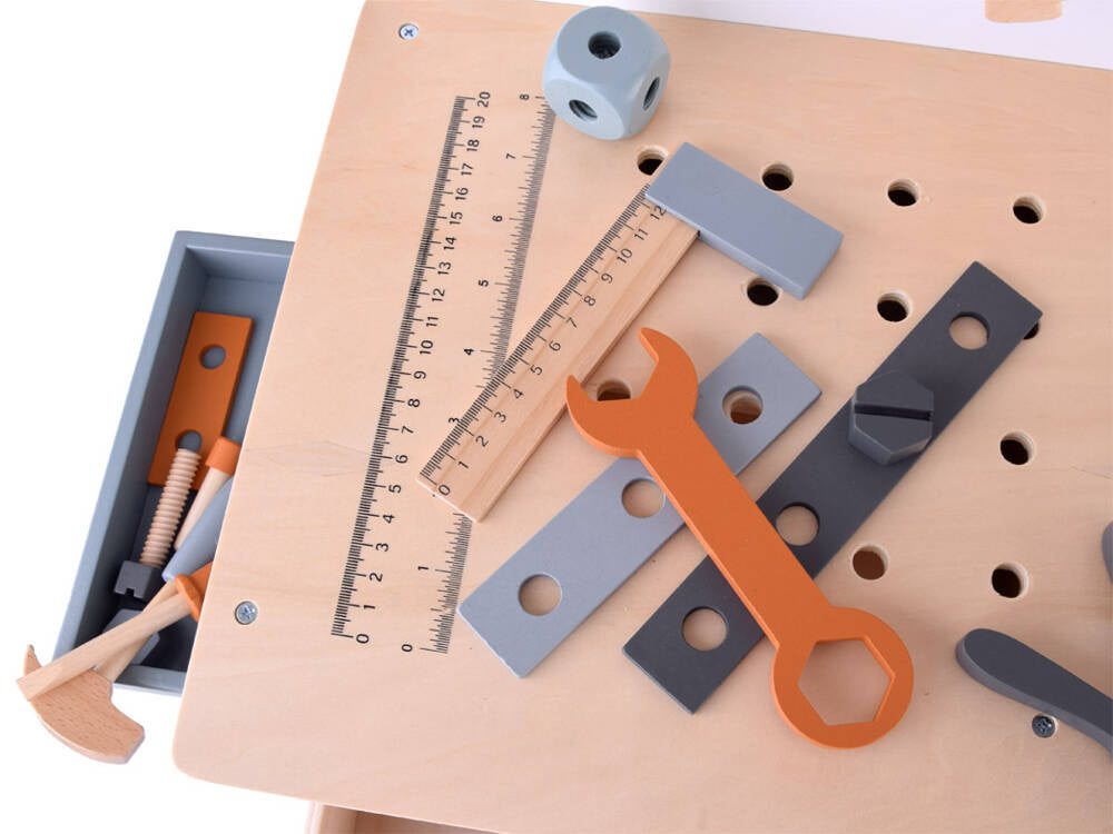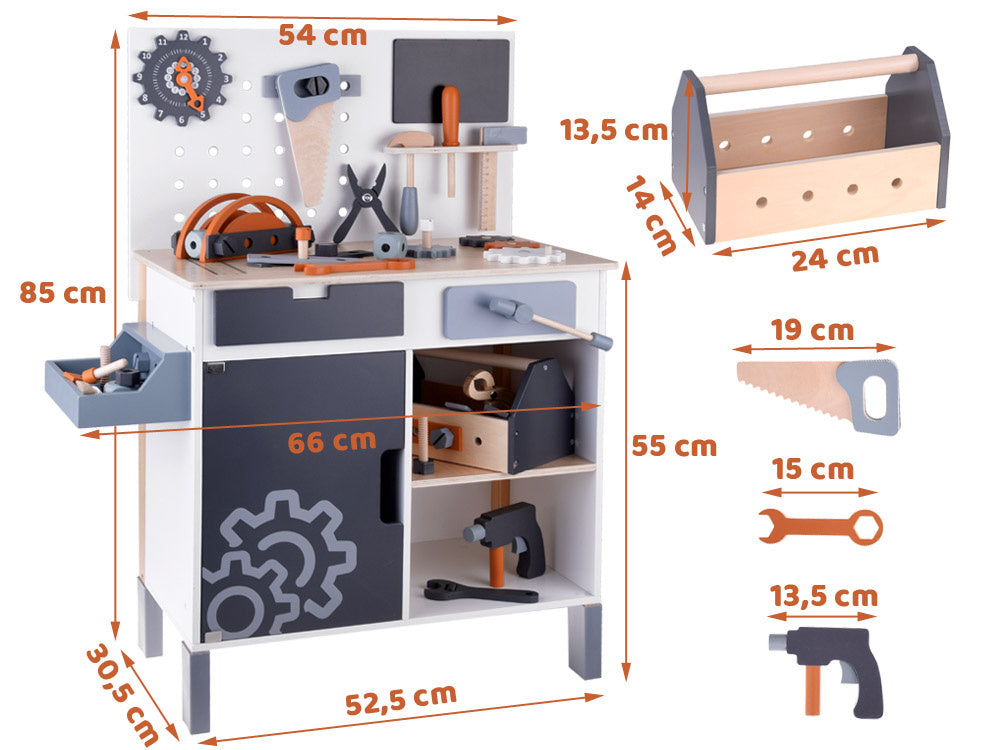 Didelės medinės dirbtuvės mažajam meistrui yra puikus žaislas, kuris tikrai patiks kiekvienam. Rinkinyje, kurį sudaro daug medinių dalių ir beveik 55 priedai, yra visi profesionaliai dirbtuvei reikalingi elementai. Rinkinys puikiai tinka vaikui, mėgstančiam mėgdžioti tėtį ar senelį atliekant namų remonto darbus. Žaislas suteiks valandų valandas puikios ir saugios pramogos. Jis moko kūrybiškumo, skatina vaizduotę, lavina vaiko erdvinį mąstymą ir rankų darbo įgūdžius.