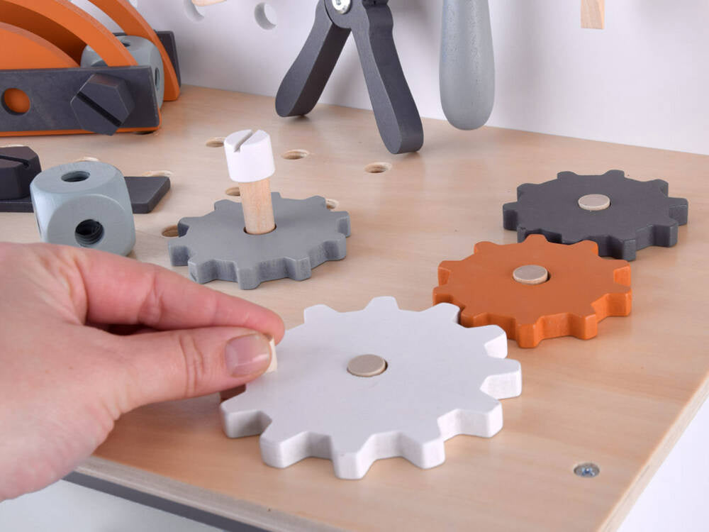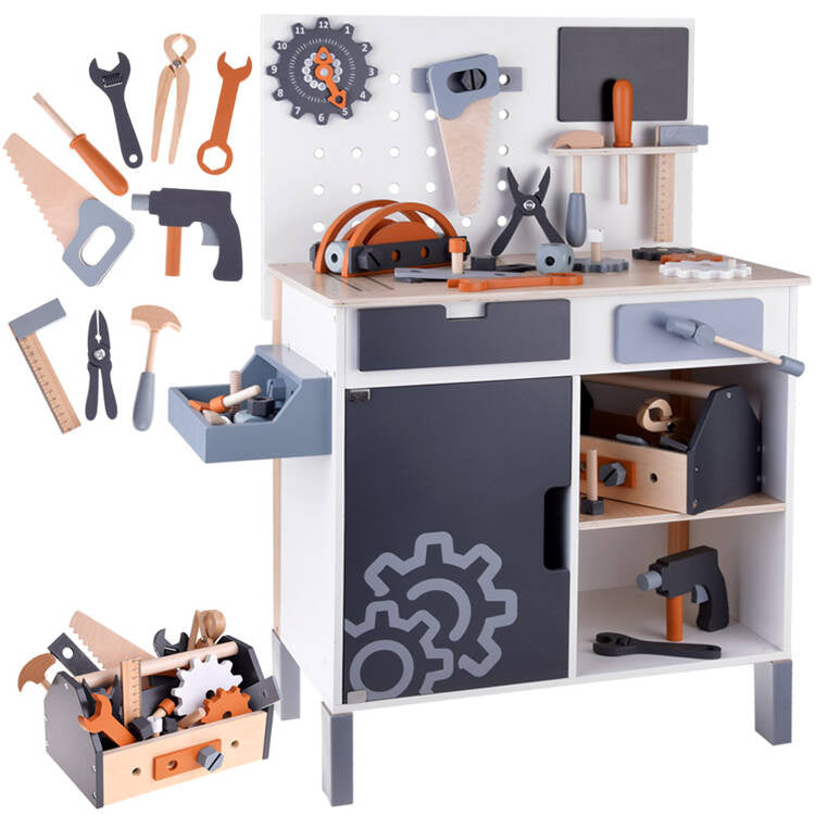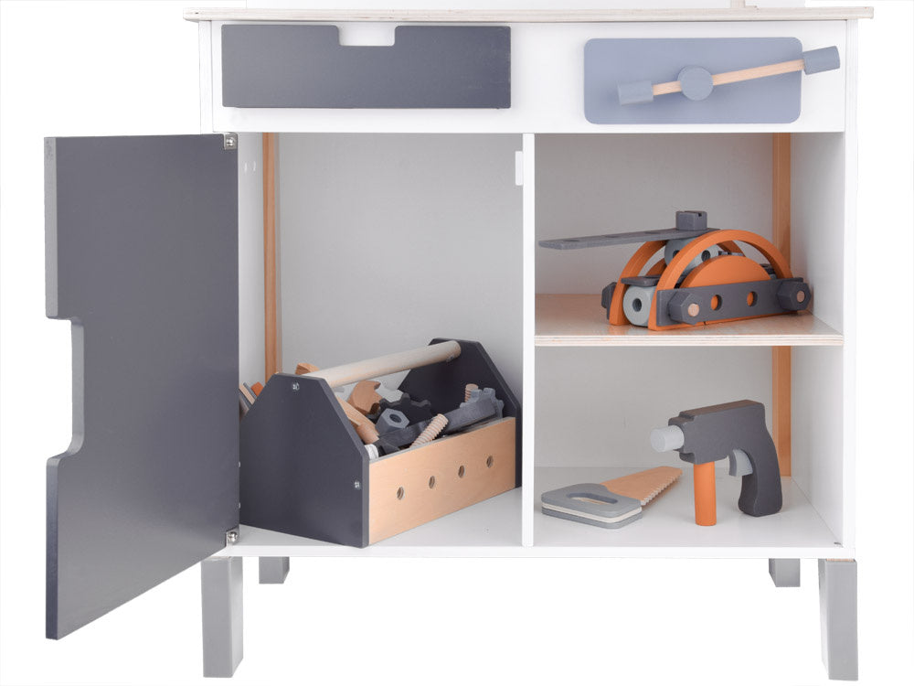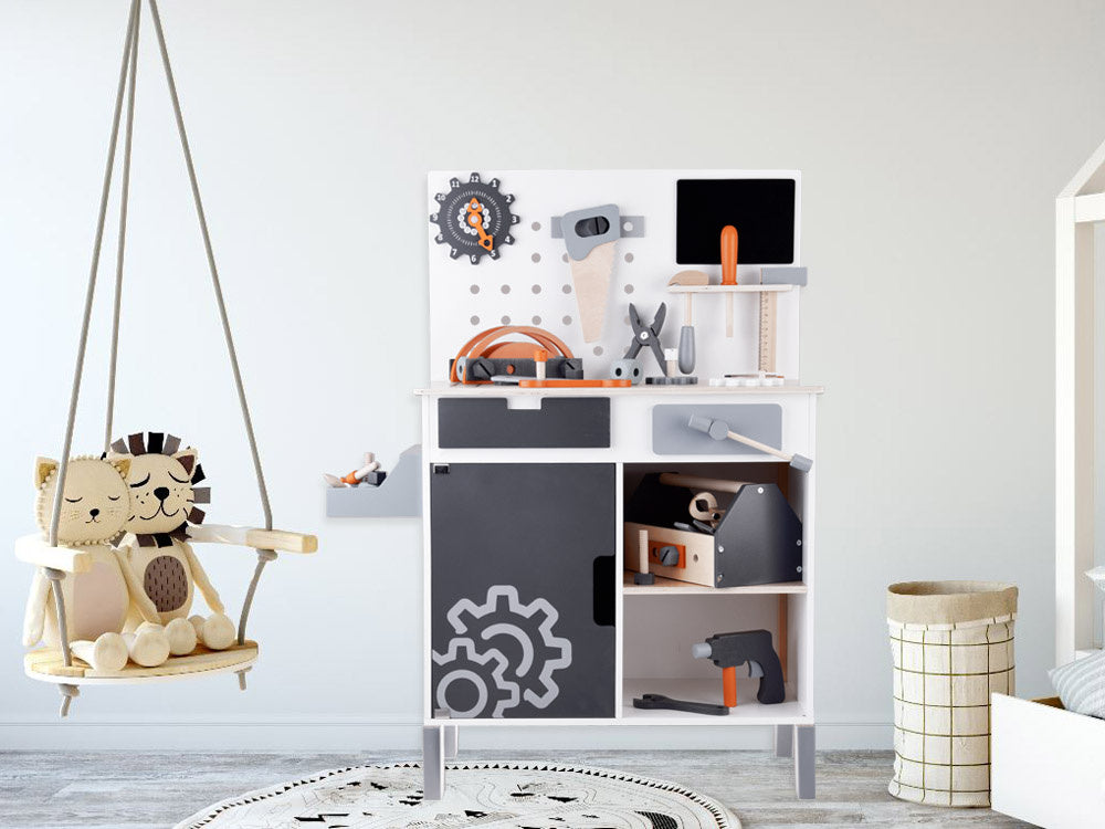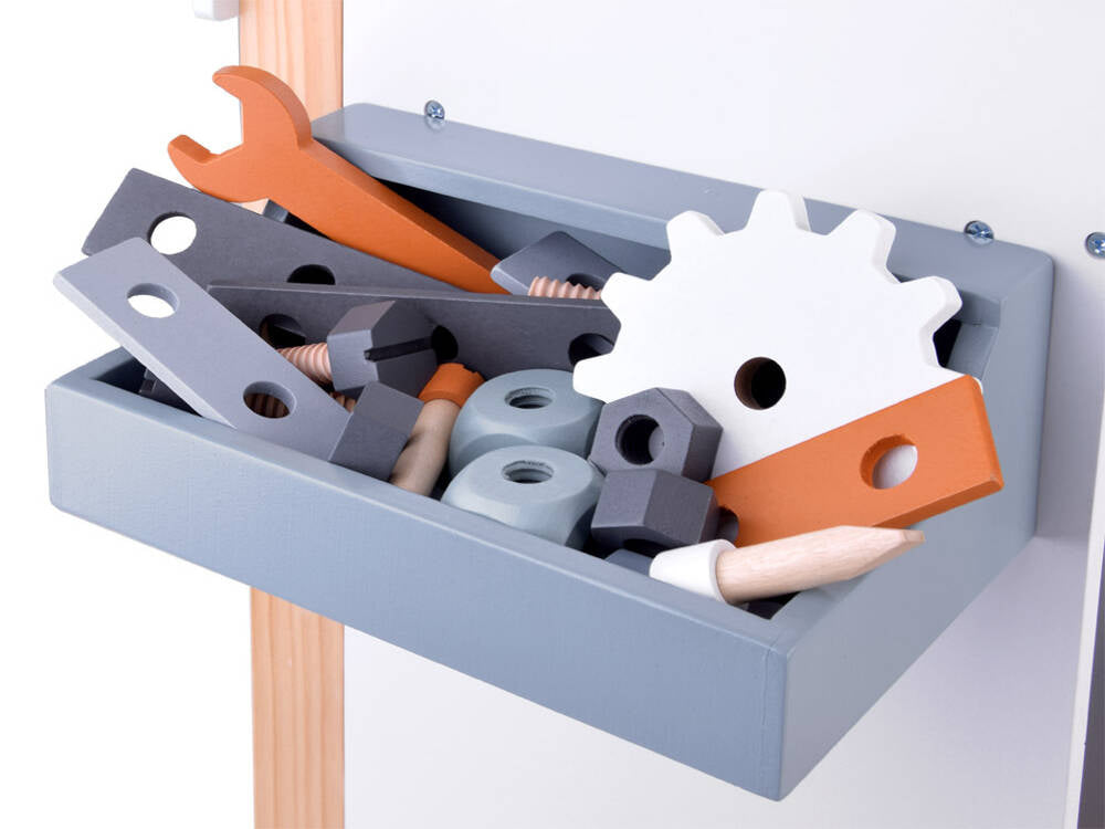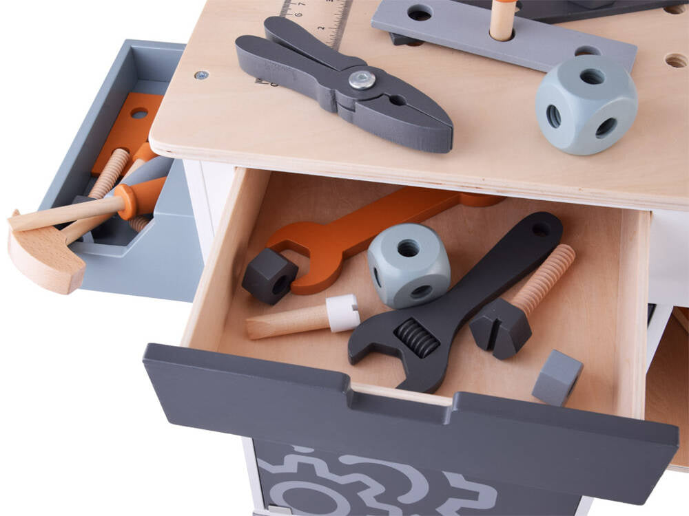 Didelės medinės dirbtuvės mažajam meistrui yra puikus žaislas, kuris tikrai patiks kiekvienam. Rinkinyje, kurį sudaro daug medinių dalių ir beveik 55 priedai, yra visi profesionaliai dirbtuvei reikalingi elementai. Rinkinys puikiai tinka vaikui, mėgstančiam mėgdžioti tėtį ar senelį atliekant namų remonto darbus. Žaislas suteiks valandų valandas puikios ir saugios pramogos. Jis moko kūrybiškumo, skatina vaizduotę, lavina vaiko erdvinį mąstymą ir rankų darbo įgūdžius.