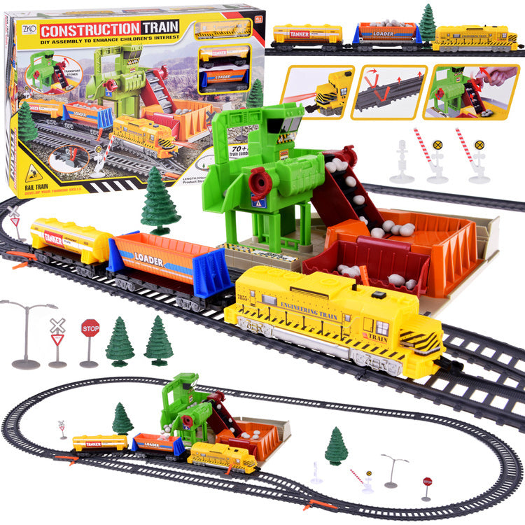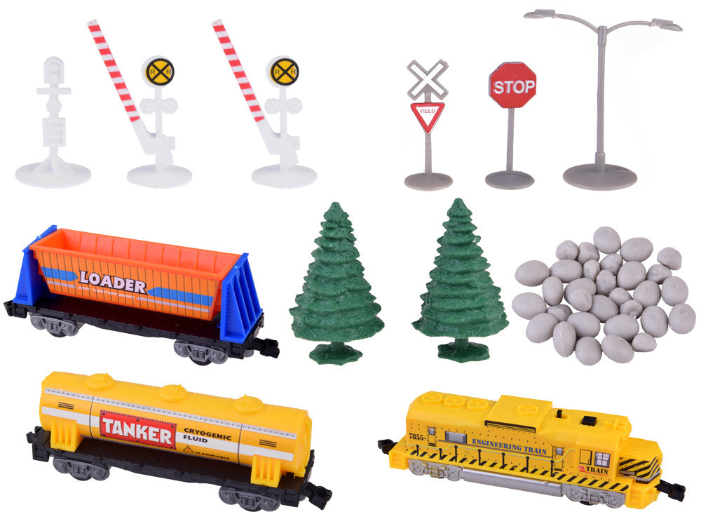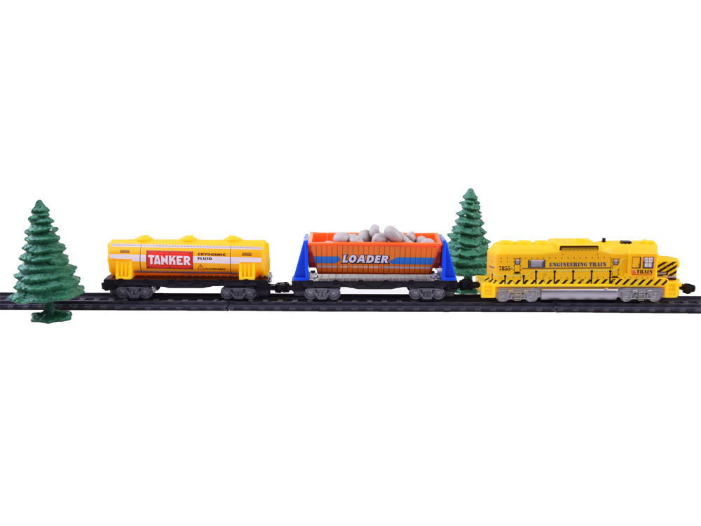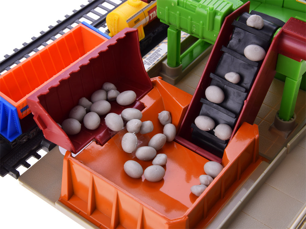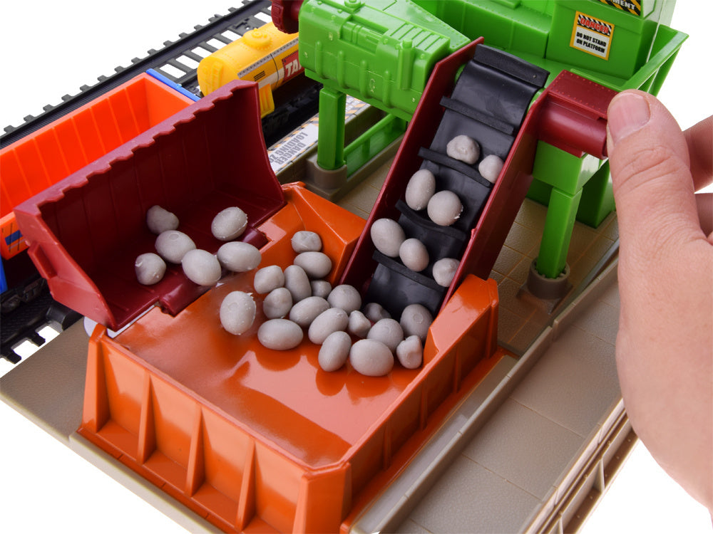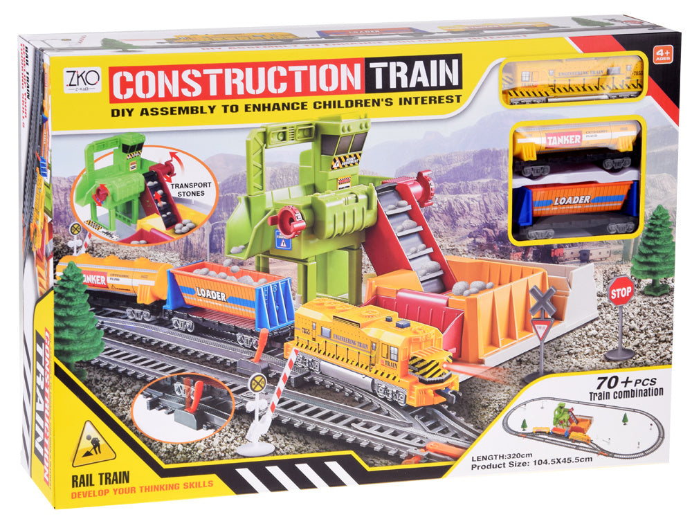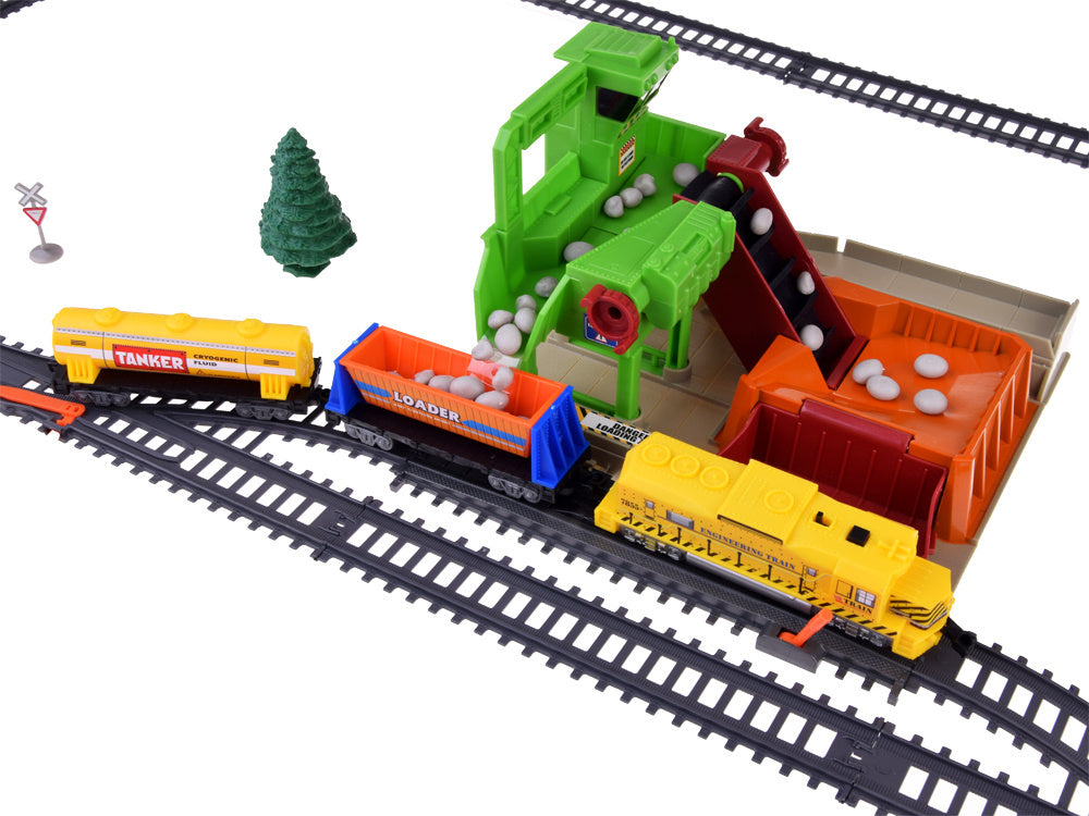 Didelis elektrinis traukinys su vagonais rinkinys - tai galimybė kiekvienam mažajam traukinio mašinistui. Vienas iš vagonų yra cisterna, o kitas - konteineris akmenims iš karjero. Ovaliame kelyje yra atšaka, kuria traukinys nusileidžia, kad pakrautų akmenis iš karjero tiekėjo. Viskas veikia pagal planą. Lokomotyvas, įjungiamas ant stogo esančiu mygtuku, pradeda važiuoti ir užsidega raudona šviesa. Pramoga užtikrinta 100 %. Rinkinys supakuotas į labai gražią spalvingą dėžutę, puikiai tinkančią dovanai.