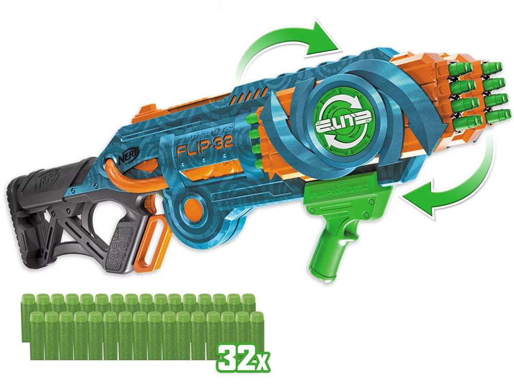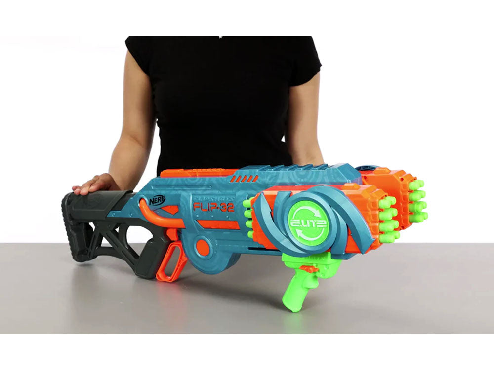 Didelis šautuvas "NERF Elite 2.0 FLIP-32" yra pasiūlymas visiems šaudyklių mėgėjams. Įspūdingas žaislas, kuris visiškai įtrauks jus ir jūsų draugus. Pistoletas padarys įspūdį ir mažiems, ir dideliems šios įrangos naudotojams, jis šaudo tiksliai ir toli. Kiekvienas šaudymo varžybų mėgėjas su tokiu ginklu galės treniruotis šaudyti į taikinius arba rengti varžybas su draugais. Būkite atsargūs žaisdami. Pramogos tik prižiūrint suaugusiesiems.