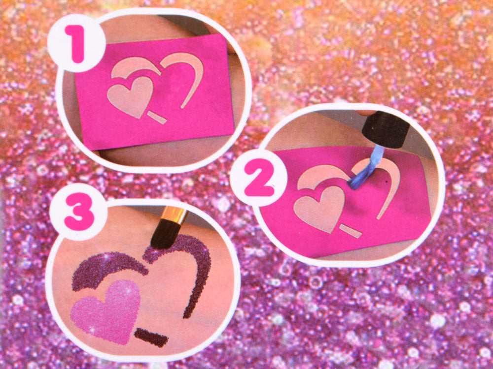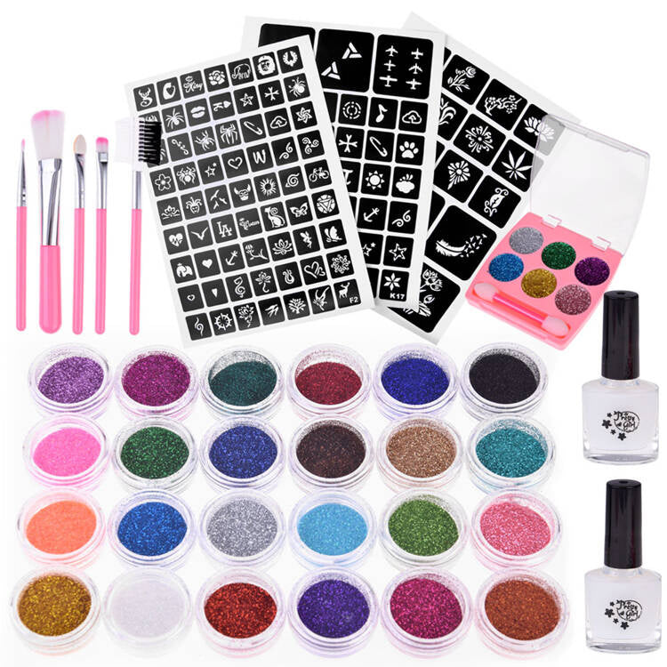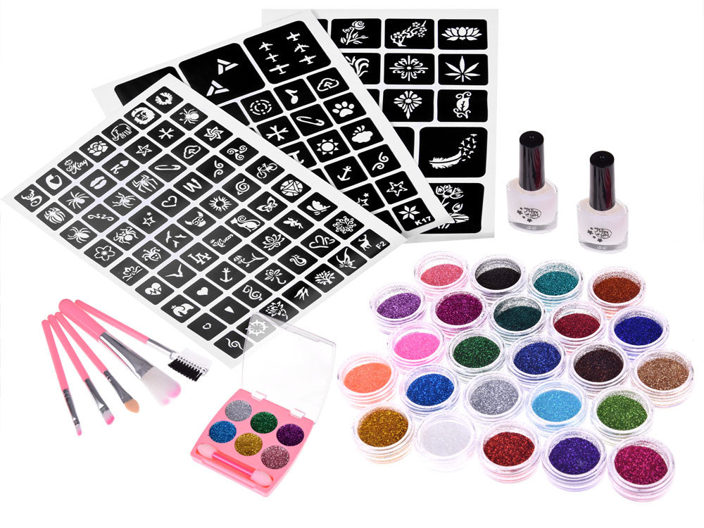 Blizgios tatuiruotės yra kiekvienos šventės hitas. Šis puikus rinkinys padės jums sukurti itin madingas blizgias tatuiruotes. 120 įvairaus dydžio raštų, 24 indelių gražių, blizgių blizgučių dulkių ir 2 buteliukų klijų pakanka daugybei tatuiruočių sukurti. Pridedami blizgantys akių šešėliai ir teptukų rinkinys padės sukurti fantastišką stilių. Blizgučių tatuiruotės yra lengvai plaunamos ir, svarbiausia, saugios jautriai vaikų odai.