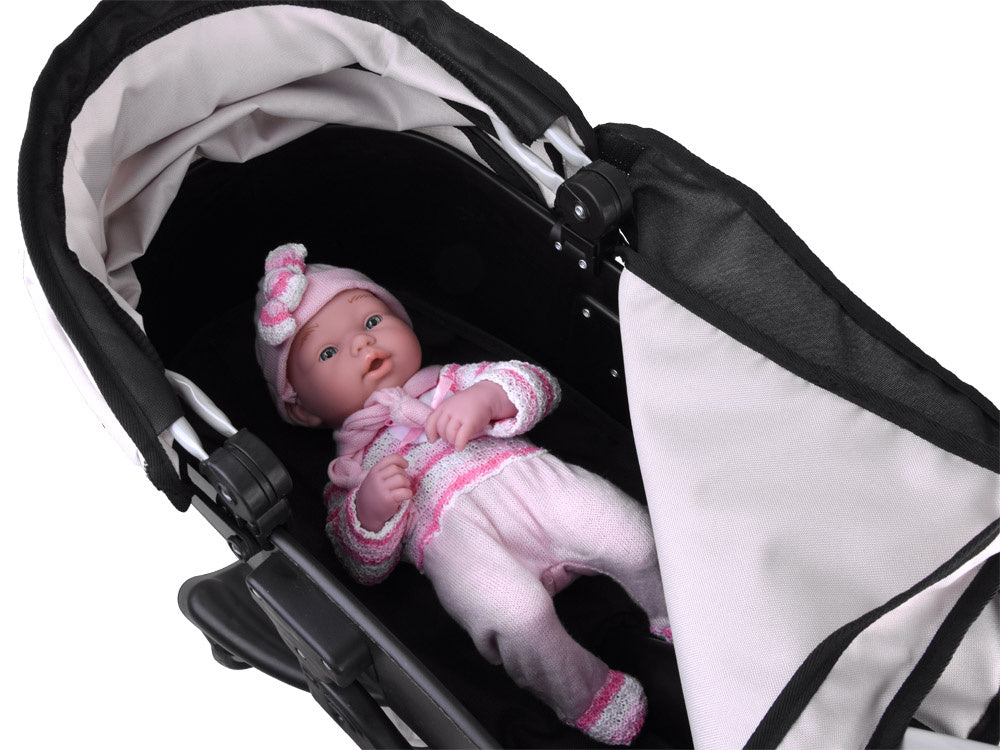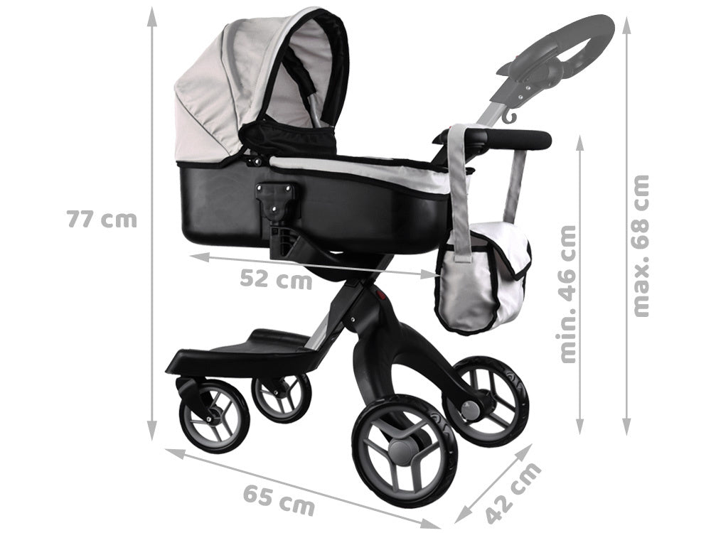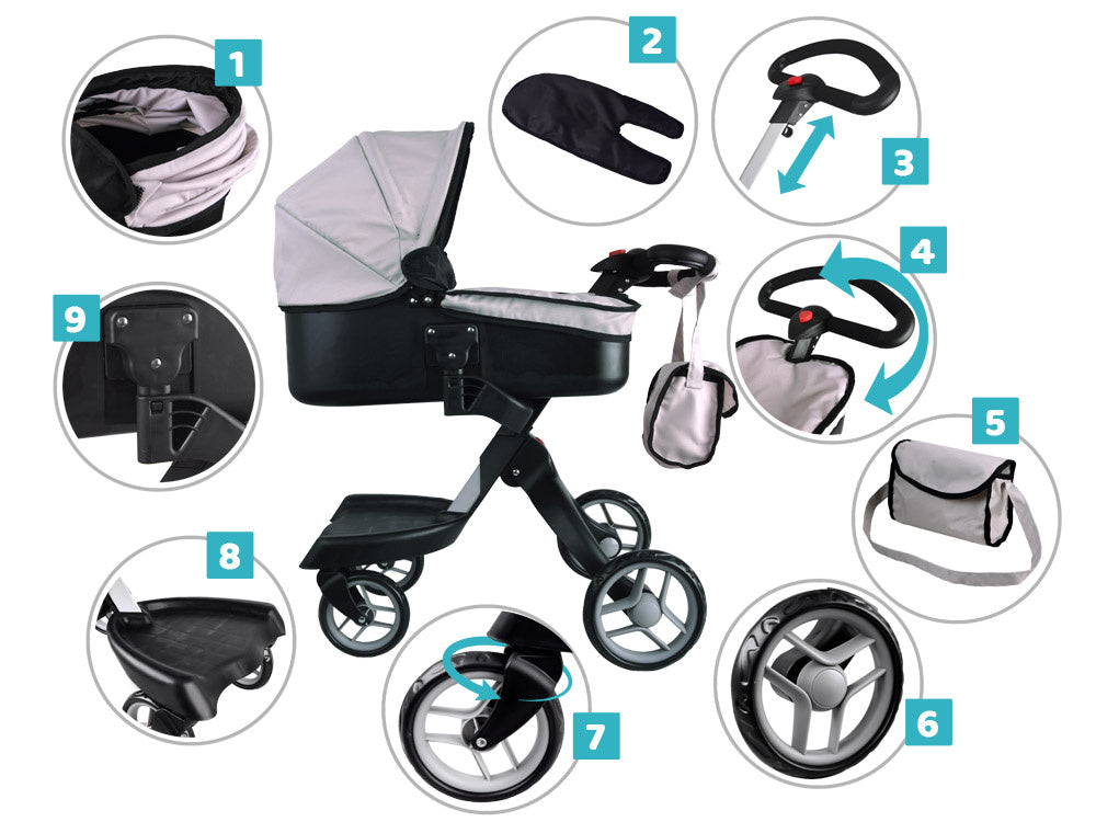 Modernus vežimėlis su lopšiu lėlėms leis kiekvienam vaikui pasiimti pasivaikščioti savo mėgstamą lėlę, meškiuką. Talpu lopšį ant modernios konstrukcijos labai lengva vairuoti dėl didelių putplasčio ratų, vežimėlio rankeną galima lengvai reguliuoti pagal vaiko ūgį. Vežimėlyje yra didelė erdvė lėlei ant minkšto čiužinuko paguldyti, vežimėlio gaubtas sulankstomas, o užvalkalas nuimamas. Vežimėlyje taip pat yra talpus krepšys reikalingiems priedams susidėti.