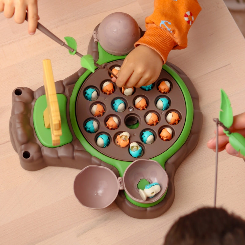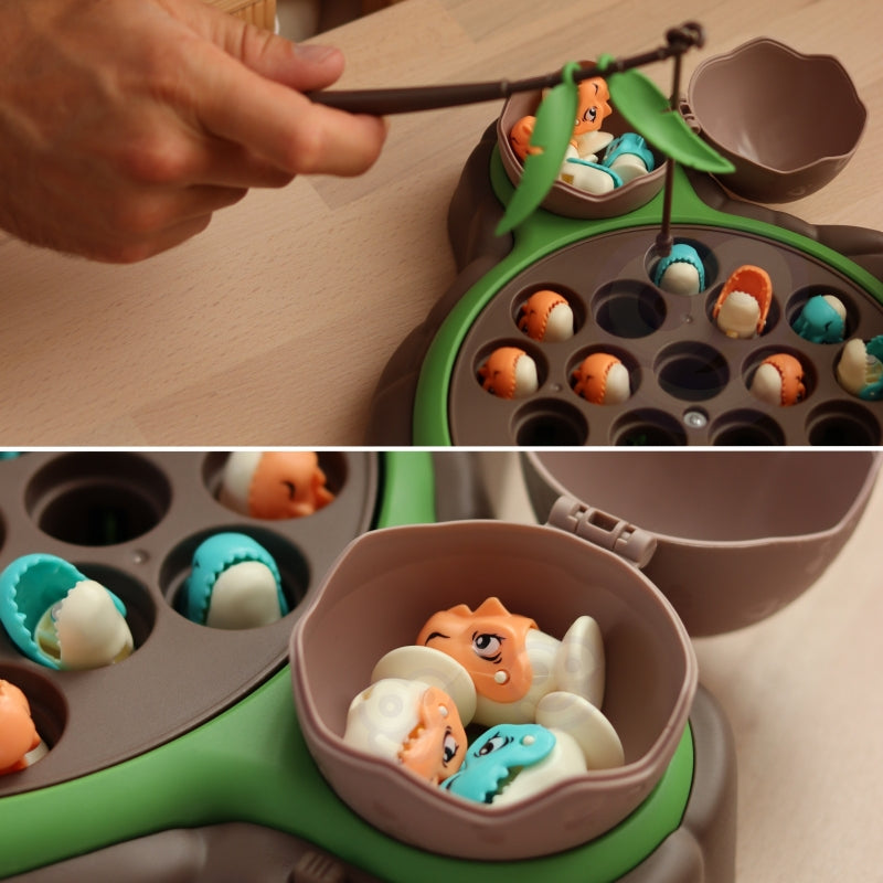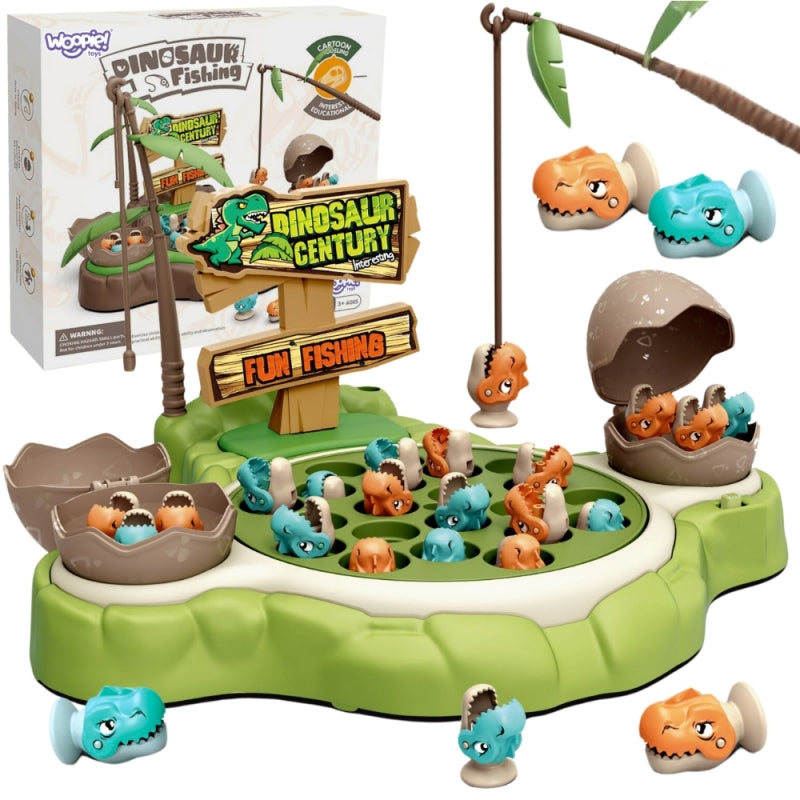 Prekės ženklo WOOPIE dinozaurų žvejybos žaidimas paskatins jūsų vaiką tyrinėti pasaulį. Paspaudus mygtuką viduryje, diskas pradės suktis, kai jį pastumsite iki galo į dešinę, išgirsite malonią melodiją, kuri lydės jus žaidžiant. Disko šonuose yra du uždaromi kiaušiniai, kuriuose galime paslėpti pagautus dinozaurus. Šis žaislas puikiai stimuliuoja vaizduotę, skatina kūrybinį ir nestandartinį mąstymą bei nuostabiai lavina mažųjų rankų darbo įgūdžius, be to, suteikia daug džiaugsmo mokantis.