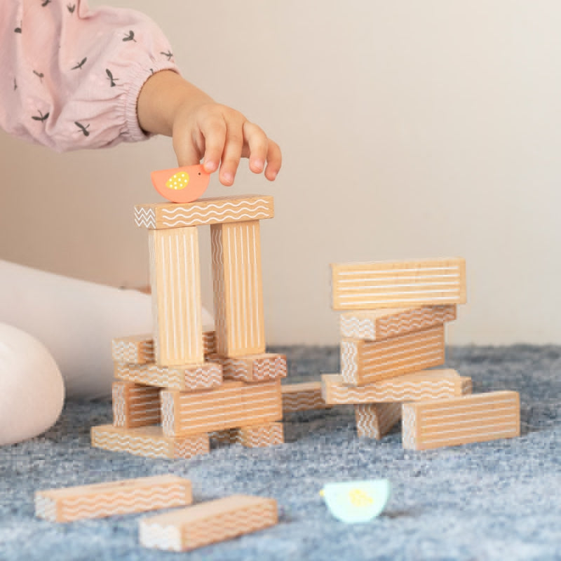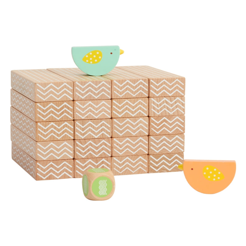 - Rinkinį sudaro: 20 kaladėlių, 2 paukščiai ir kauliukas