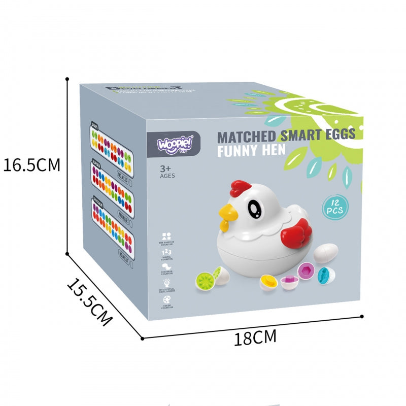 WOOPIE spalvotas rūšiuoklis višta - daugiafunkcinis lavinamasis žaislas, kuris lavina pagrindinius vaikų įgūdžius. Vištelė slepia įvairių formų žaislinių kiaušinių rinkinį, kuriuos vaikas turi įstatyti į atitinkamas skylutes, todėl vaikas mokosi atpažinti formas, spalvas ir lavina rankų darbo įgūdžius. Kiekviena iš 12 detalių yra skirtingos formos ir spalvos, todėl žaislas yra ne tik vizualiai patrauklus, bet ir labai lavinantis.