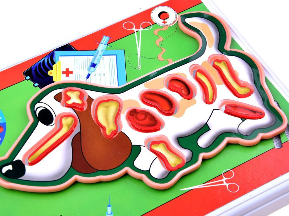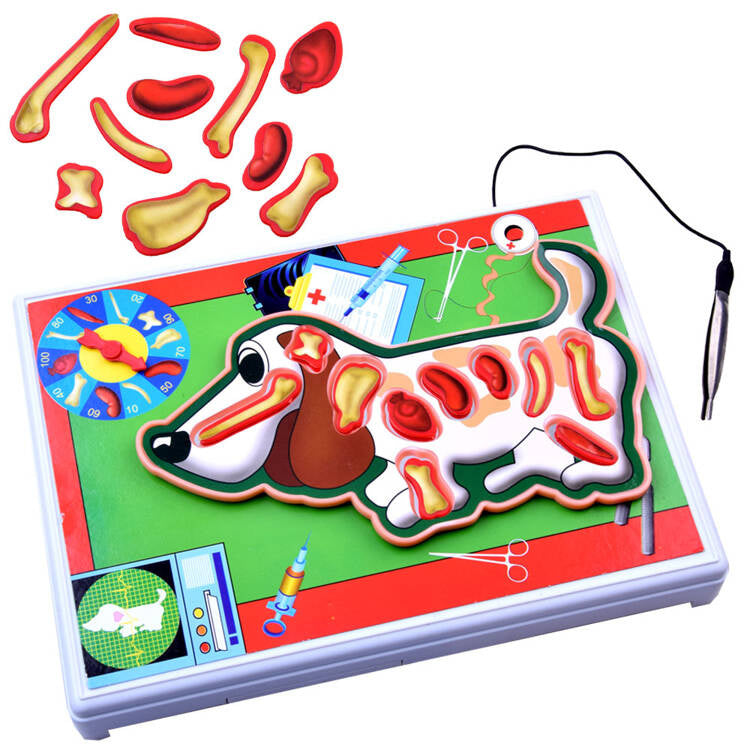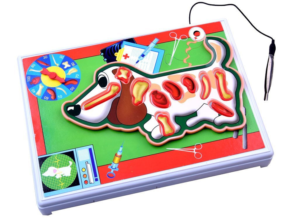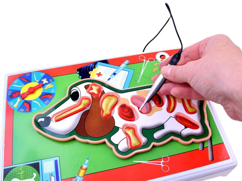 Žaidimas "Veterinaras" puikus žaidimas bet kuriam vaikui, norinčiam tapti veterinaru. Mažajam veterinarui teks nemažai darbo operuojant šuniuką. Žaidimas lavina judesių ir vikrumo koordinaciją ir verčia vaiką mąstyti. Lentos viršuje yra rodyklė, kurią kiekvienas žaidėjas turi pasukti, kai ateina jo eilė. Rodyklė sustos ties dalimi, kurią jis turi pašalinti. Jei rodyklė rodo į jau pašalintą dalį, žaidėjas vėl pasuka rodyklę. Žaidėjas švelniai, turi nuimti nupieštą kūno dalį. Jei šuo nejuda, tai reiškia, kad operacija pavyko ir žaidėjas gali užrašyti surinktus taškus. Rezultatas yra šalia nupieštos dalies. Jei šuo dreba, vadinasi, operacija nesekminga. Žaidimas baigiamas, kai pašalinamos visos šuns kūno dalys. Laimi tas žaidėjas, kuris surinko daugiausiai taškų.