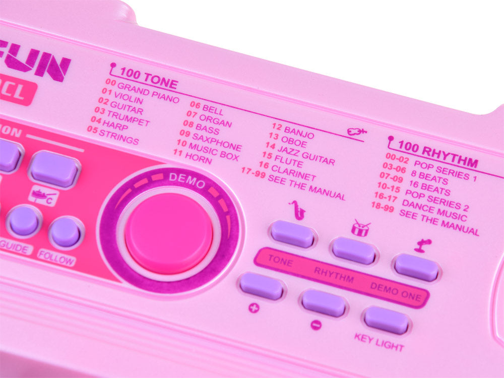 Daug muzikinių funkcijų turintis žaislas leis linksmintis kiekvienai mergaitei. Žaislas su 49 klavišais, 100 foninės muzikos įrašais, dviem garsiakalbiais, 5 būgnų klavišais bei galimybe įrašinėti savo įrašus užtikrins puikią pramogą.