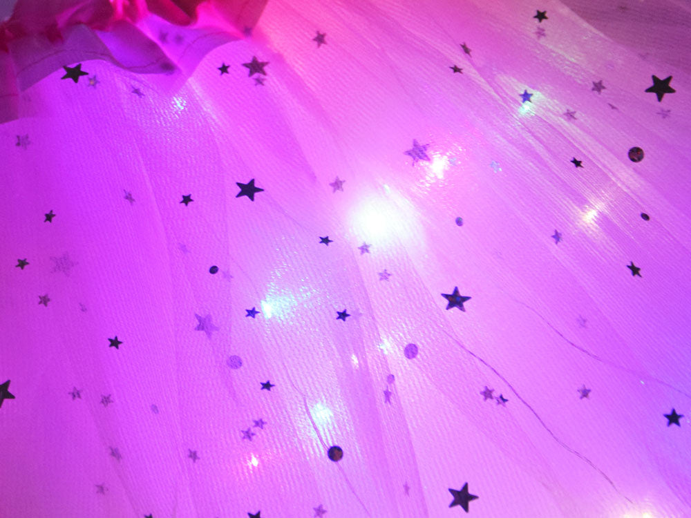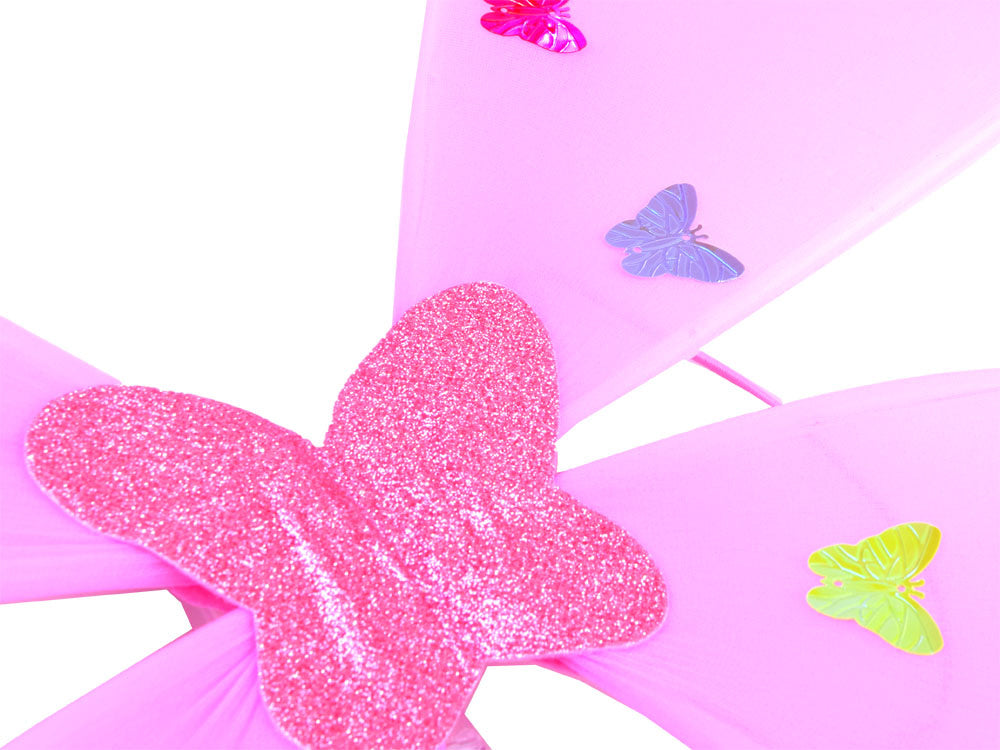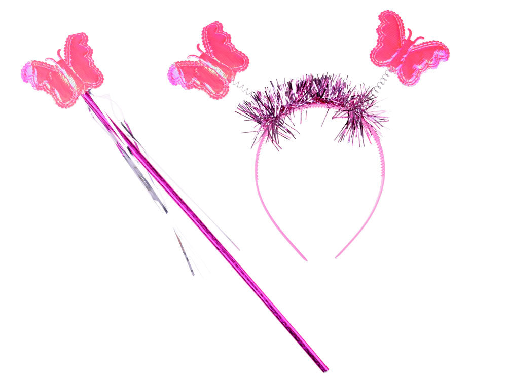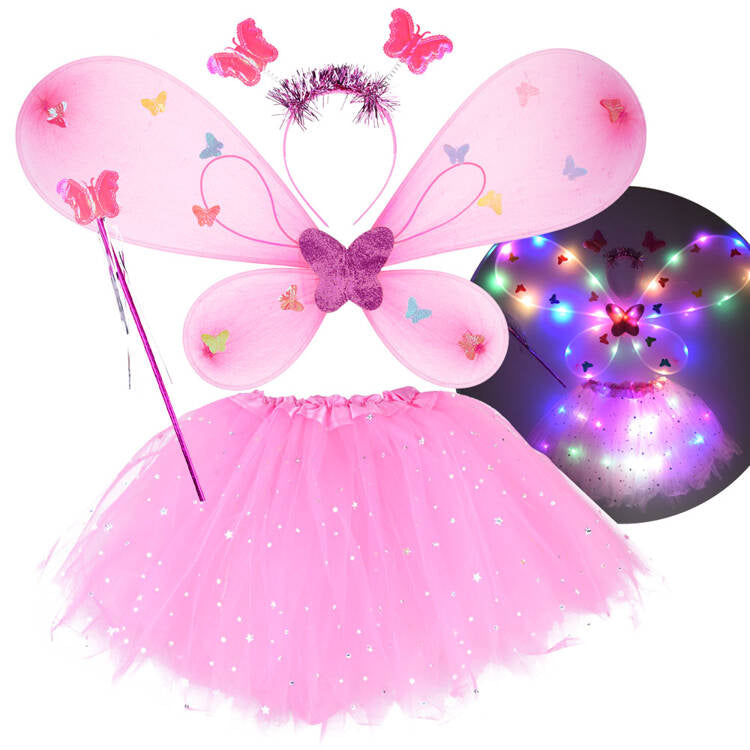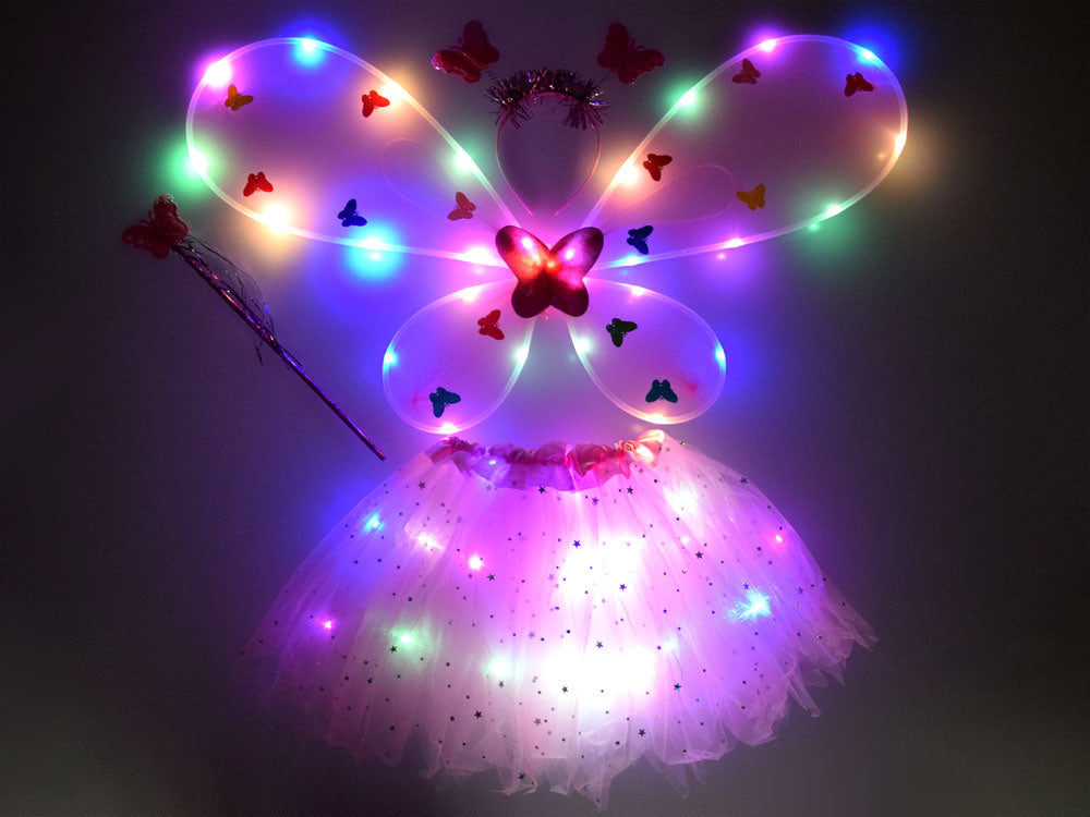 Nuostabus kostiumas mažajai drugelių fėjai. Komplekte yra gražus šviesiai rožinis tiulio sijonėlis su elastine juosta, padengta mažomis sidabrinėmis žvaigždutėmis, ir sparneliai su mažais spalvingais drugeliais, galvos juosta ir lazdelė. Toks gražus rinkinys tiesiog spindės gimtadienio vakarėlyje dėl sijono ir sparnų LED lempučių.