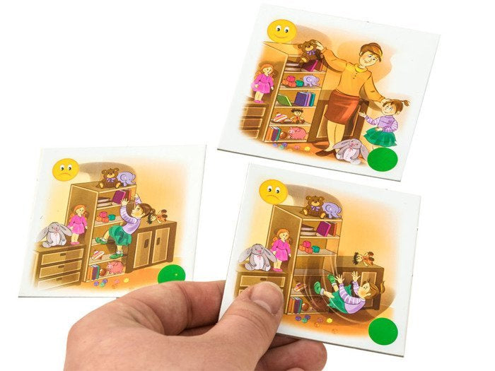 Kiekvienas vaikas gauna po vieną kvadratėlį. Visi stengiasi parinkti paveikslėlius, atitinkančius istoriją, ir sudėlioti juos teisinga tvarka: priežastis-pasekmė-teisingas elgesys. Laimi tas, kuris pirmas tai padaro.