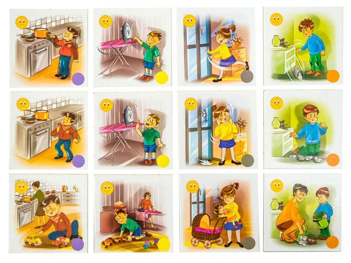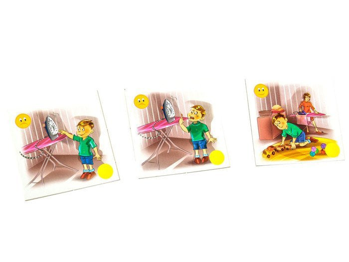 Padėkite visus paveikslėlių kvadratėlius priešais vaikus ir papasakokite istoriją, kad vaikai galėtų pasirinkti tinkamą paveikslėlį pagal istoriją. Kai vaikas pasirenka paveikslėlį su blogu elgesiu ir rezultatu, jis pasirenka paveikslėlį su teisingu elgesiu ir papasakoja, kaip turėjo elgtis istorijos veikėjas.