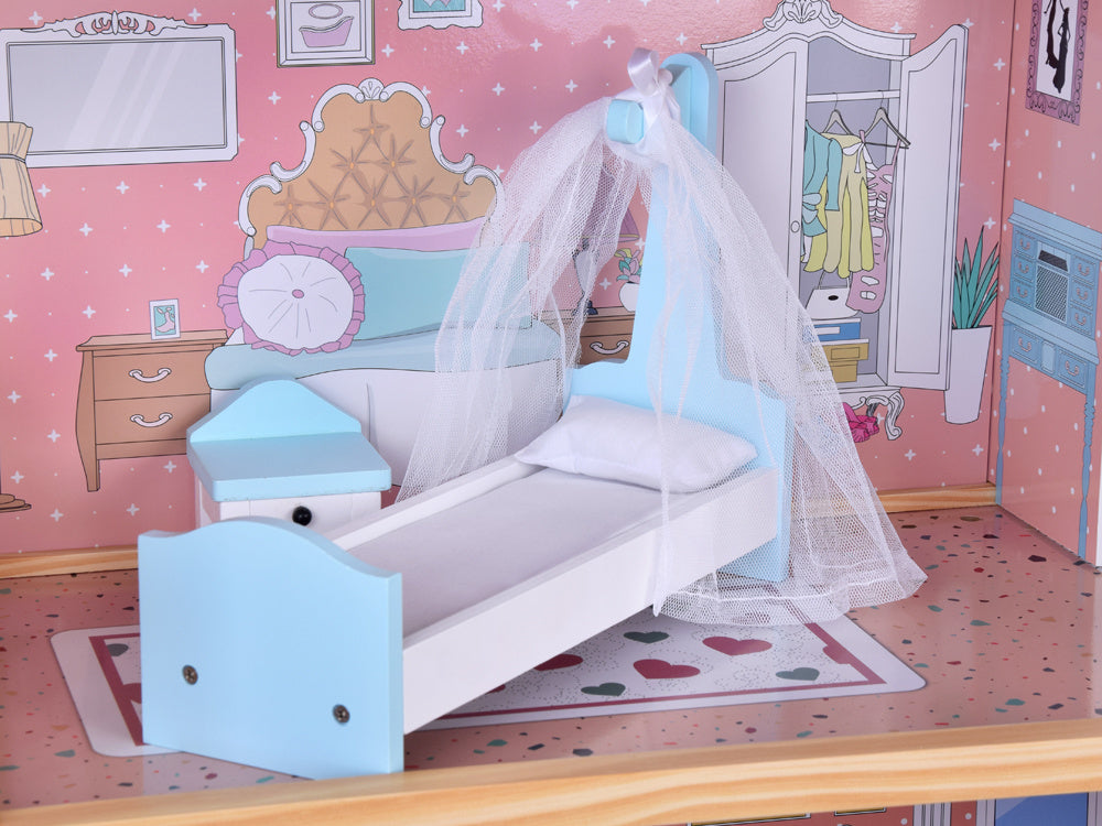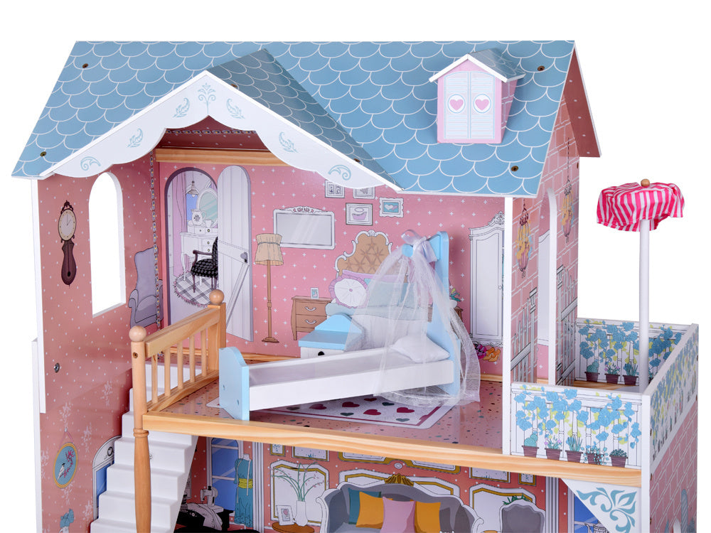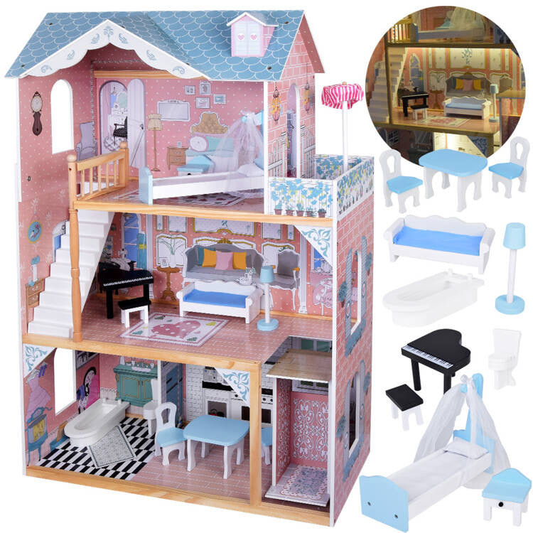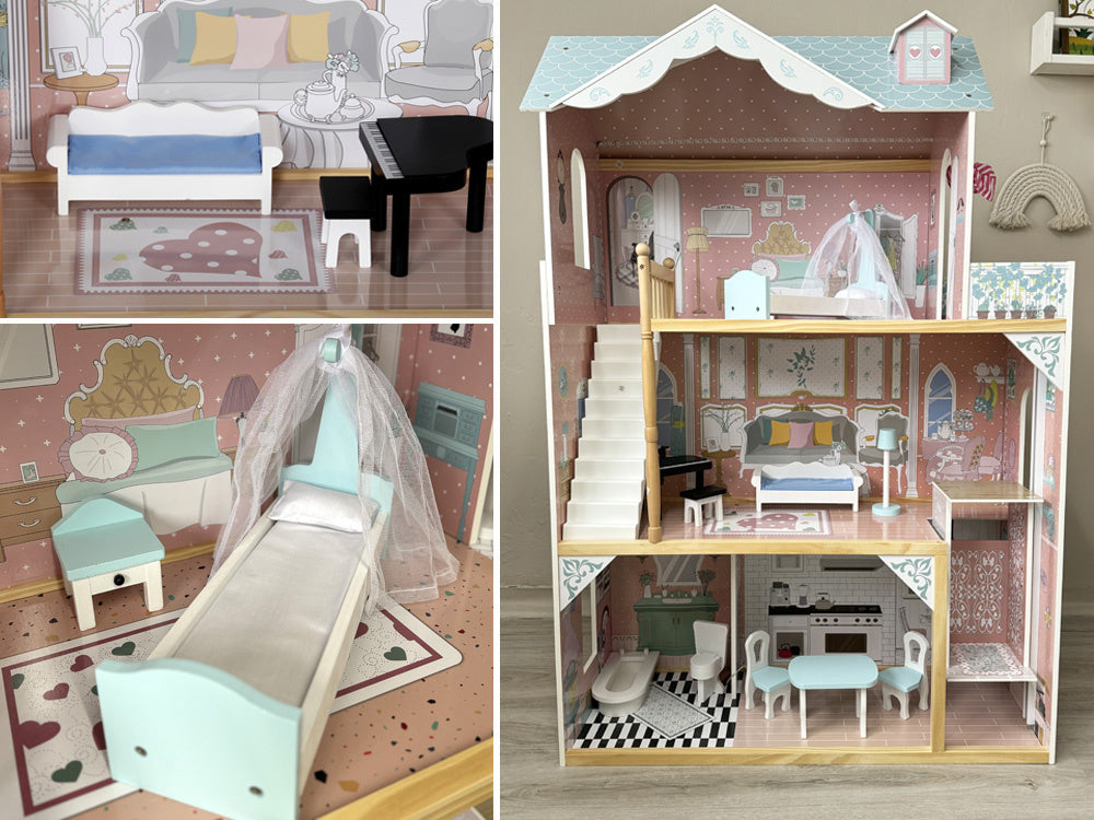 Gražus trijų aukštų medinis lėlių namelis su baldais