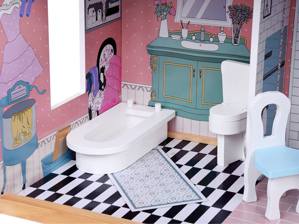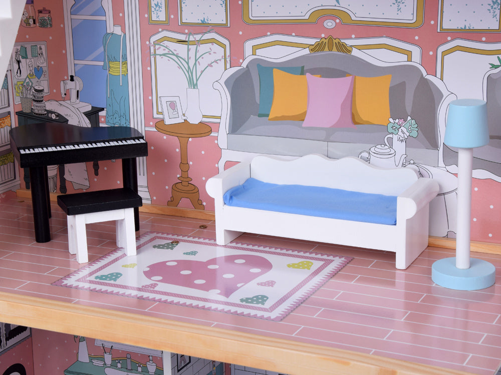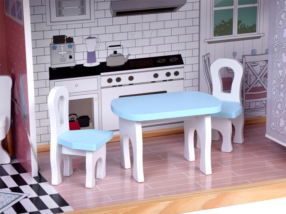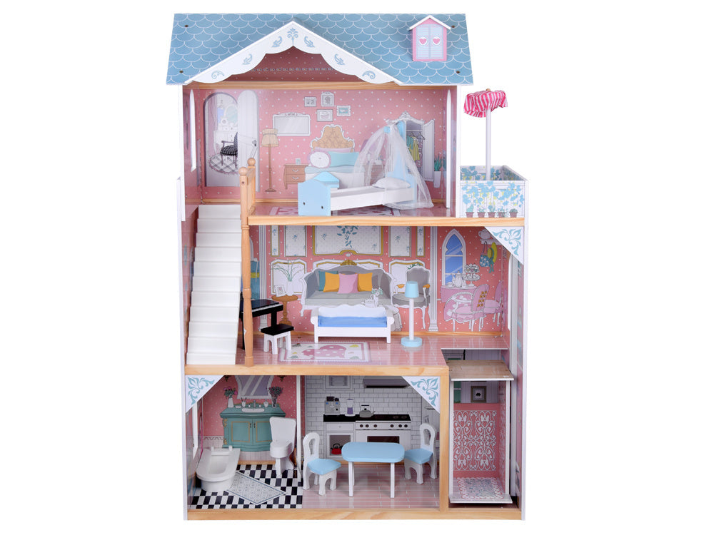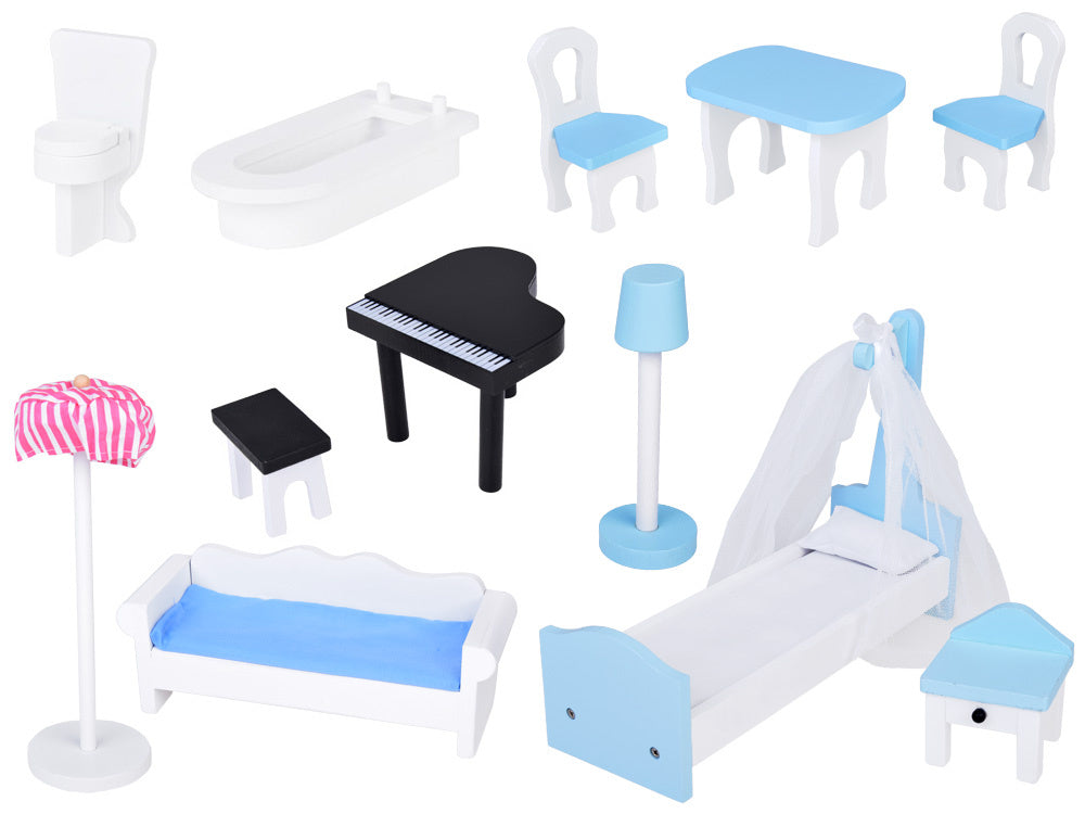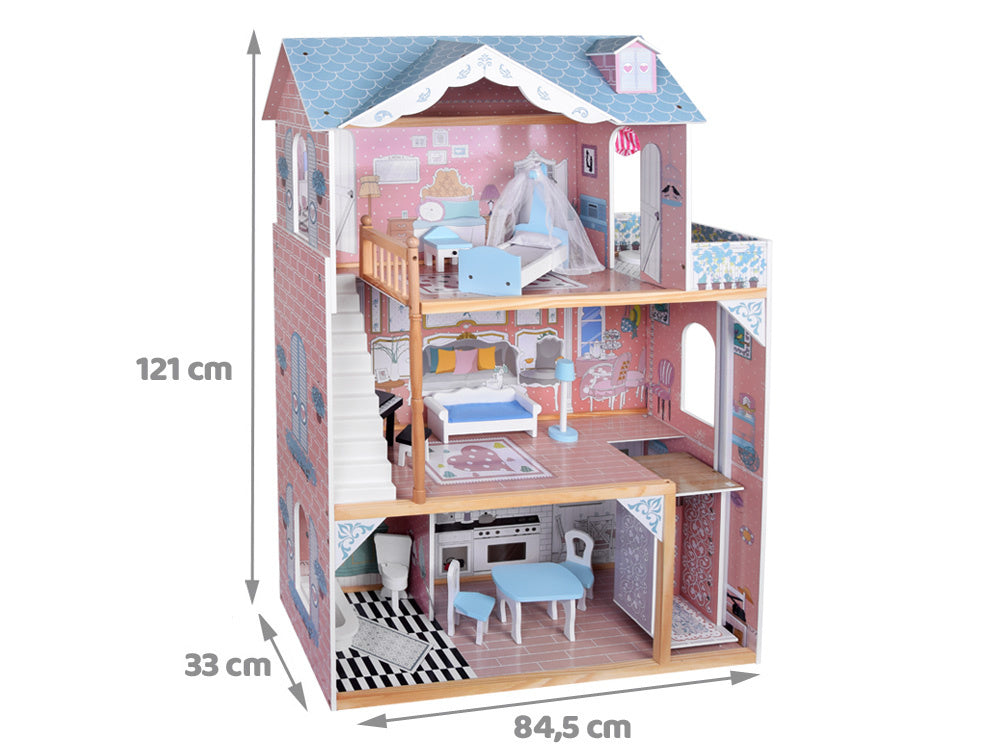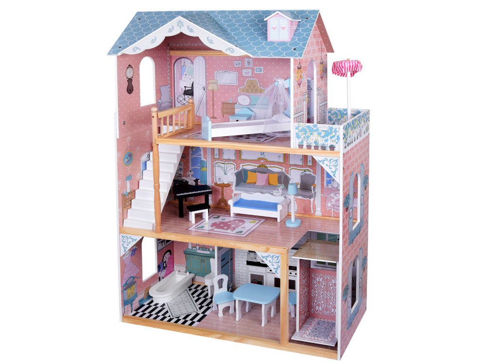 Didelis medinis lėlių namelis su baldais - puiki pramoga ilgiems metams! Nepaprastai didelis medinis namas santūriomis pastelinėmis spalvomis yra kiekvieno mažo vaiko svajonių žaislas. Dėl tvirtos konstrukcijos ir elegantiško dizaino šis namelis suteiks daugybę metų kūrybingų žaidimų. Rinkinyje yra mediniai baldai, puikiai priderinti prie namo interjero. Baldus galima laisvai išdėstyti, todėl vaikas gali laisvai tvarkyti erdvę.