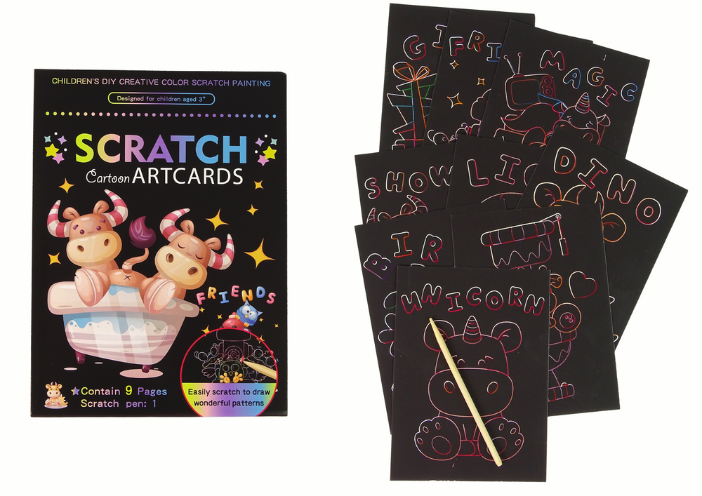 Šis rinkinys - puikus būdas ne tik pramogauti, bet ir kūrybiškai išreikšti savo vaiką. Pramoga paprasta: naudodami specialią medinę lazdelę galite subraižyti juodą paveikslėlio sluoksnį, taip atskleisdami gražias ir spalvingas iliustracijas. Šiose iliustracijose vaizduojamos įvairios scenos iš animacinių gyvūnų pasaulio.