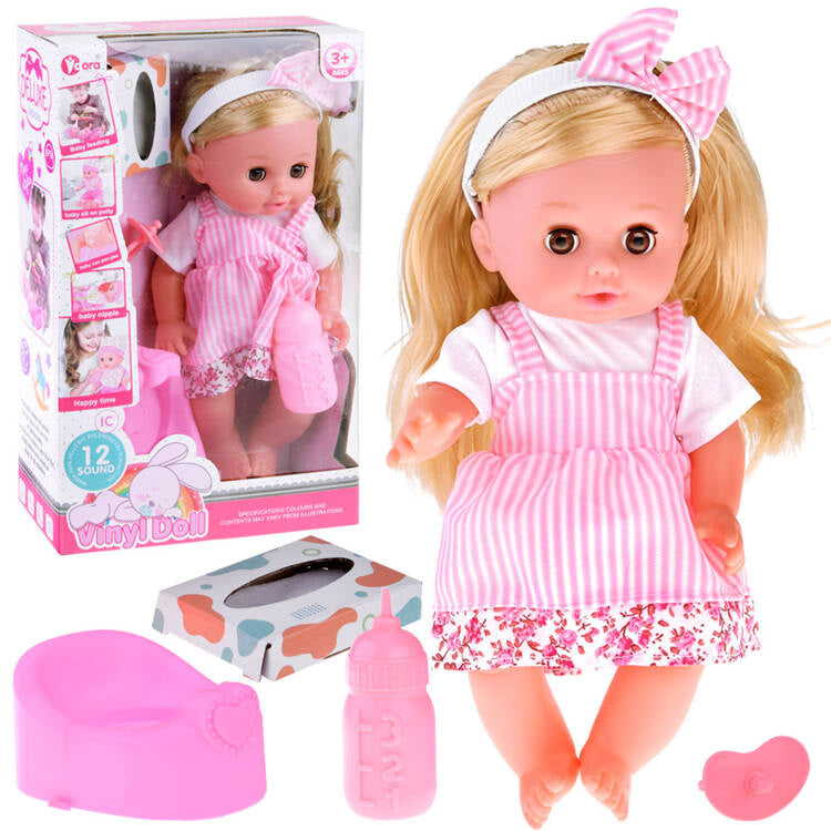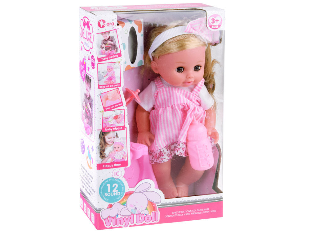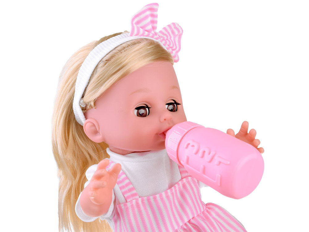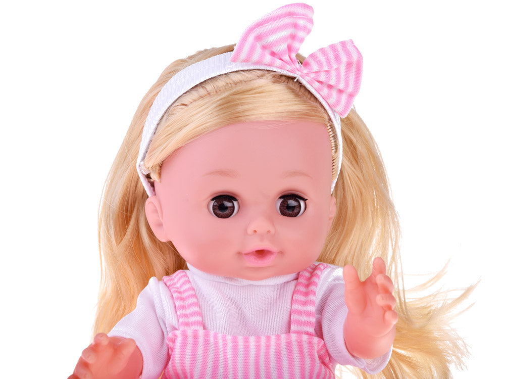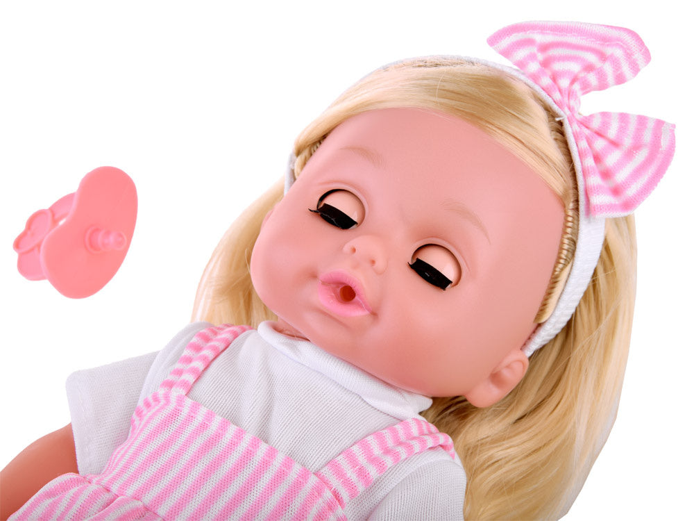 Žavinga, interaktyvi lėlė mėgsta vaikų draugiją. Lėlė vilki gražią suknelę su gėlių rašto apvadu ir baltus marškinėlius. Galvą puošia galvos juosta su lankeliu. Gražų, besišypsantį veidą įrėmina ilgi šviesūs plauka. Dideles rudas akis įrėmina ilgos blakstienos. Kai lėlę nuleidžiame, jos akys užsimerkia, todėl atrodo, kad ji miega. Lėlė yra interaktyvi - ji kalba, skleidžia juoko ir verksmo garsus. Ji taip pat turi šlapinimosi funkciją, kad galėtų pasišlapinti. Kai ji irzli, galime į burną įdėti čiulptuką, kuris ją tikrai nuramins. Į rinkinį įeina daugybė priedų, kurie padės mums rūpintis lėle. Rinkinys supakuotas į gražią, spalvingą dėžutę, puikiai tinkančią dovanai.