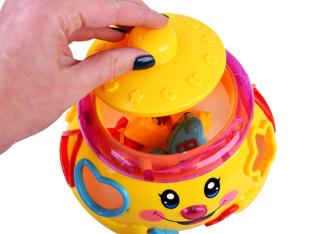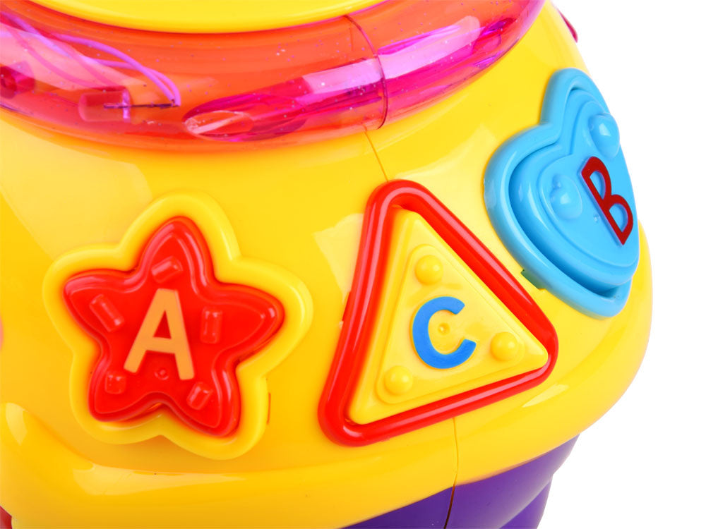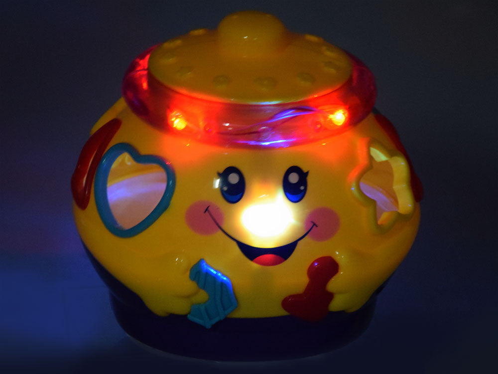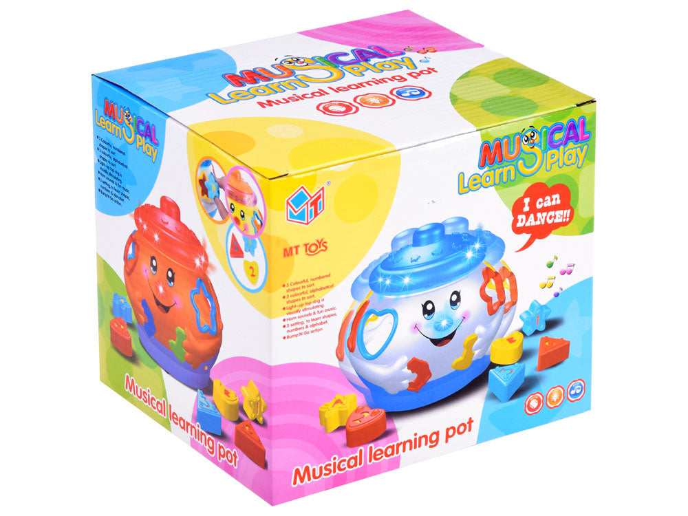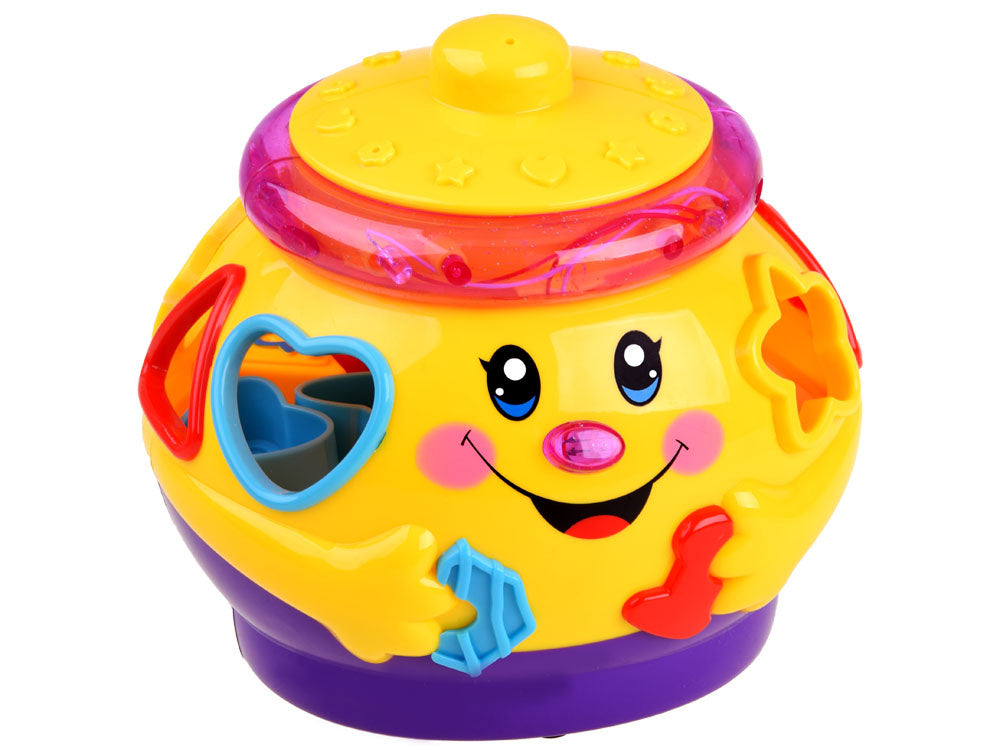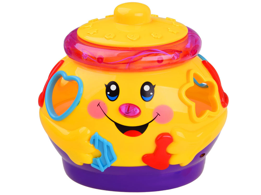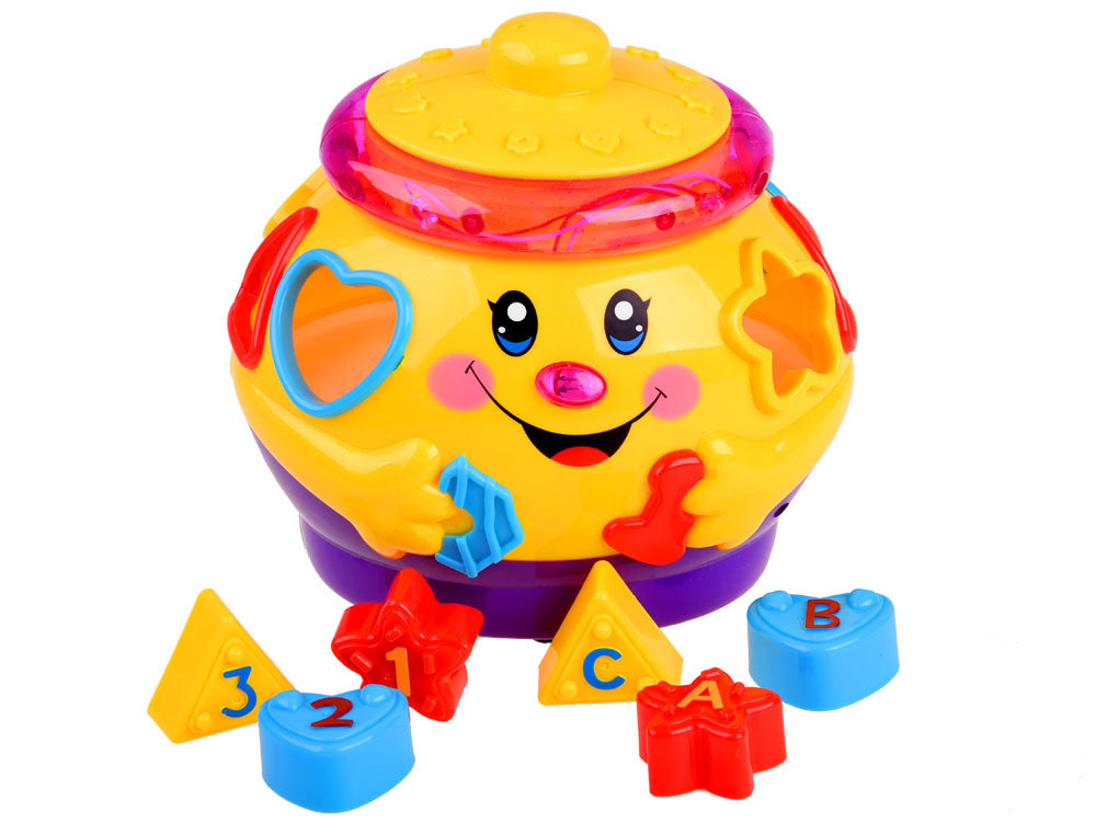 Žaislas savo sudėtyje turi 6 spalvingus kaladėles, kurias reikia įstatyti į jiems skirtas skylutes. Kiekvienas blokas yra skirtingos formos ir pažymėtas skaičiais arba raidėmis. Žaisdamas vaikas mokosi atskirti formas ir spalvas. Spalvingas linksmas puodas įjungtas groja linksmą muziką, važiuoja ant ratų ir linksmai linkčioja, apvadas šviečia, mirksi spalvingomis lemputėmis.
