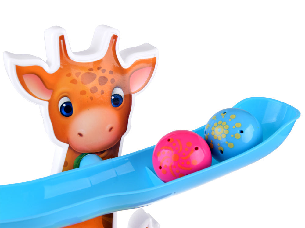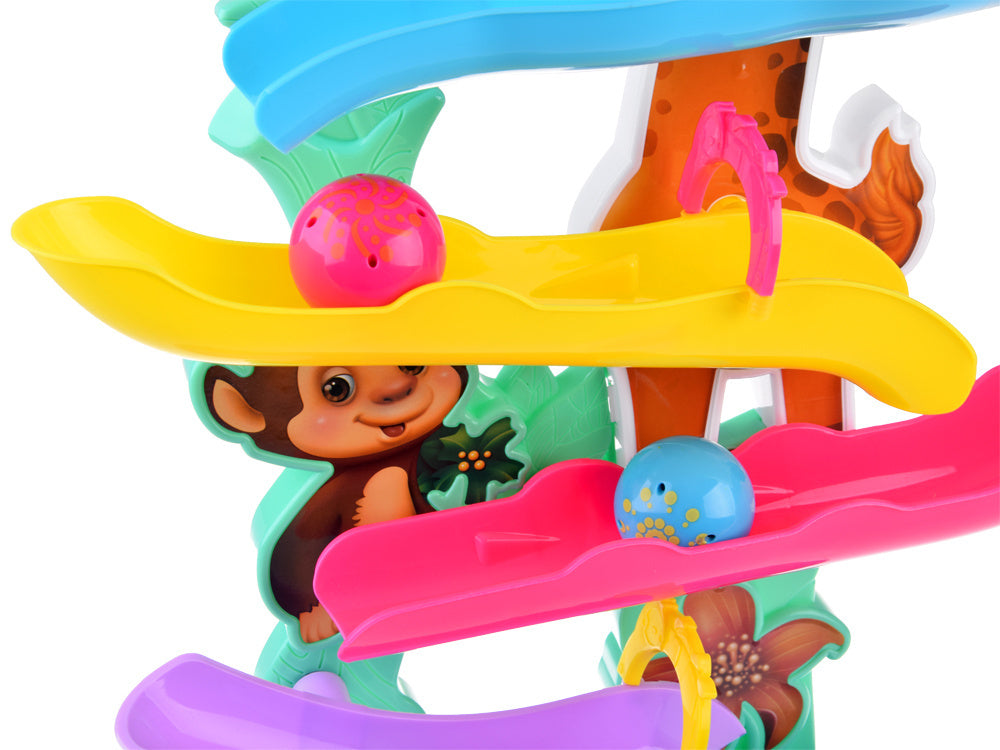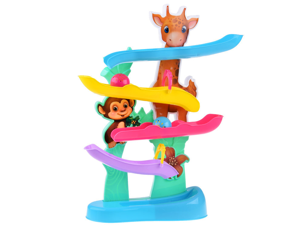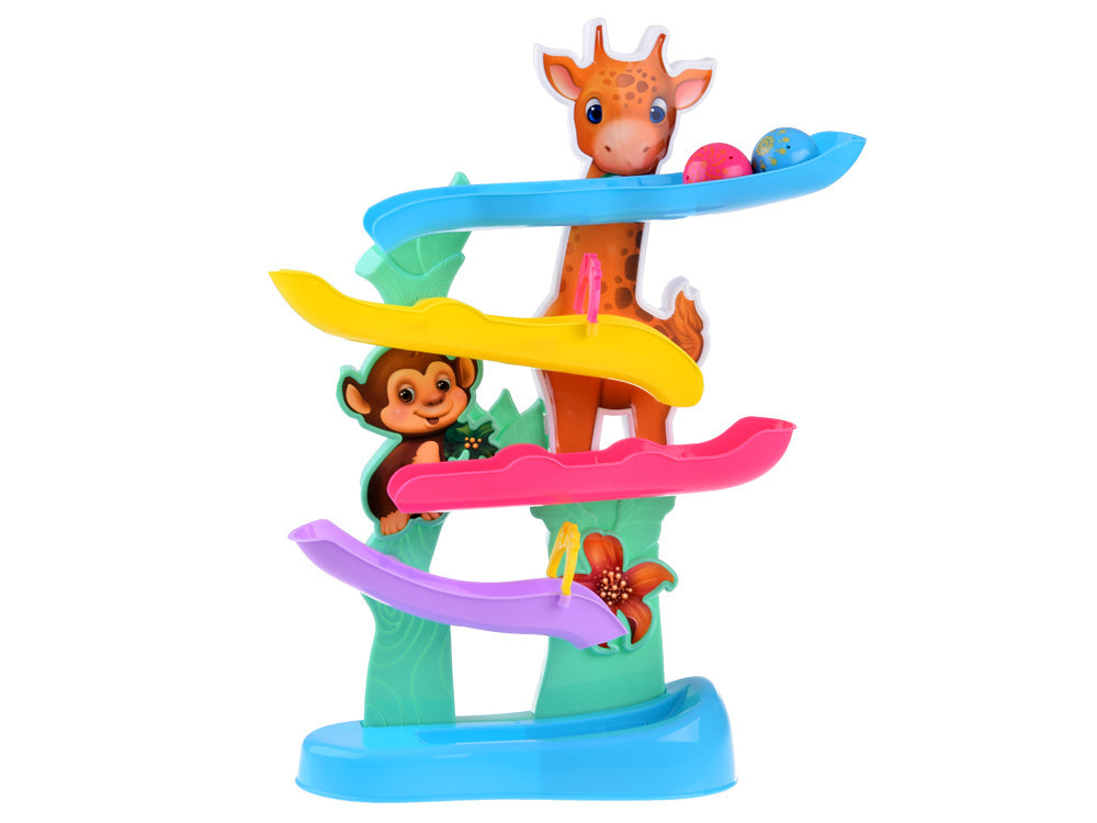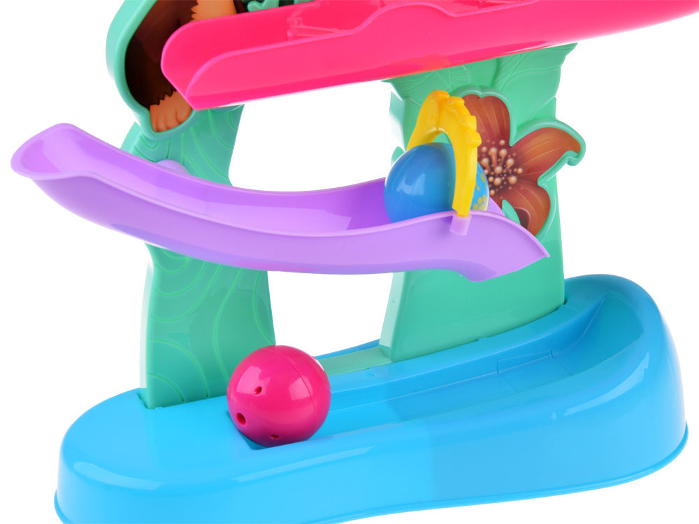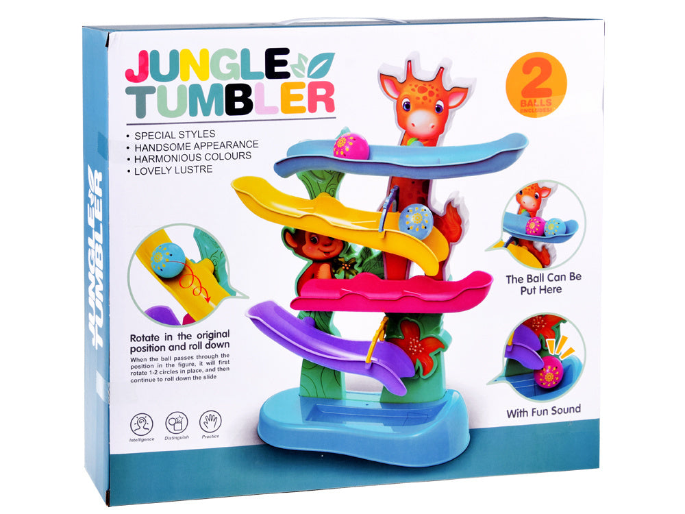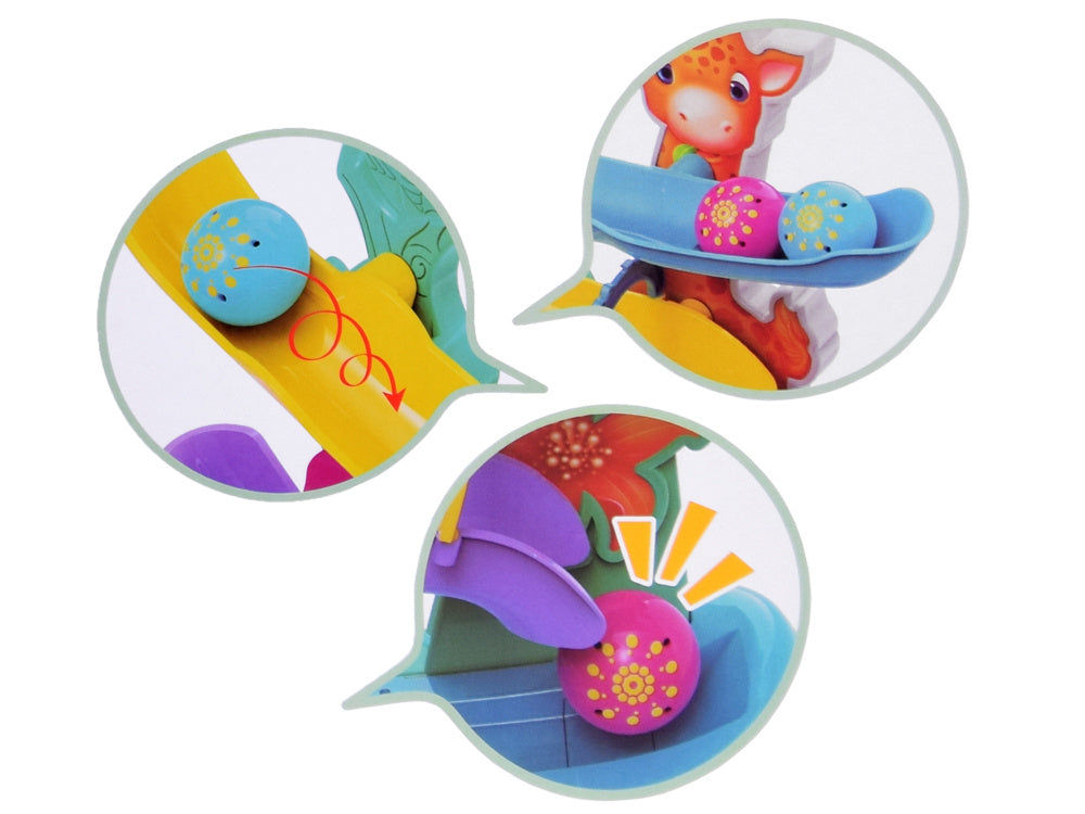 Spalvingame kamuoliukų takelyje yra 4 rampos, kuriomis riedės rausvas ir mėlynas kamuoliukas, o kai jis pasieks apačią, vaikas išgirs linksmą džiunglių gyvūnų balsą kartu su linksmu būgnelio garsu. Interaktyvus žaislas padeda lavinti rankų ir akių koordinaciją ir smulkiąją motoriką!