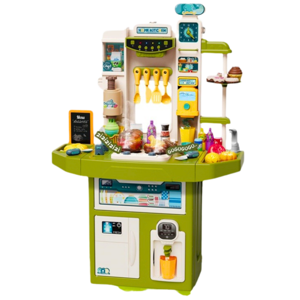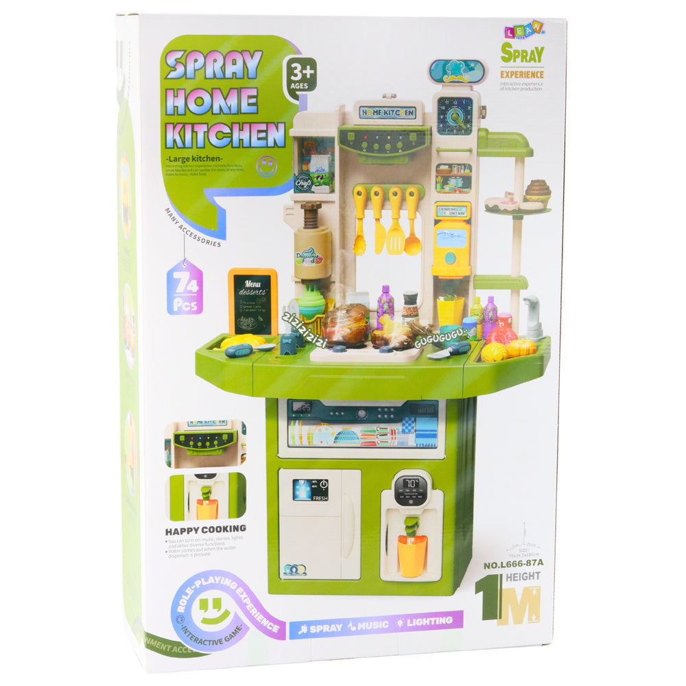 Didelė SPRAY HOME KITCHEN vaikiška virtuvė - puikus pasirinkimas mažiesiems maisto gaminimo entuziastams. Joje yra net 71 detalė, todėl vaikai gali laisvai, kūrybiškai ir realistiškai žaisti su maisto gaminimu, kepimu, serviravimu ir indų plovimu. Žaislinėje virtuvėje yra daug modernių interaktyvių funkcijų: garų efektas, tikroviški maisto gaminimo garsai, spalvingos LED lemputės, taip pat muzikos ir garso istorijos, kurios įjungiamos valdymo pulteliu. Tokios funkcijos garantuoja dar daugiau džiaugsmo, įtraukiančio vaiką į ilgą ir įtraukiantį žaidimą.