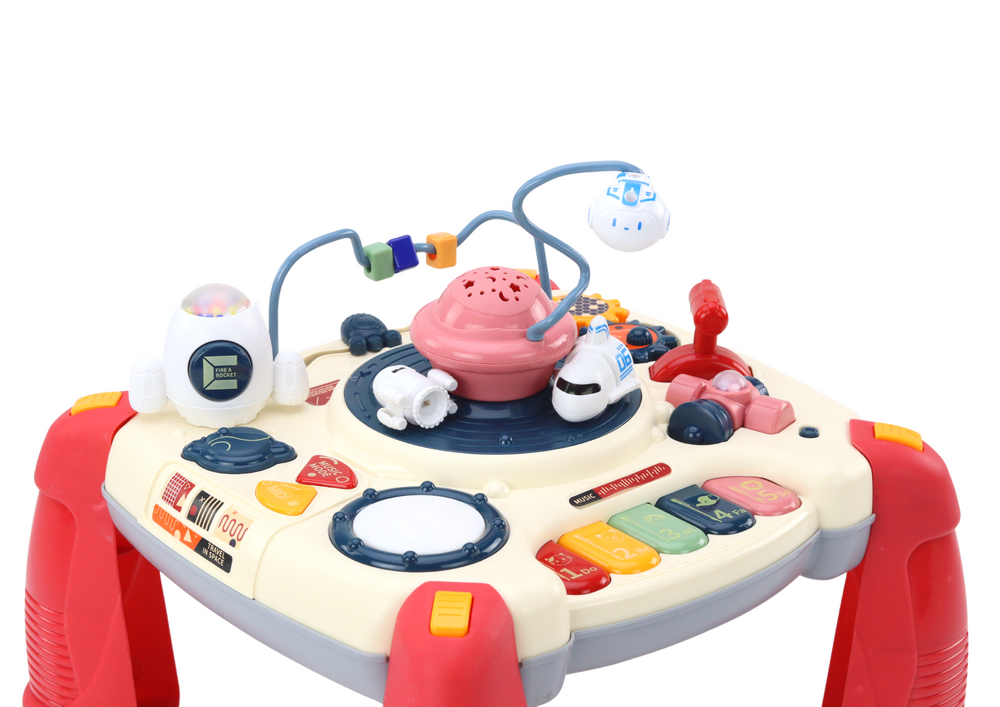 Stalo centre yra žavinga karuselė su kosminiais laivais ir kosmoso vaizdu, trigubas krumpliaratis, leidžiantis vaikams eksperimentuoti su judėjimu ir mechaniniais ryšiais. Skydelyje yra kosminis laivas ant slankiklio, kuris skatina vaikus judėti ir tyrinėti. Tiesiai virš jo yra blokeliai su labirintu ir kliūtimis, kurie lavina motorinius ir loginius įgūdžius. Muzikos valdymo mygtukai ir būgną primenantis mygtukas, atsakingas už garsų grojimą. Skydelyje taip pat yra pianinas, kad vaikai galėtų mokytis abėcėlės ir skaičių.