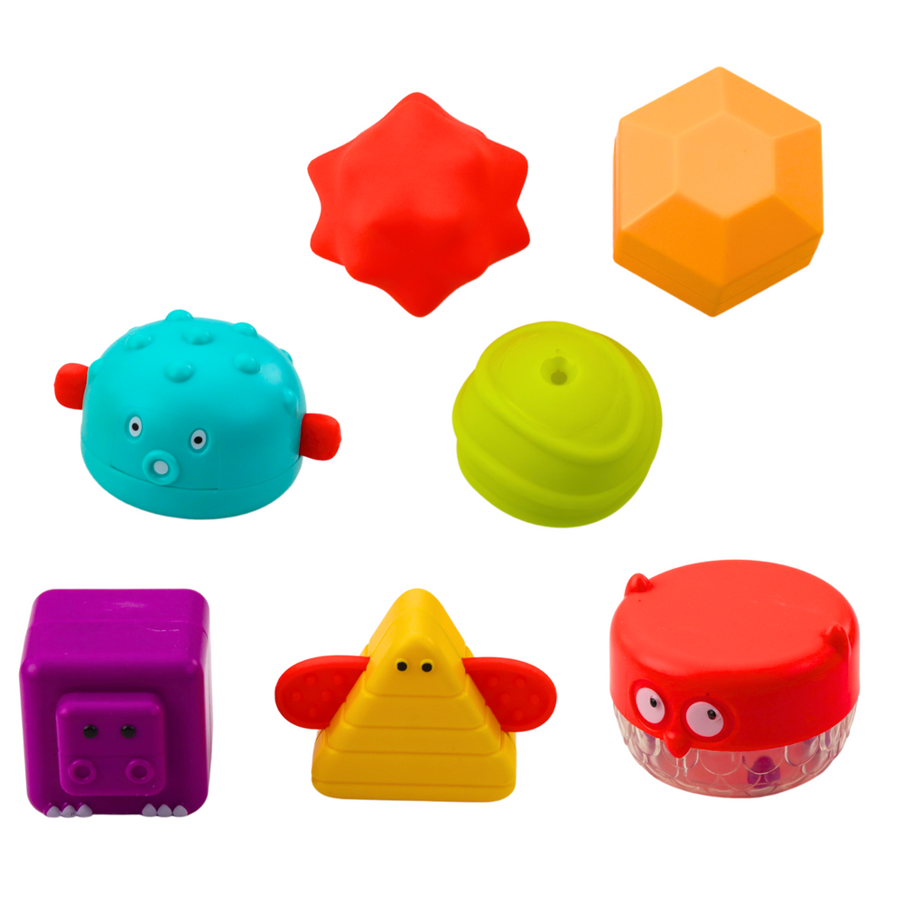 - 7 skirtingų formų ir tekstūrų kaladėlės