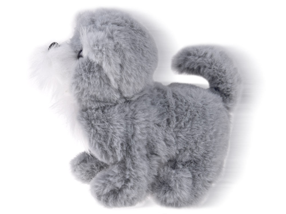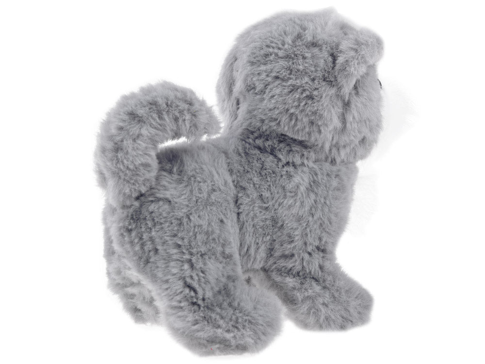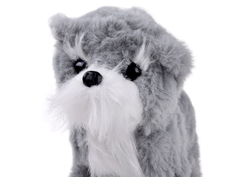 Baltas žavus interaktyvus šuniukas pradžiugins kiekvieną vaiką ir taps geriausiu mielu draugu. Šuniukas turi malonų liesti kailį, rožinę nosytę, mėlynas akis ir juodą apykaklę su baltais taškeliais ir auksiniu ornamentu. Žaislas veikia nuo baterijų. Juos įdėjus, gyvūnėlis loja, vaikšto pirmyn ir atgal, judina galvą, snukutį ir uodegą. Mielas pliušinis šuo pradžiugins kiekvieną pliušinių gyvūnų gerbėją. Žaislas supakuotas į kartoninę dėžutę, todėl puikiai tinka dovanoti.