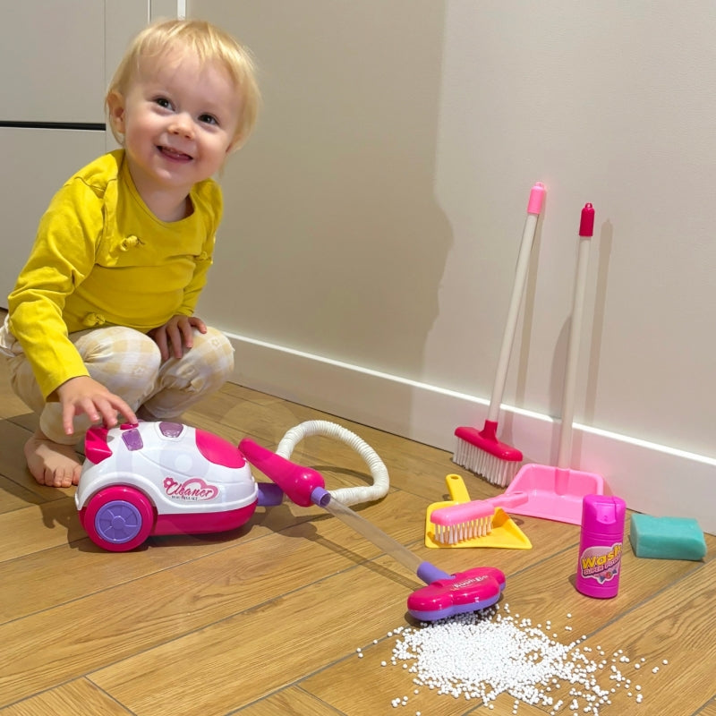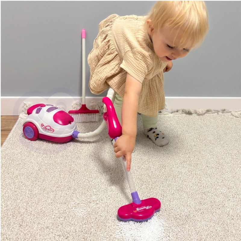Žinomo „Woopie“ prekės ženklo valymo rinkinys su dulkių siurbliu yra idealus pasiūlymas mažiems vaikams, norintiems padėti namuose su kasdieniais tvarkymosi darbais. Siurbimo funkcija ir garsas padarys valymą dar tikroviškesnį ir patrauklesnį. Dulkių siurblys turi reguliuojamą šepetėlį, kurio dėka vaikas siurbdamas gali reguliuoti nuolydžio kampą. Žaislas pagamintas iš aukštos kokybės medžiagų, kurios yra saugios vaikams. Puikiai tinka kaip dovana, padedanti vaikui mėgdžioti savo tėvus.
