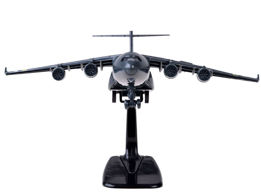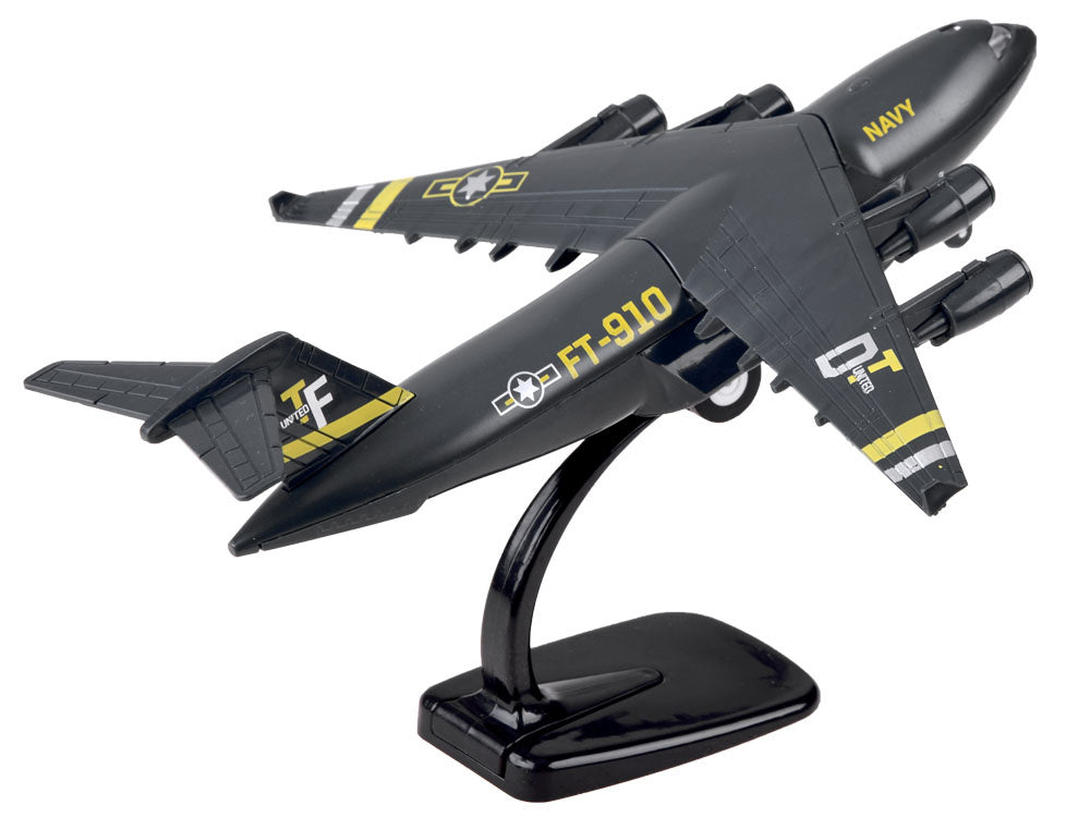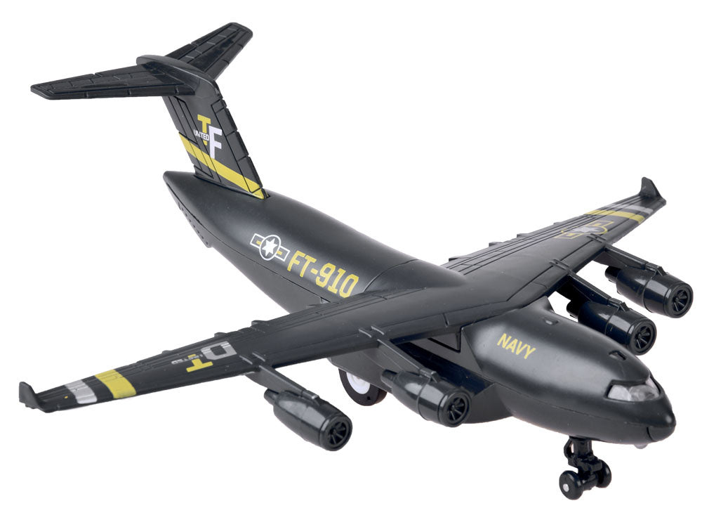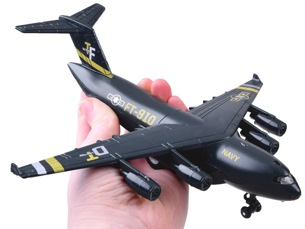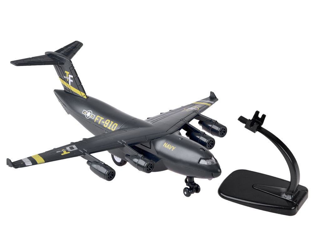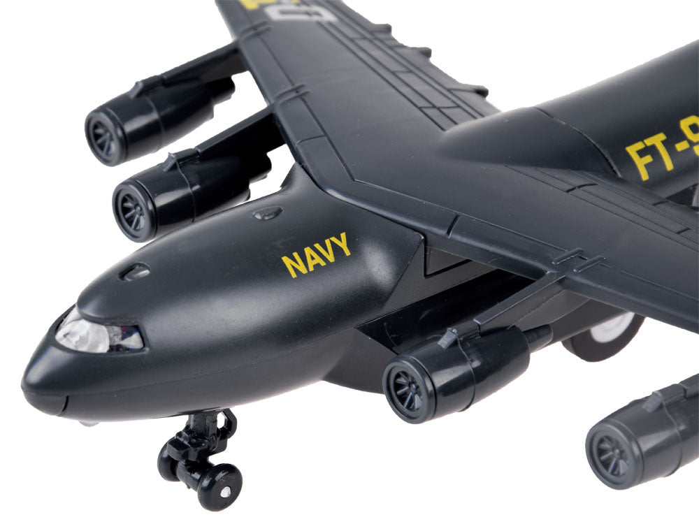 Karinis lėktuvas yra tikras atradimas kiekvienam kariuomenės ir aviacijos gerbėjui. Šis keturių variklių lėktuvas buvo sukurtas specialioms užduotims atlikti. Lėktuvas pagamintas kruopščiai, daug dėmesio skiriant detalėms. Transporteris turi atbulinę pavarą - patraukus žaislą atgal, jis važiuoja į priekį. Prispaudus lėktuvą prie žemės, įjungiamas variklių garsas ir pilotų kabinos apšvietimas. Dėl rinkinyje esančio stovo transporto lėktuvas puikiai atrodys lentynoje kaip kolekcijos dalis arba jos pradžia. Rinkinys supakuotas į estetišką, spalvingą dėžutę, puikiai tinkančią dovanai.