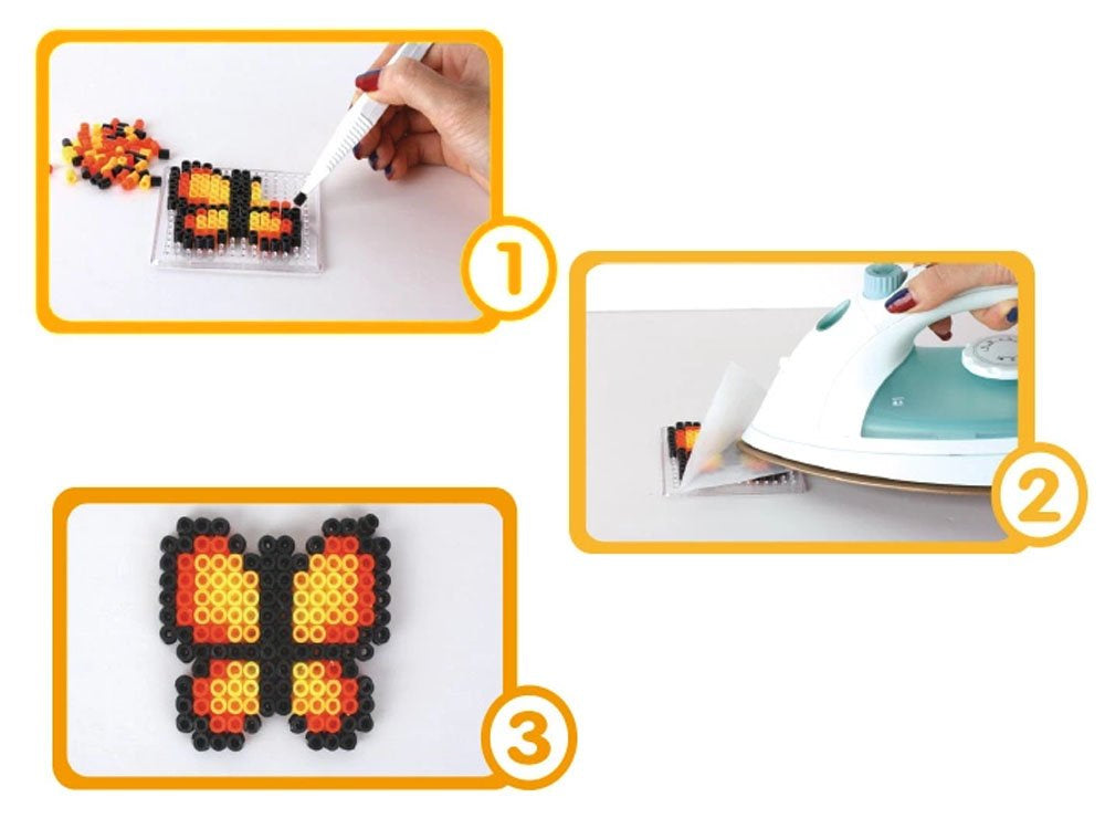 Sudėkite paveikslėlį, tada lygintuvu išlyginkite karoliukus per pridėtą popierių. Padėkite presuotą mozaiką kelioms minutėms po sunkiu daiktu ir paruošta!