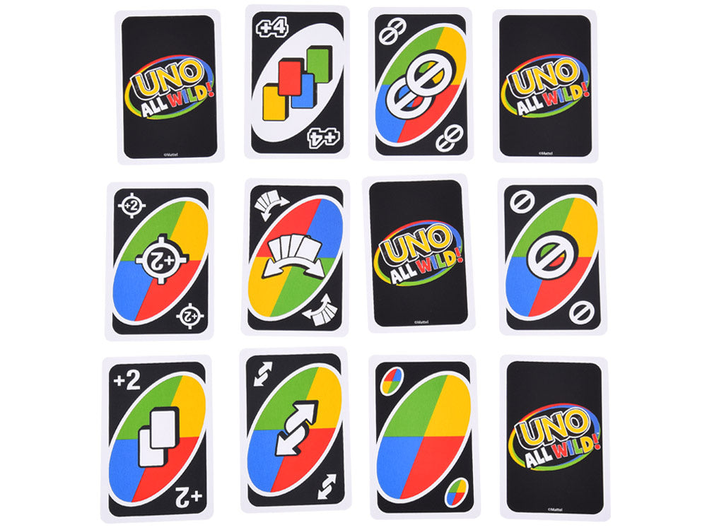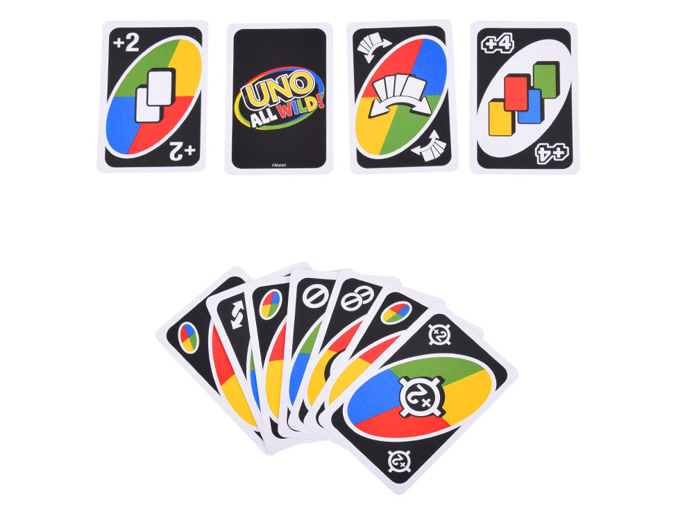 "UNO ALL WILD!" - tai kita pamėgto kortų žaidimo versija. Klasikinėje žaidimo versijoje turite suderinti skaičius arba spalvas, o šiame leidime to daryti nereikia. Žaidime UNO ALL WILD kiekviena korta yra laukinė, todėl žaidimas tampa greitas ir nenuspėjamas. Šis leidimas yra tiek pat įtraukiantis, kiek ir įdomus, ir puikiai tinka žaisti šeimoje, su draugais ar vakarėlyje.