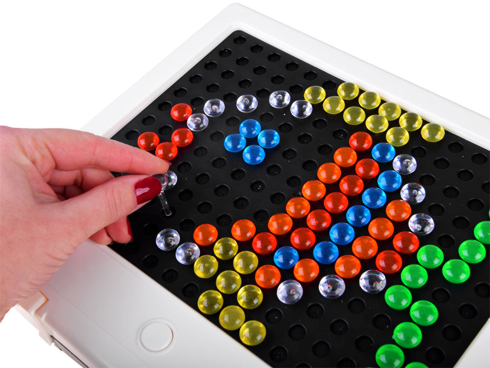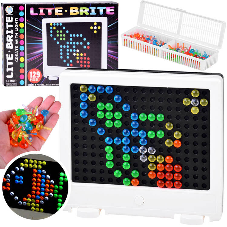 Šviečianti dėlionė su LED lemputėmis ir spalvotais smeigtukais - tai pasiūlymas kiekvienam vaikui, mėgstančiam kūrybines pramogas. Monitoriaus formos juoda lenta su skylutėmis, į kurias pagal savo sumanymą reikia įsmeigti spalvotus smeigtukus. Kūrybinė lenta su spalvotais smeigtukais yra fantastiška idėja kūrybiškai praleisti laisvalaikį.