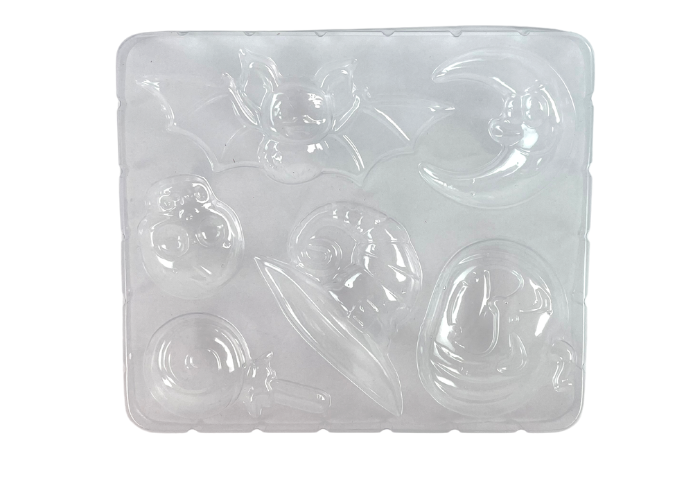 - Kaukolės, moliūgo, mėnulio, šikšnosparnio, saldainio ledinuko ir didelės skrybėlės formos formelėmis