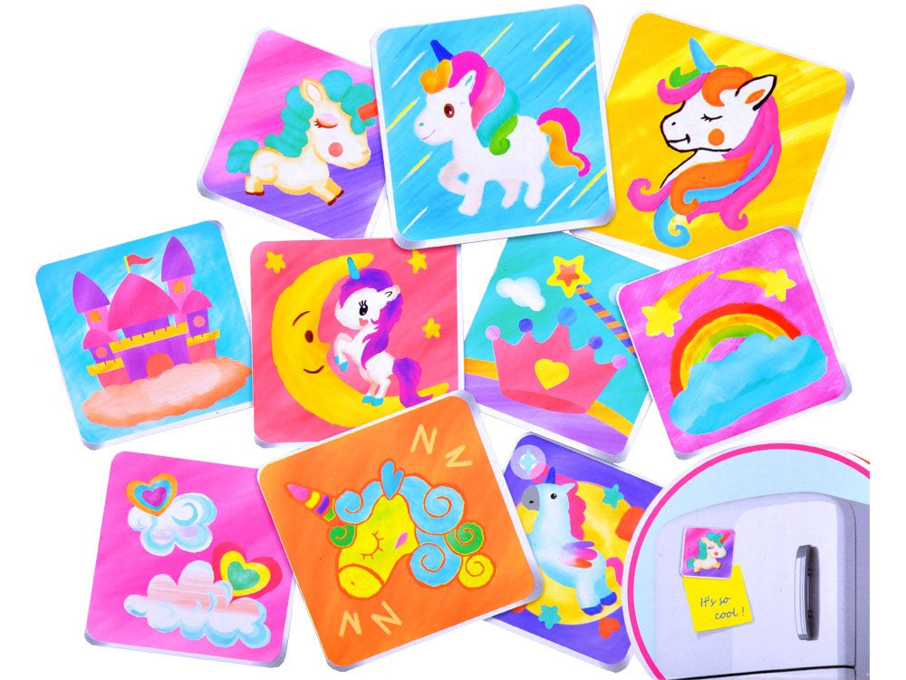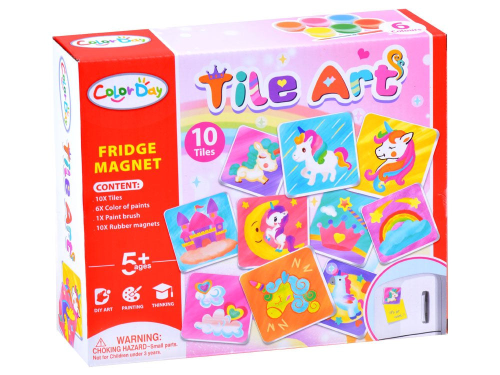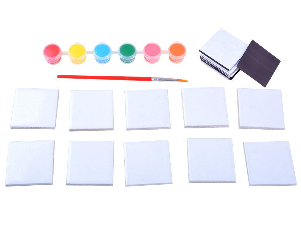 Vaiko kūrybai sukurtas gražių magnetukų rinkinys, galintis puikiai papuošti mūsų šaldytuvą ar lentą. Vaiko užduotis – nudažyti keramines plyteles pagal savo nuožiūrą ir fantaziją bei priklijuoti magnetinę juostelę. Rinkinys leidžia sukurti 10 skirtingų magnetų.