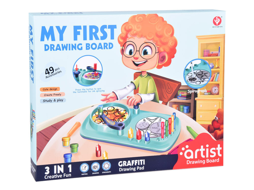 Leiskite savo vaikui tyrinėti meno ir kūrybiškumo pasaulį su interaktyvia piešimo lenta „My First Drawing Board“. Šiame unikaliame 3 in 1 rinkinyje galima smagiai piešti, tapyti grafičius ir kurti nuostabius piešinius su spirografu. Tai puikus rinkinys visiems, kurie mėgsta kurti ir išreikšti savo kūrybiškumą. Su šiuo kelių dalių rinkiniu jūsų vaikas gali lengvai sukurti begalę unikalių, spalvingų raštų ir piešinių.