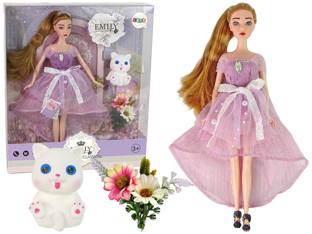 Pristatome žavią Emily ilgų šviesių plaukų lėlę. Ši graži lėlė aprengta ilga suknele, kuri džiugina žvilgančiomis rožinėmis detalėmis, dekoratyviniais perlais ir lankeliais. Ant galvos ji dėvi elegantišką tiarą, o ant kojų - juodus, stilingus batelius kulnu su subtilia rože, kuri suteikia dar daugiau žavesio.