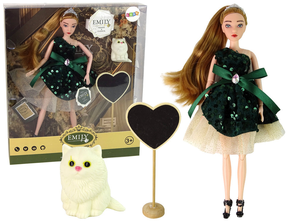 Žavinga lėlė Emily ilgais šviesiais plaukais dėvi elegantišką žalios spalvos suknelę, papuoštą žaliais blizgučiais ir lankeliu. Jos plaukus, surištus į kuodelį, puošia diadema, o žalios akys suteikia jai žavesio. Lėlė turi judančias galūnes, todėl juda tikroviškai.