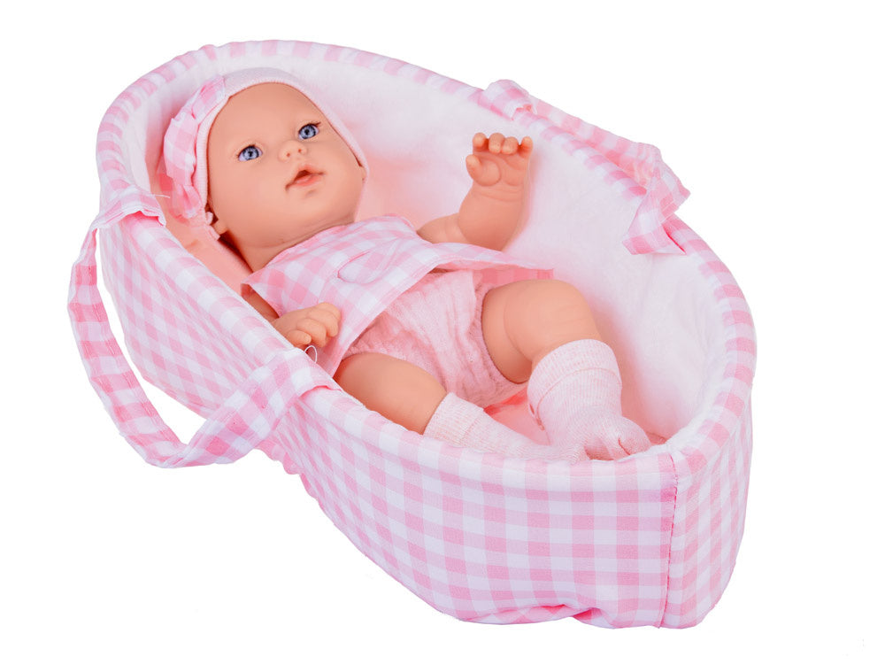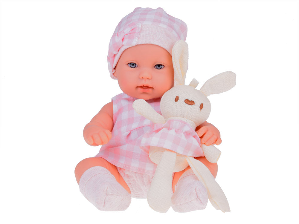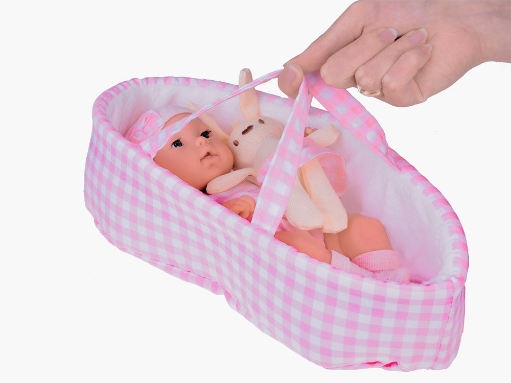 Lėlė kūdikis su gultuku ir triušeliu, rožinis
