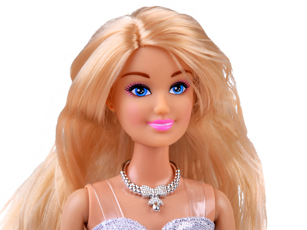 Anlily Lėlė ilgais šviesiais plaukais - tai pasiūlymas kiekvienam mažam vaikui, besidominčiam mada. Lėlė turi ilgus šviesius plaukus. Ji vilki elegantišką suknelę su sidabriniu korsetu, ant kaklo segi gražų sidabrinį vėrinį, o ant kojų avi elegantiškas sidabrines basutes su aukštu kulnu.