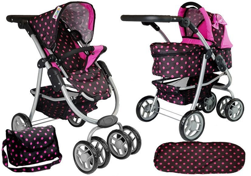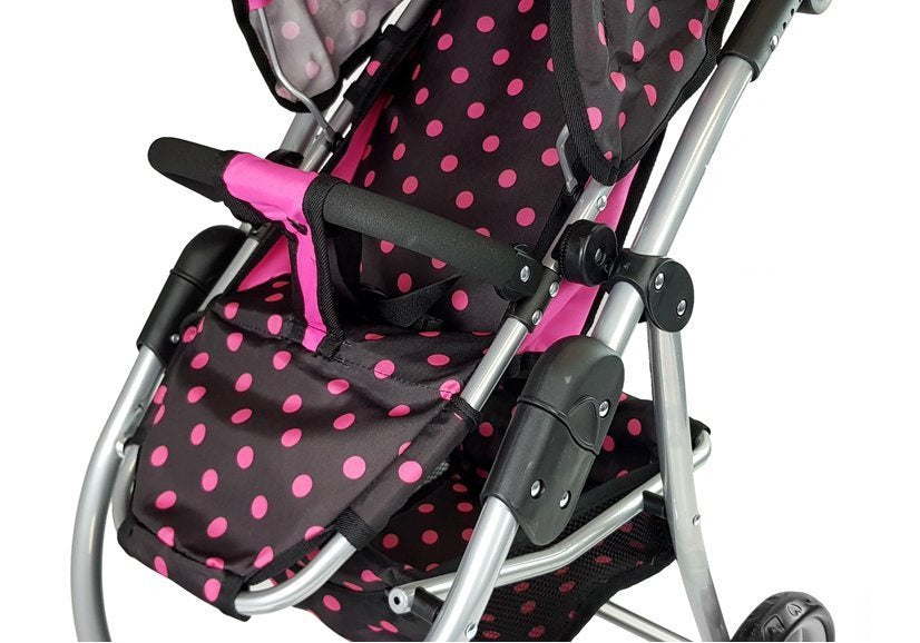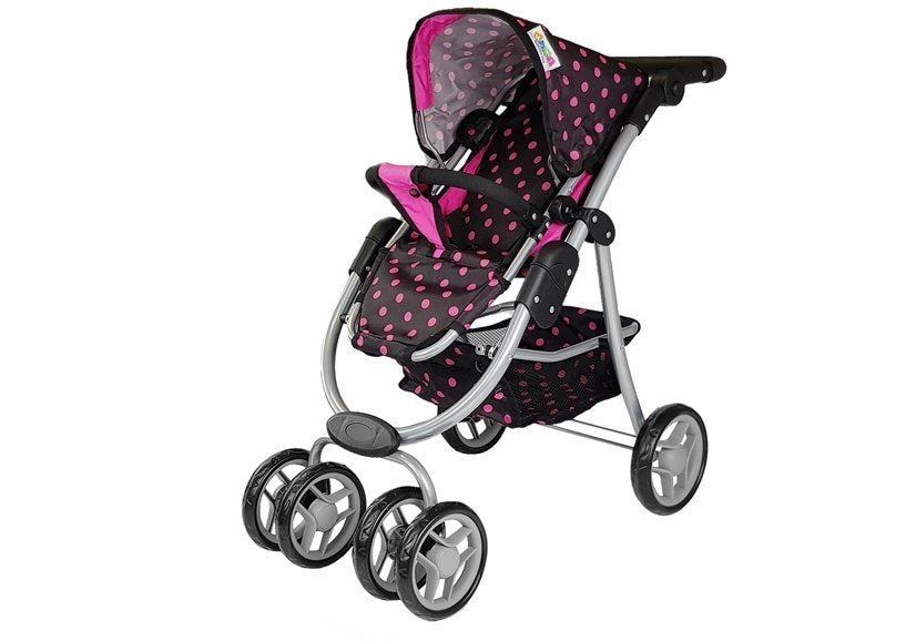 Žaislinis lėlių vežimėlis su juodais ir rožiniais taškeliais kaip mat patiks jūsų vaikui ir jo lėlei! Žaisti ne tik smagu, bet ir patogu, nes vežimėlio ratai skirti važiuoti bet kokiu keliu ir be jokių sunkumų!