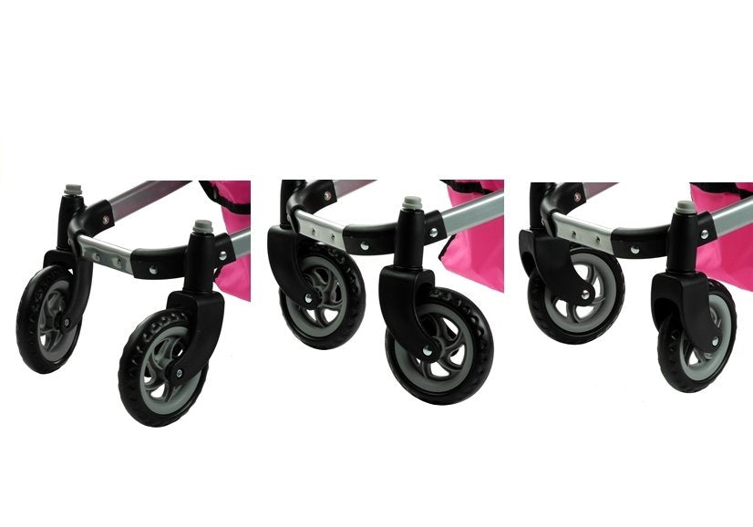 Ryškios spalvos vežimėlis papuoštas rožiniais žirneliais, kurios jam suteikia daug žavesio. Vaikiškas vežimėlis tikrai sudomins ir paskatins žaisti kiekvieną vaiką. Vežimėlis tiks visoms lėlėms ir žaislams, o dėl didelių vežimėlio matmenų jame lengvai tilps keli žaisliniai keleiviai. Vežimėlis yra lengvas, manevringas ir patogus.
